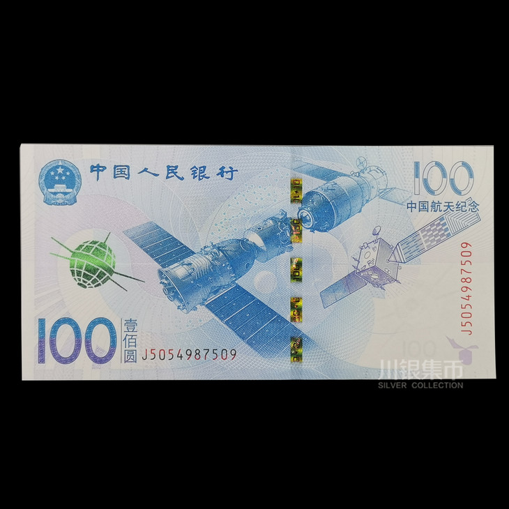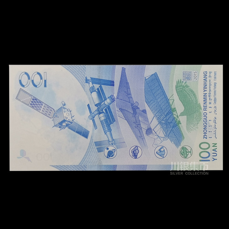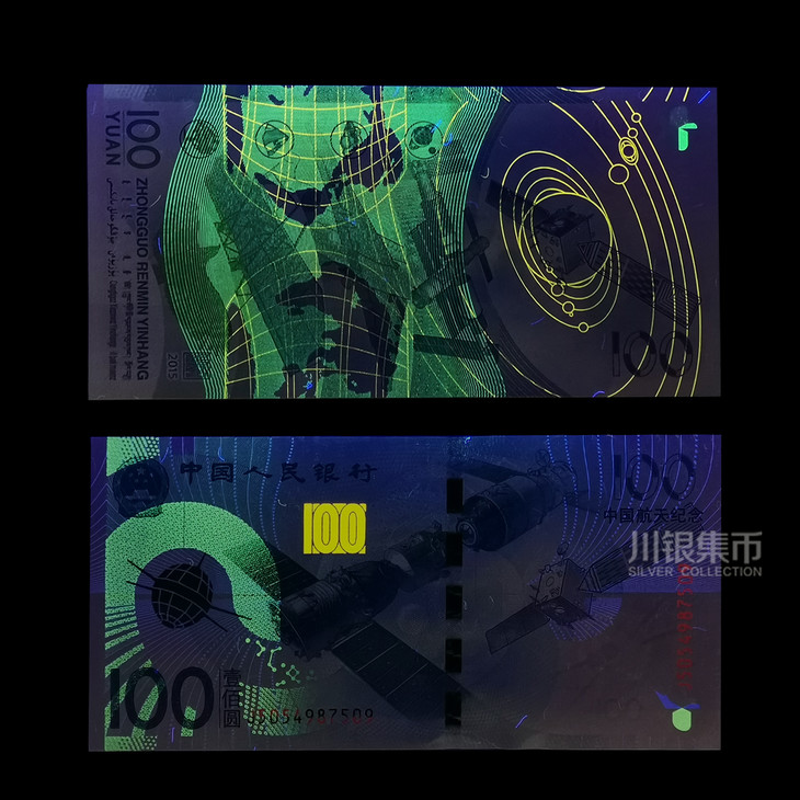 中国人民银行于2015年11月26日发行中国航天纪念钞一张,中国航天普通纪念币一枚。中国航天纪念钞面额为100元,票面长为155毫米,票面宽为77毫米,发行数量为3亿张。与现行流通人民币职能相同,与同面额人民币等值流通。纪念币面额为10元,直径为27毫米,材质为双色铜合金,发行数量为1亿枚。与现行流通人民币职能相同,与同面额人民币等值流通。