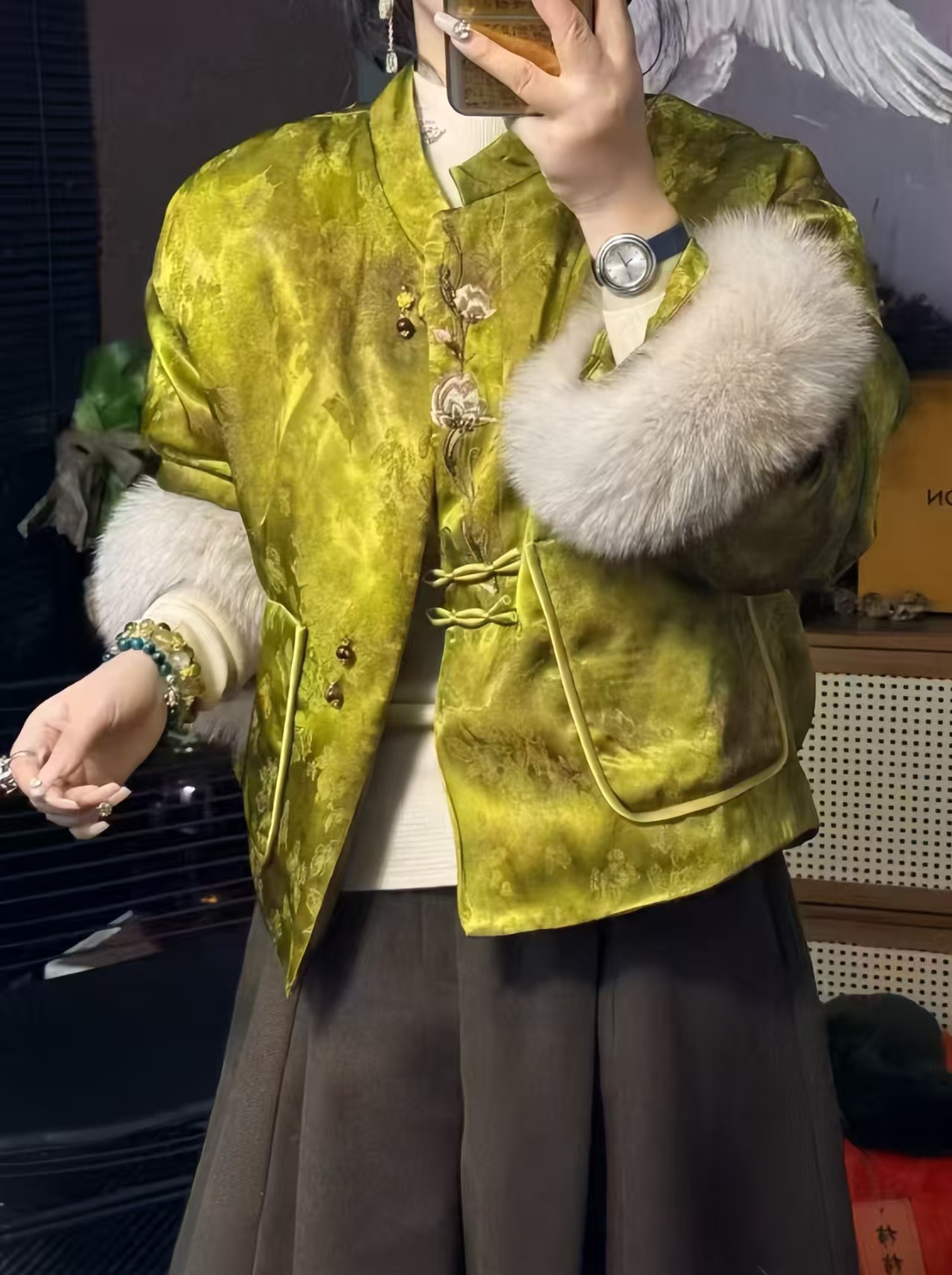 国风刺绣盘扣羽绒服外套 高级提花缎面雅致且富有光泽,花纹细腻如艺术品