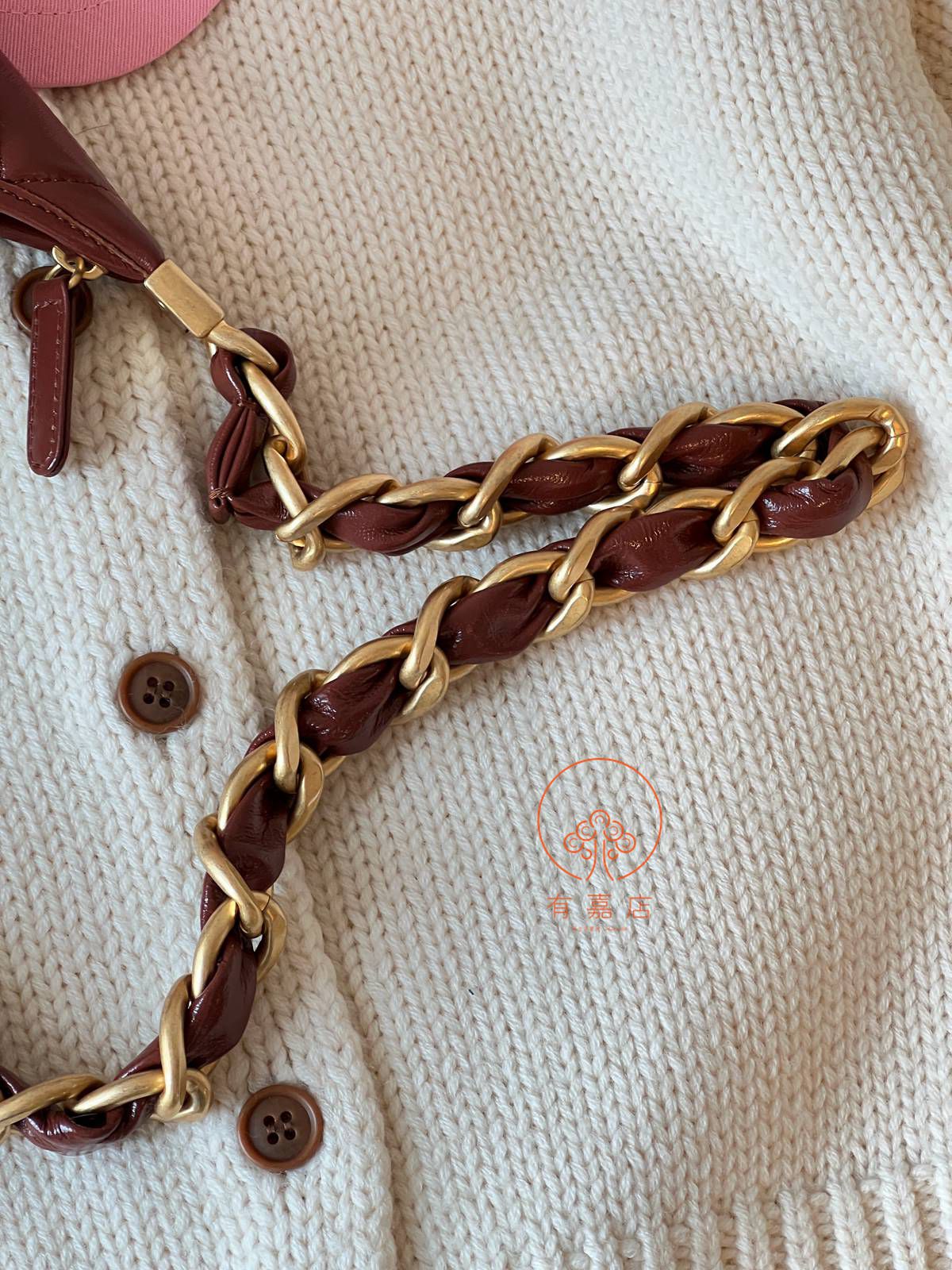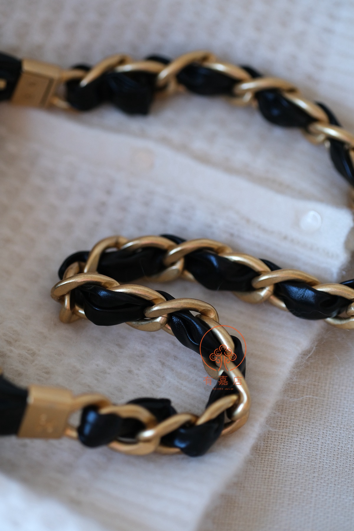 五金厚金真金电镀加做旧处理,做旧效果非常自然,虽然视觉上是粗粗重重的链条,实际轻巧不压肩(柜品也是一样重量)。