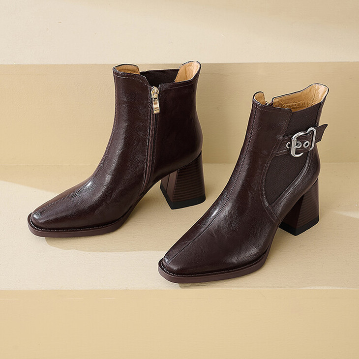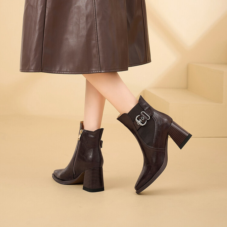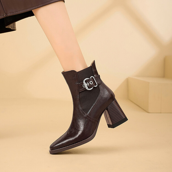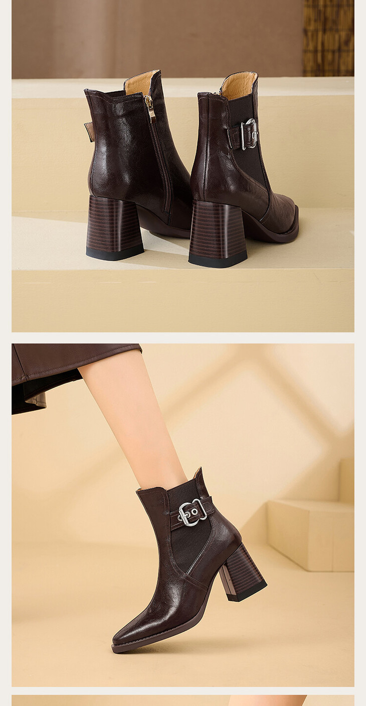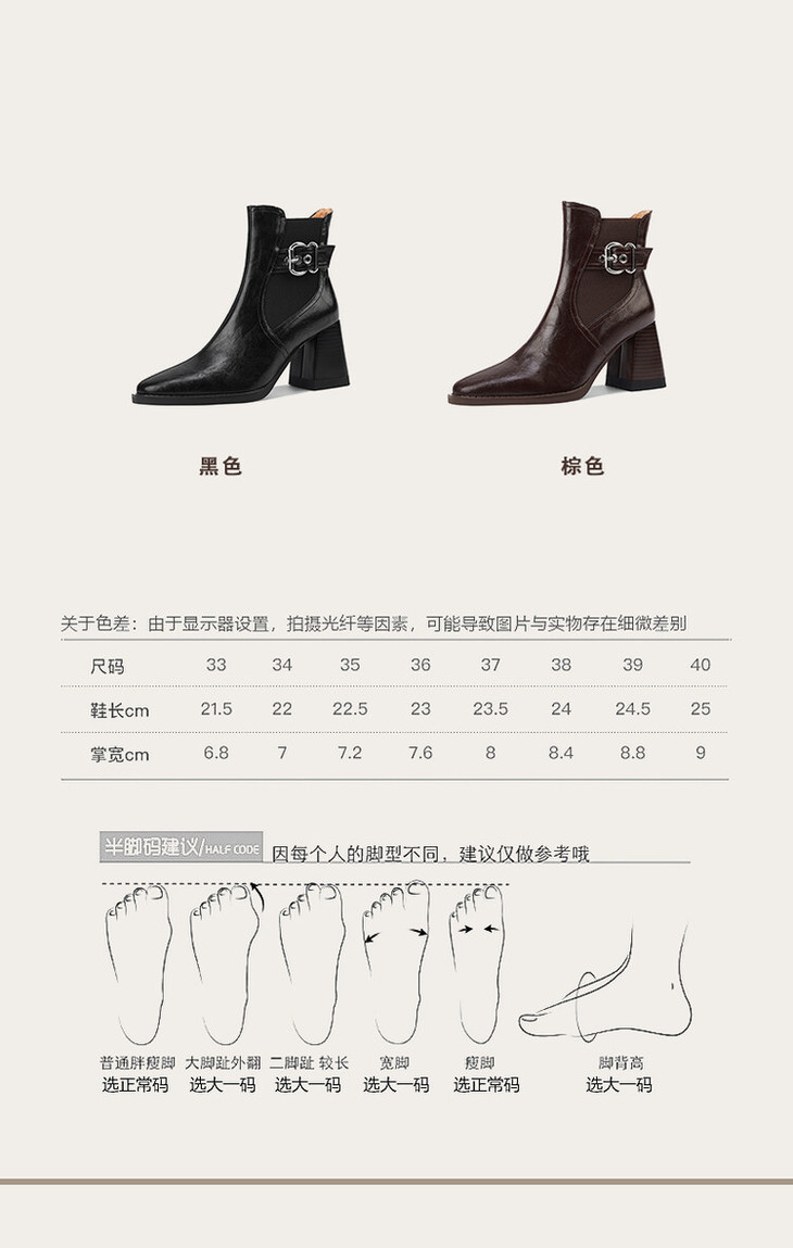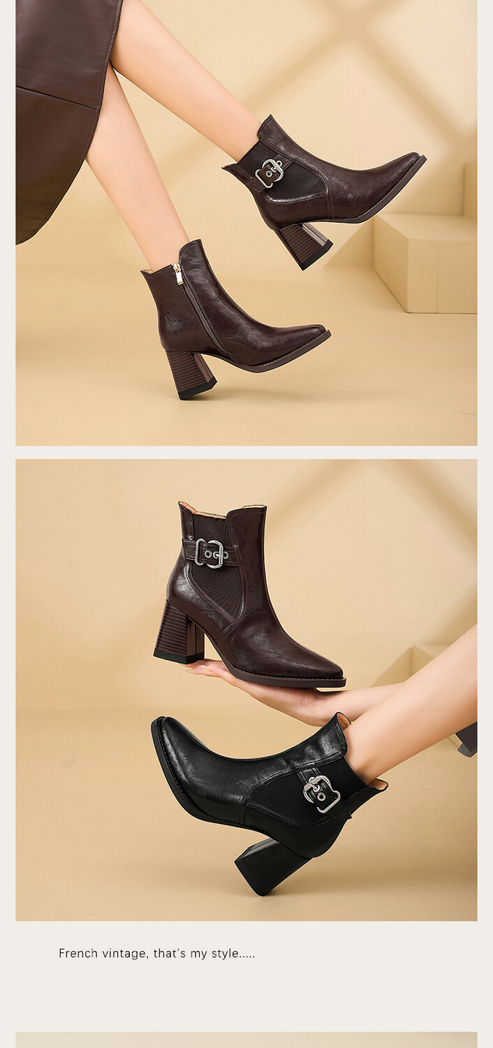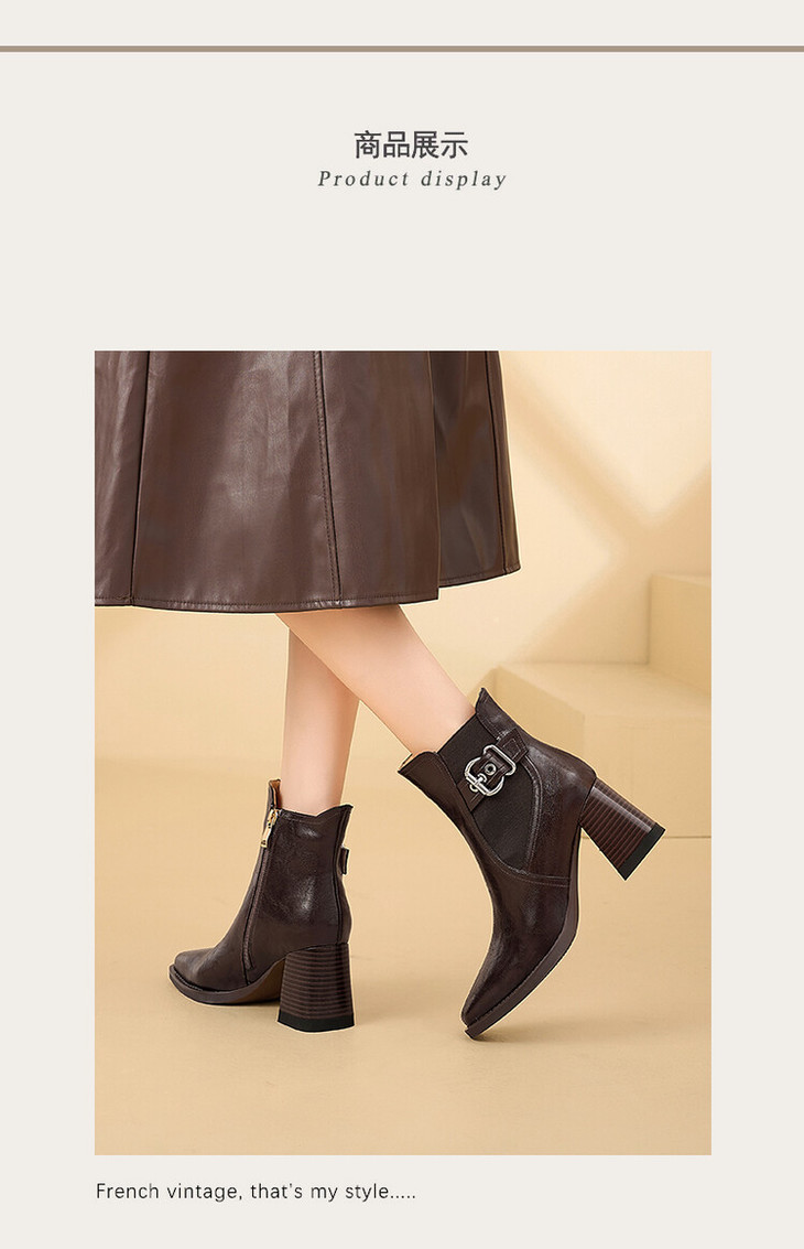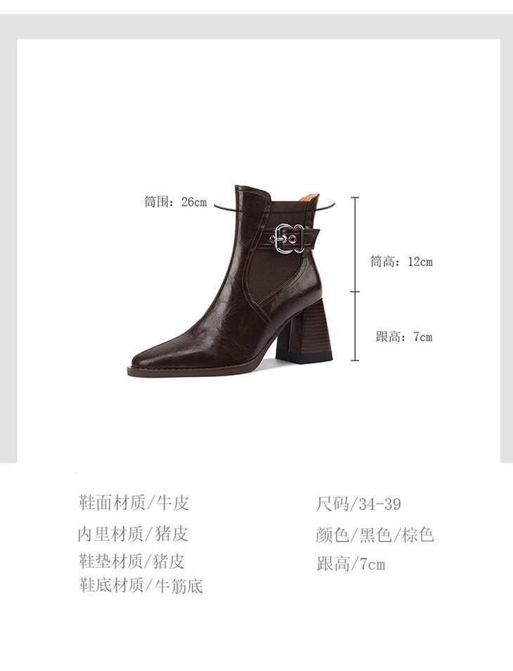 【预售5天】复古棕色大码法式小短靴女粗跟新款秋冬尖头高跟靴子女马丁靴XME&898-137