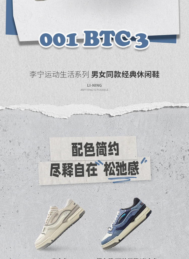 李宁001 BTC 3 "扎西"故事色男女同款经典休闲鞋AGCV281