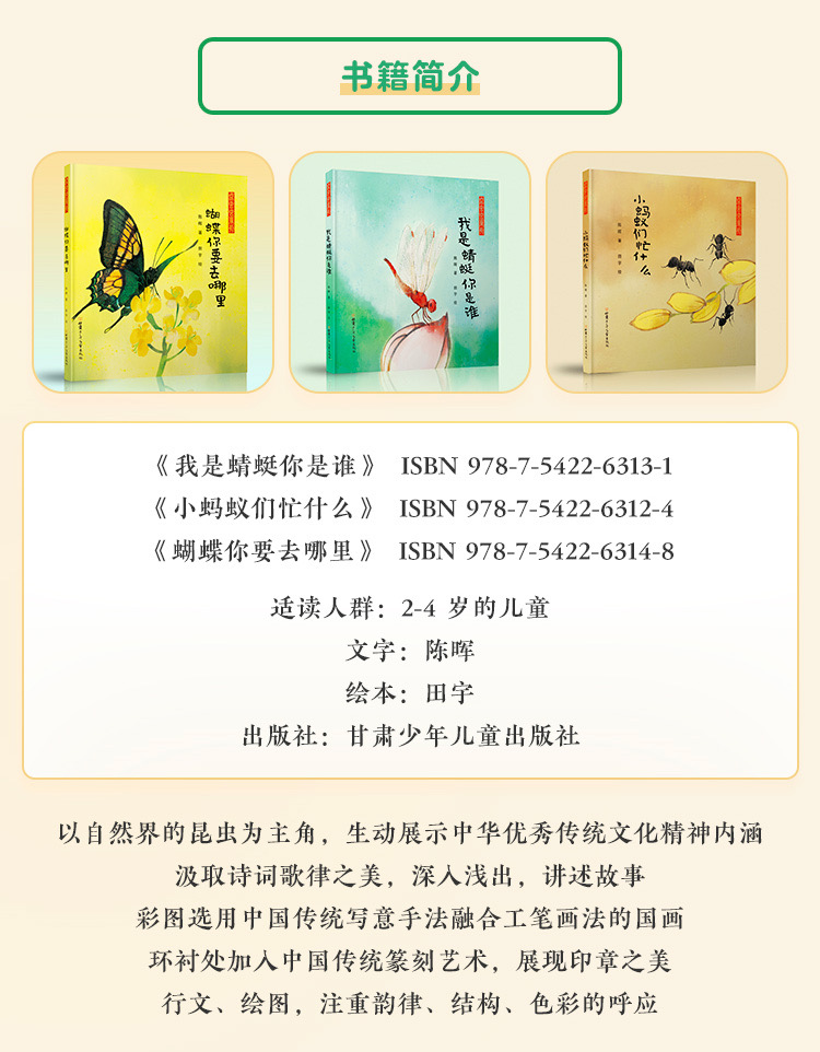 这本书用疑问句式首尾呼应,通过生动有趣、充满节奏感的文字,突出了蜻蜓、螳螂、七星瓢虫、蜜蜂等昆虫的外形特点,引导幼儿观察昆虫,认识昆虫,亲近自然。