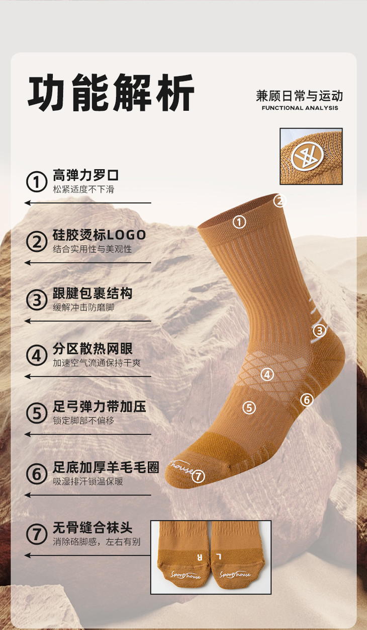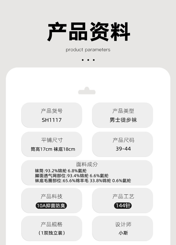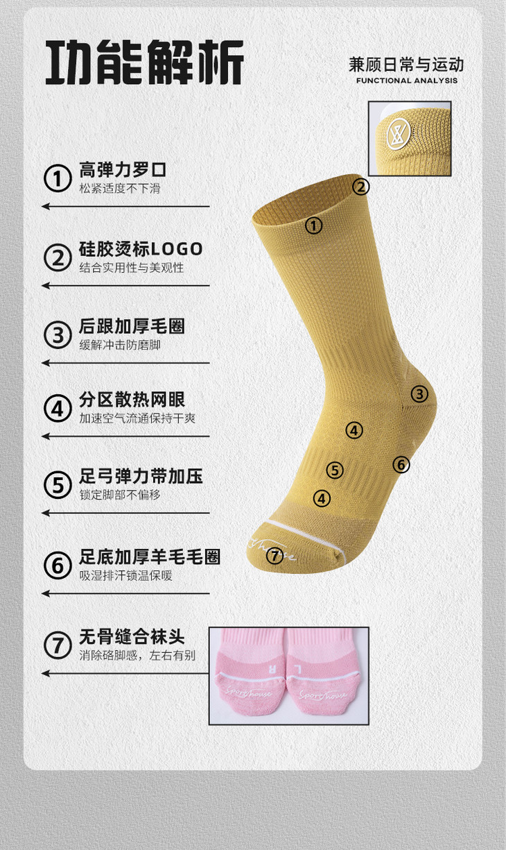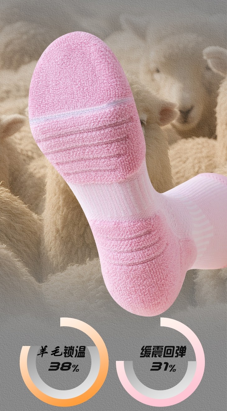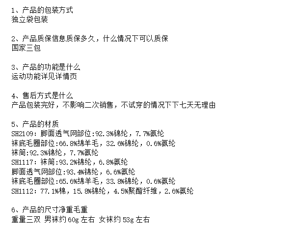 袜底毛圈部位:65.6%绵羊毛,33.8%棉纶,0.6%氨纶