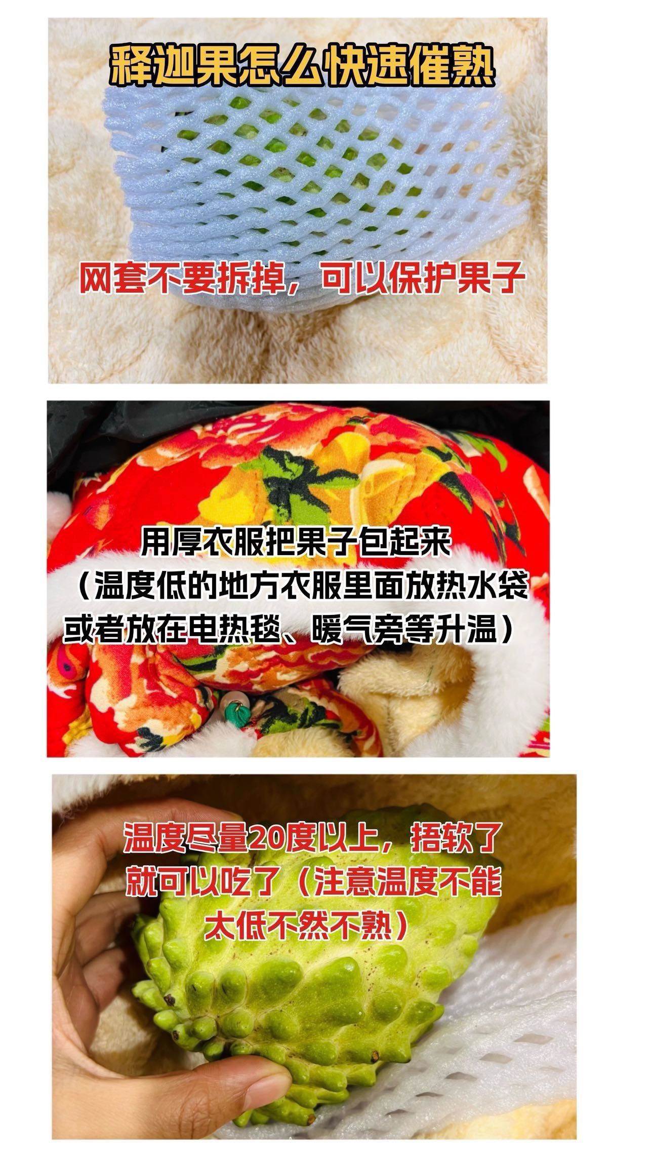 ①释迦果成熟后可能会自然开裂,果皮局部变黑变软时口感较好,未成熟变软的请勿放入冰箱储存也请不要切开食用。