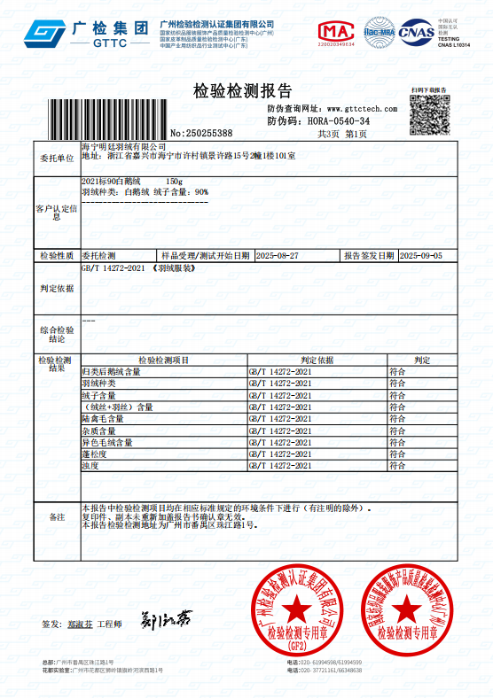 面料A:100%桑蚕丝 面料B:100%聚酯纤维 胆布:100%聚酯纤维 填充物:90白鹅绒(绒子含量88%)以上 充绒量:M码,120g;L码,125g;XL码,130g;XXL码,135g