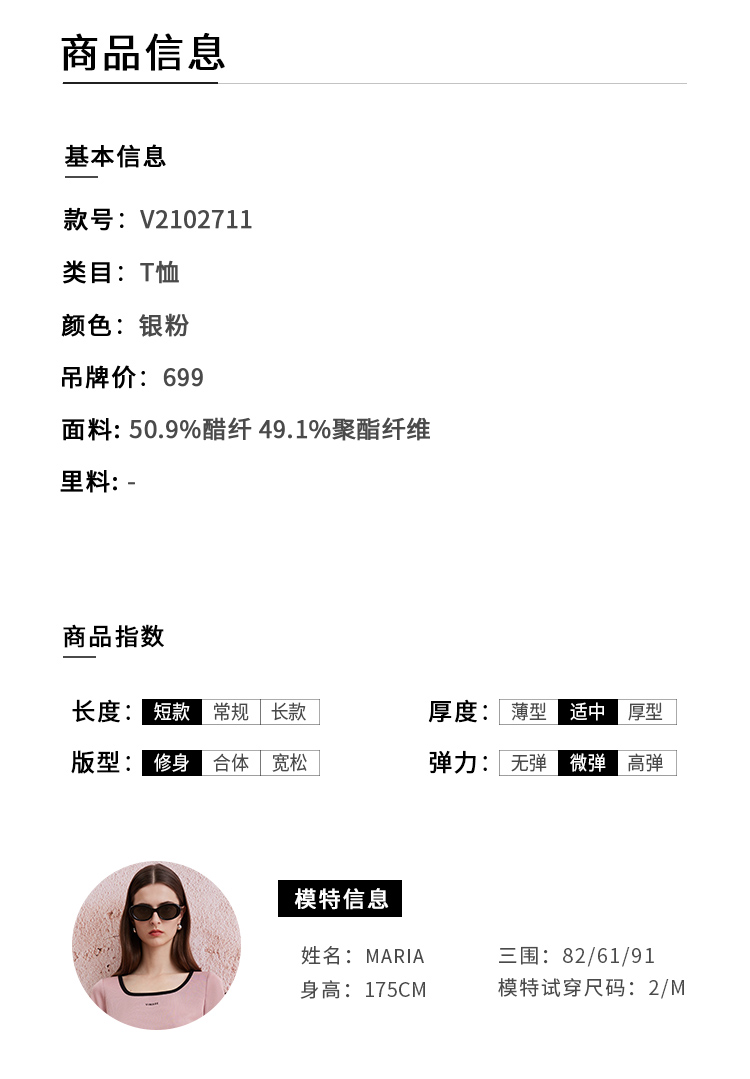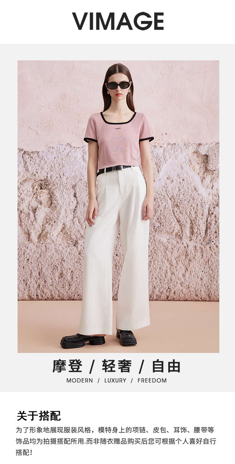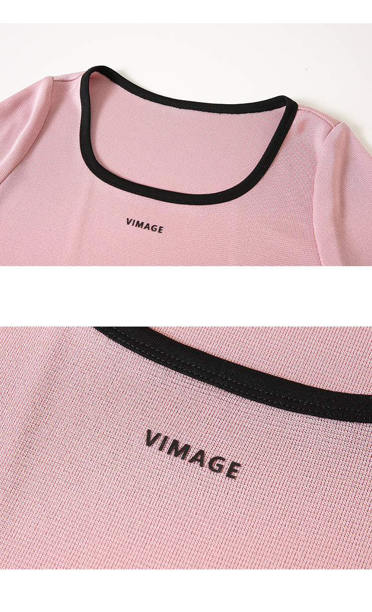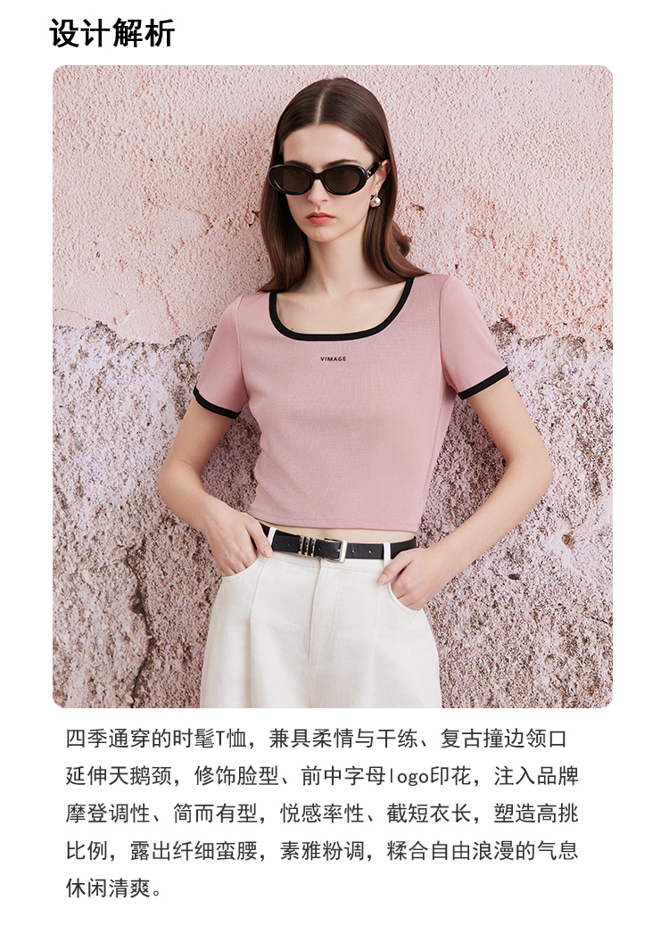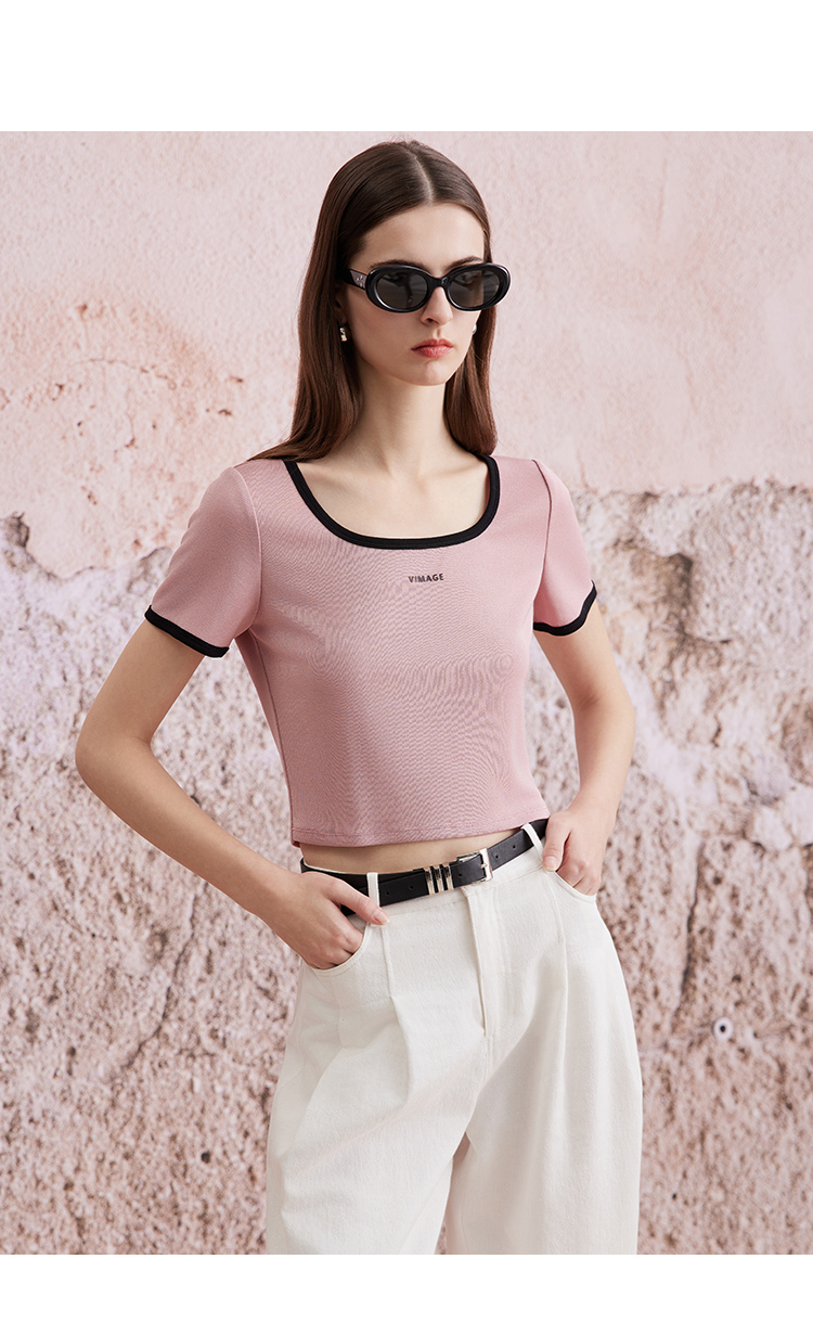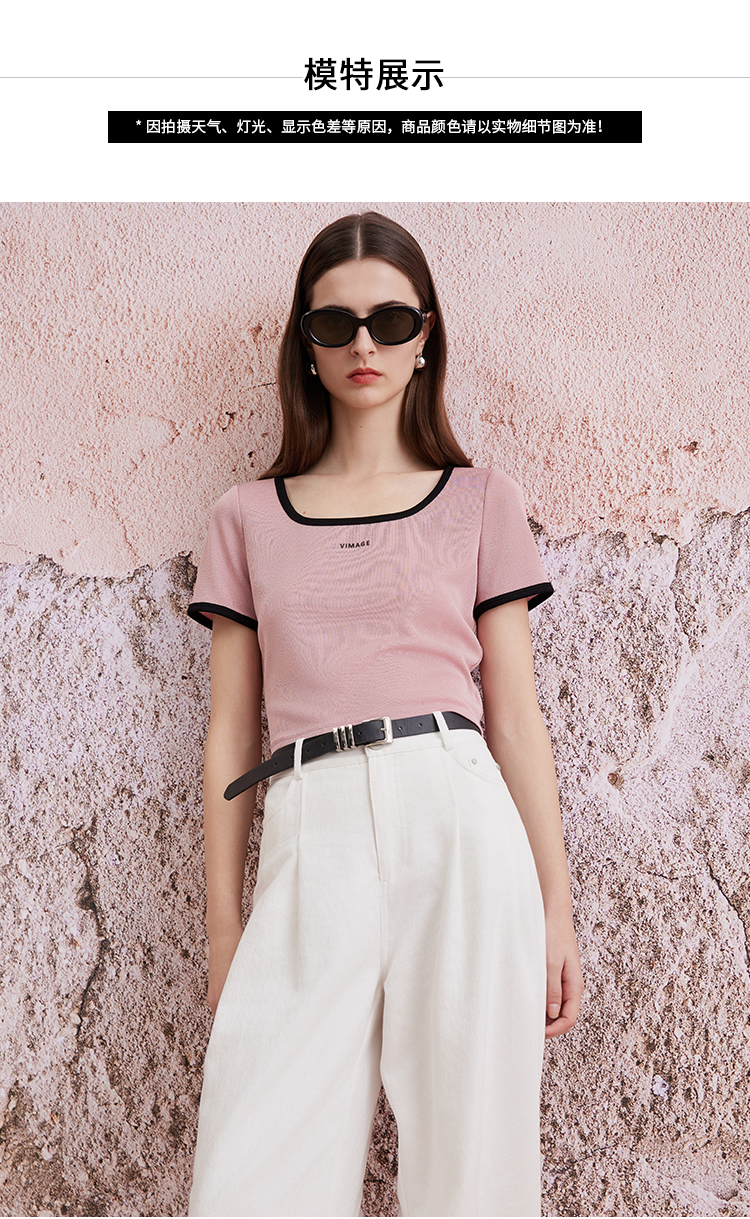 VIMAGE纬漫纪夏季新款百搭通勤方领撞色短款T恤上衣V2102711