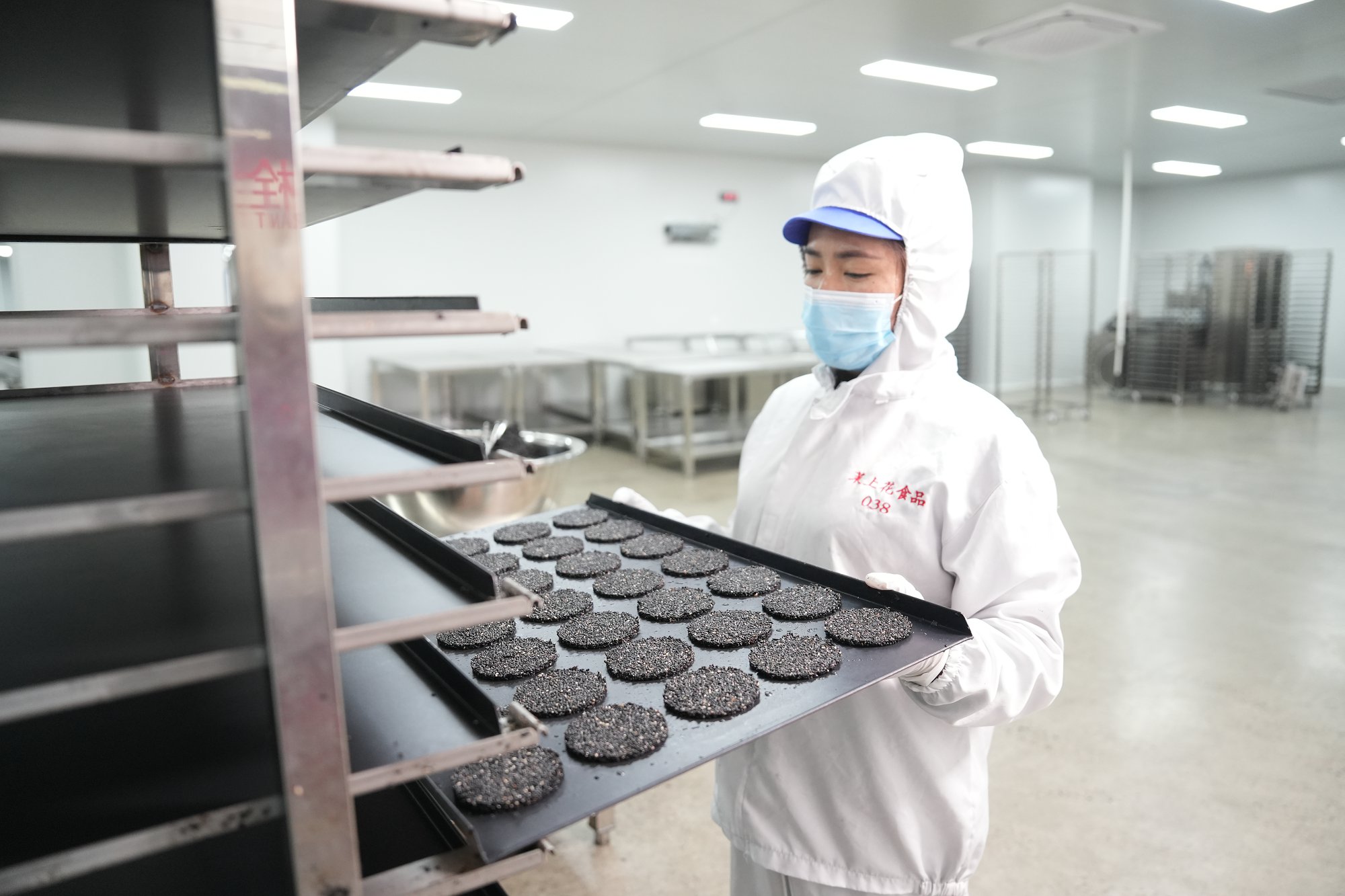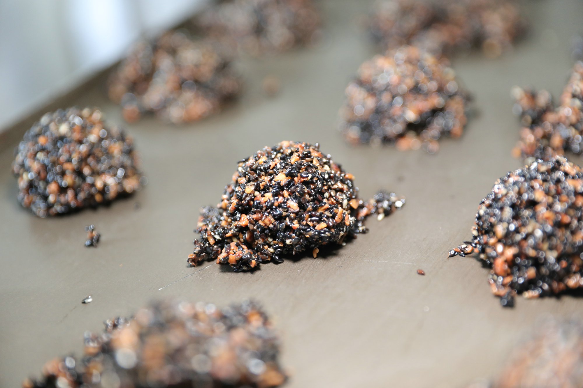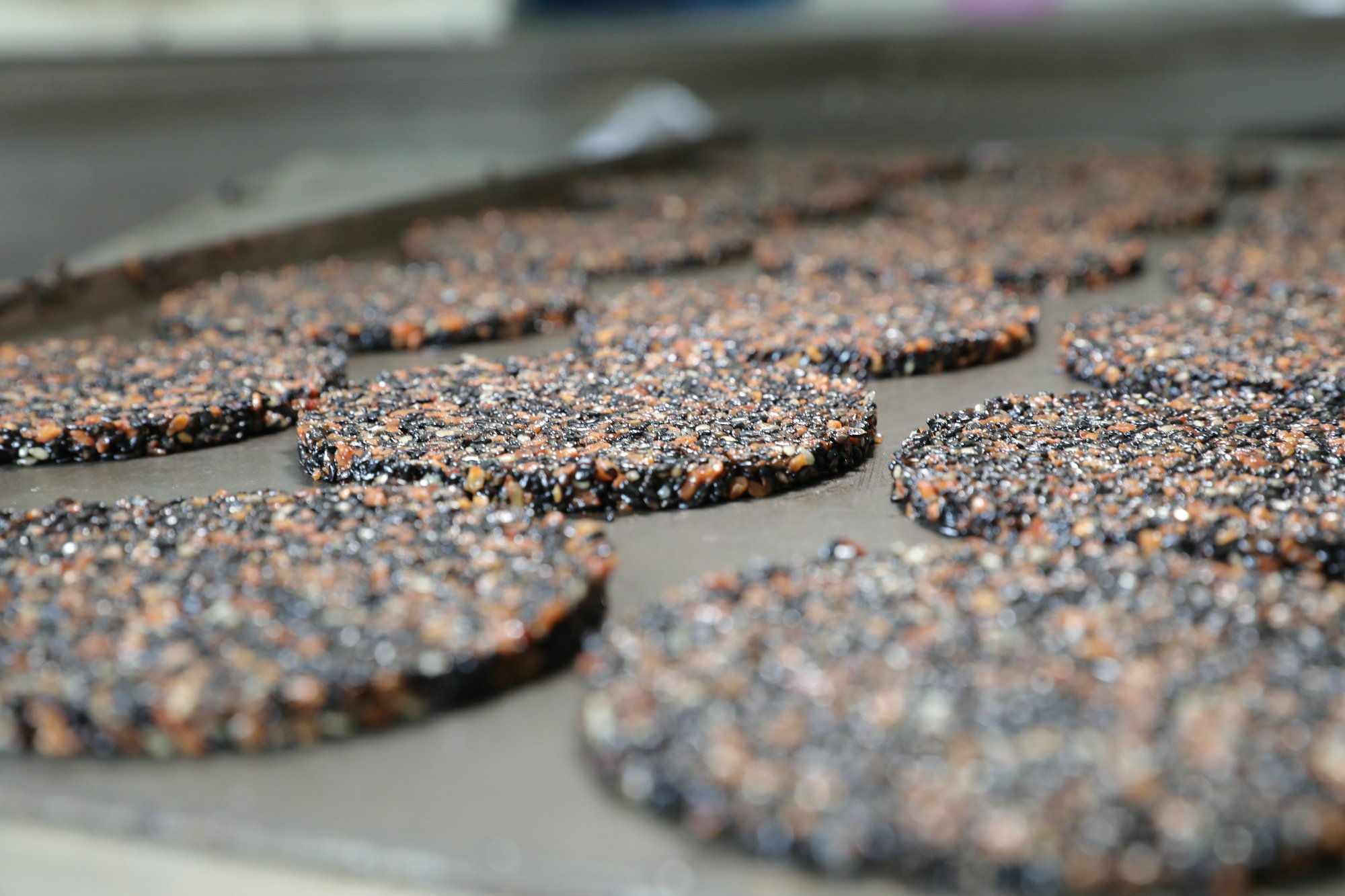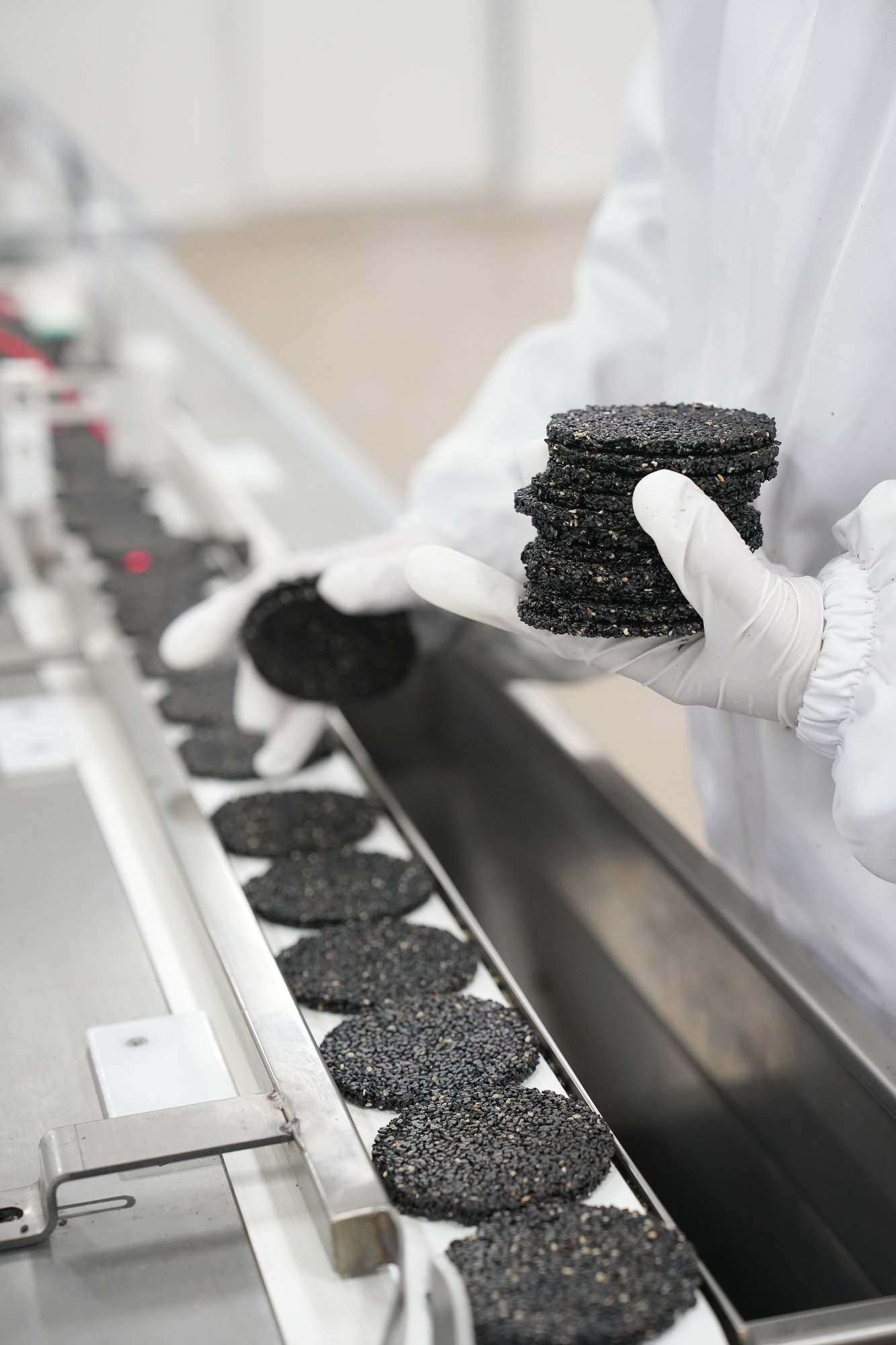 将粘合好的芝麻饼放入烤箱中,通过精确温控去掉水分,几个小时后即可出炉。
