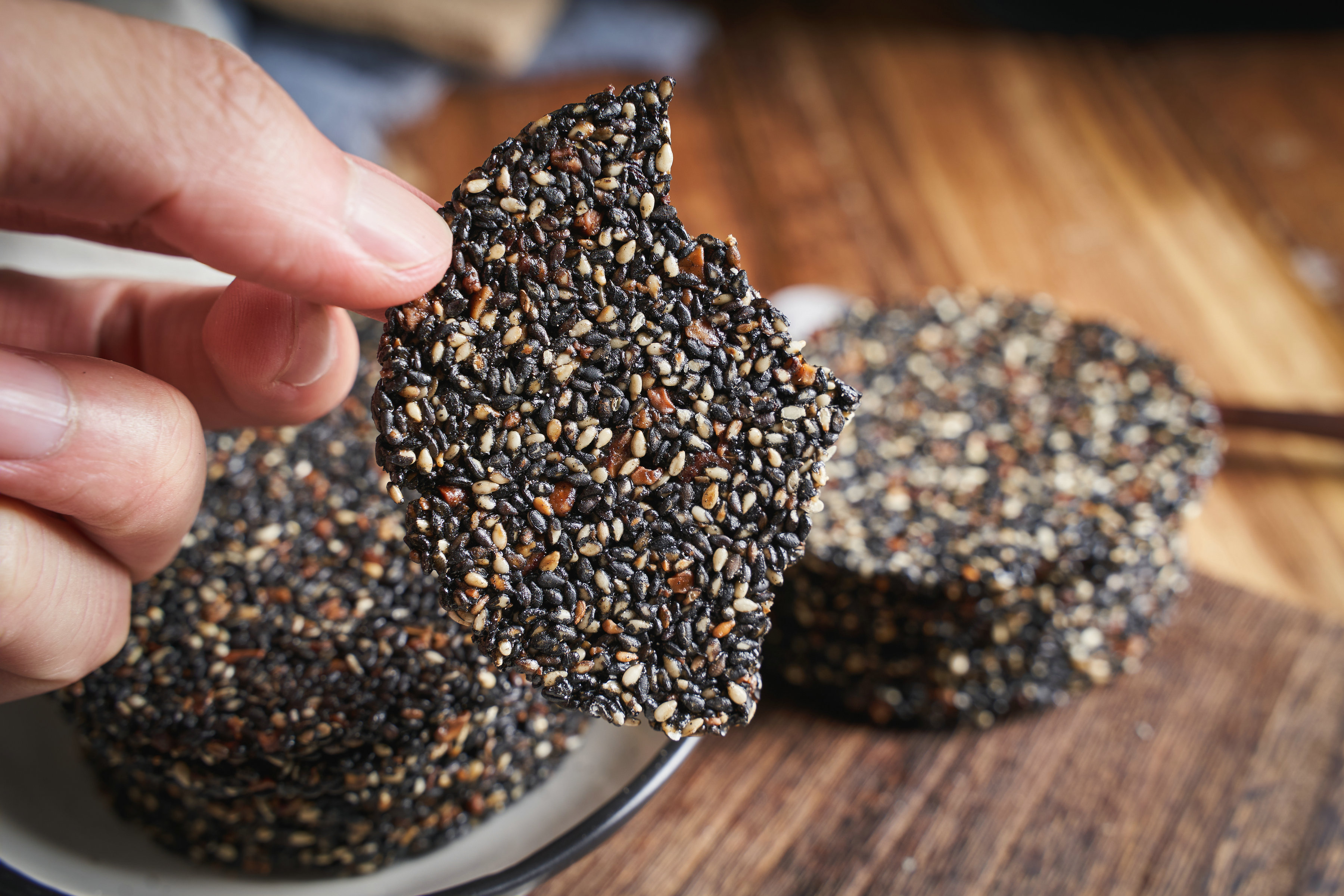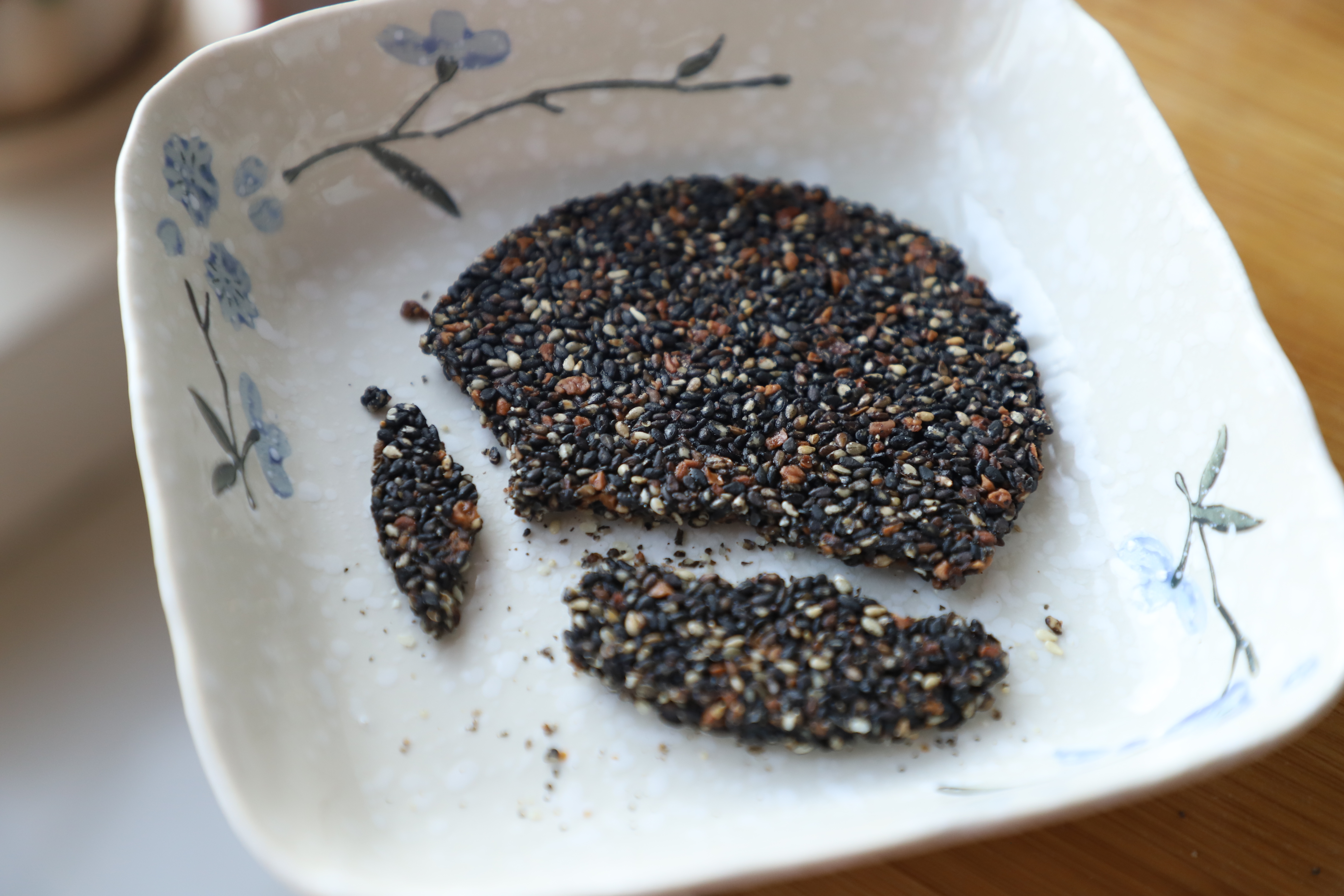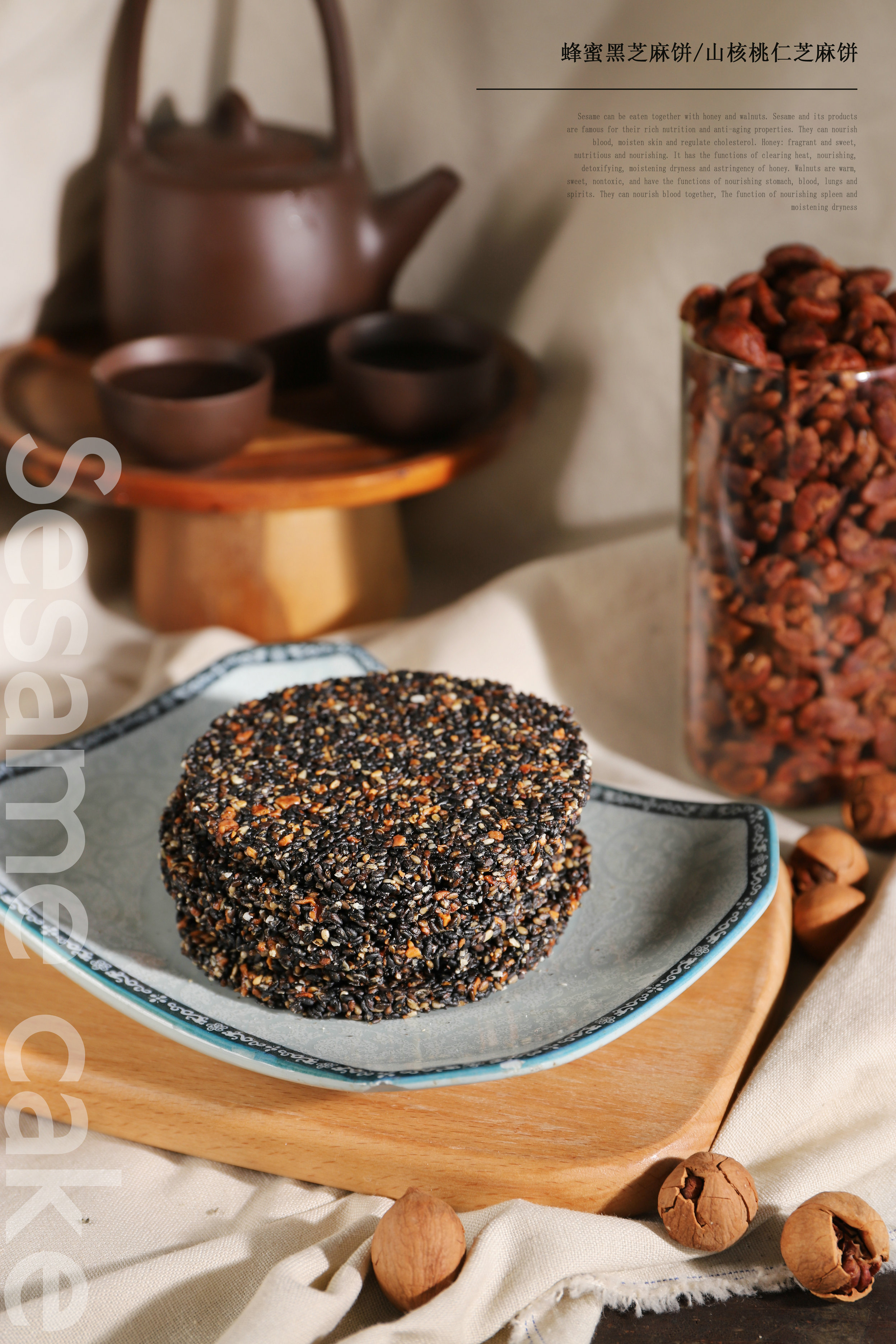 山核桃芝麻饼(黑芝麻75%、山核桃仁15%、蜂蜜5%、鲜鸡蛋5%)