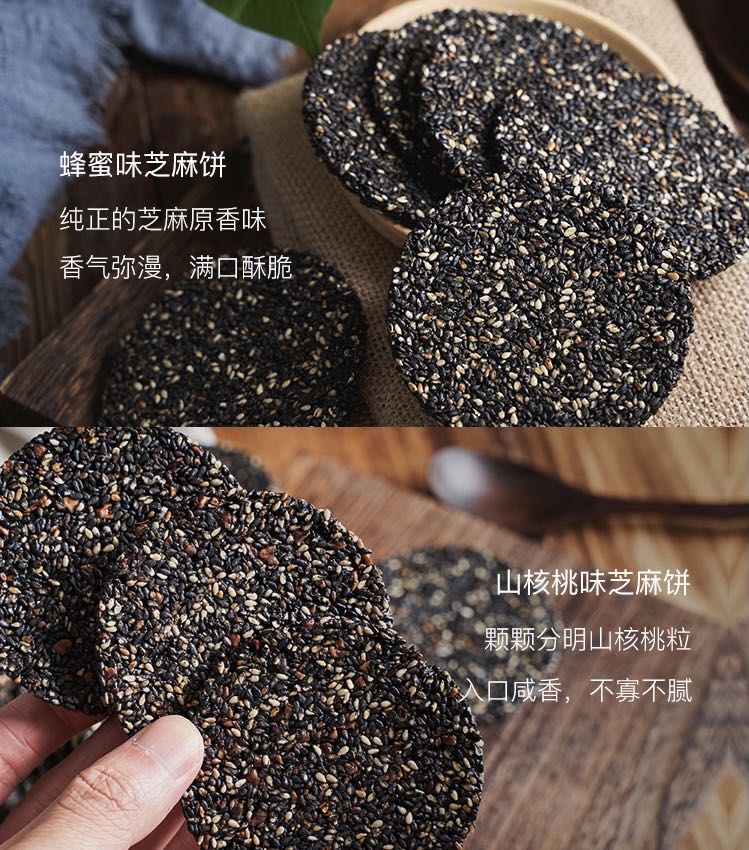 芝麻饼不但健康营养而且好吃,黑芝麻的香、蜂蜜的甘甜、鸡蛋的鲜美,杂糅其中,再配以15%以上的山核桃仁,酥脆醇香,极大的丰富了口感,每一次入口,都是理想中的体验,好吃又养人,是一款超棒的食养“黑零食”。