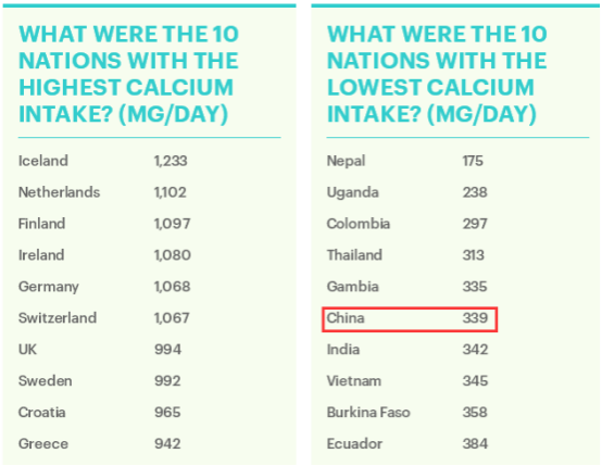 在有数据的74个国家和地区中,中国大陆居民每日膳食钙摄入量排名倒数第六,仅为339毫克,不足推荐量的一半。