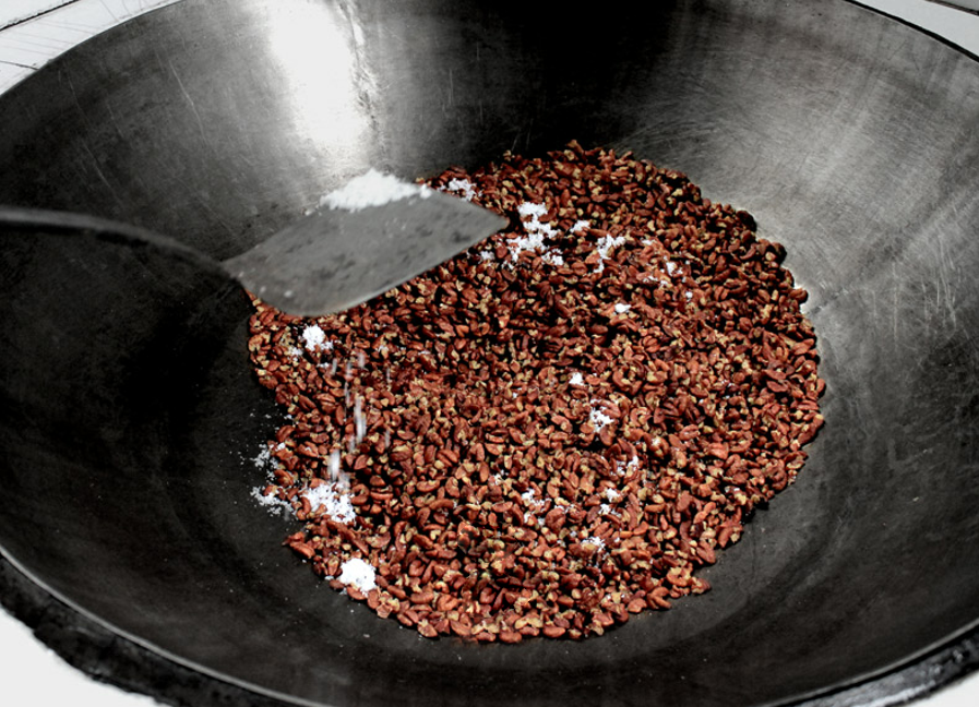 全部手工制作,打造薄脆口感体验:芝麻炒好凉至之后,加入蜂蜜、鸡蛋清和山核桃仁,山核桃仁的量不少于15%,迅速搅拌直至均匀掺和在一起。