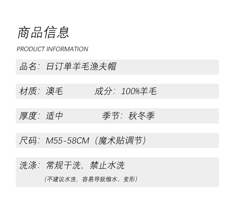 100%羊毛渔夫帽帽,澳毛保暖帽百搭盆帽洋气女帽LJX-X890