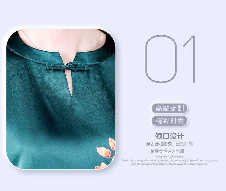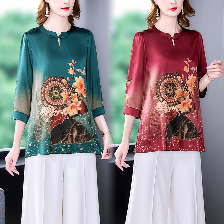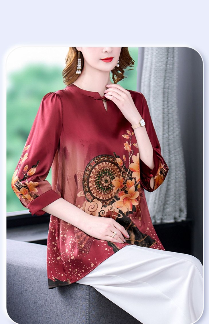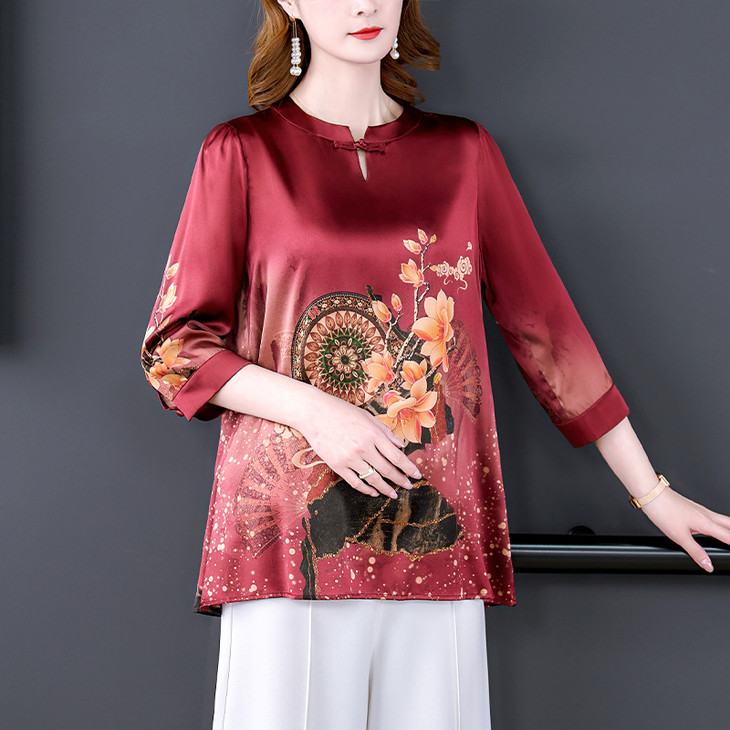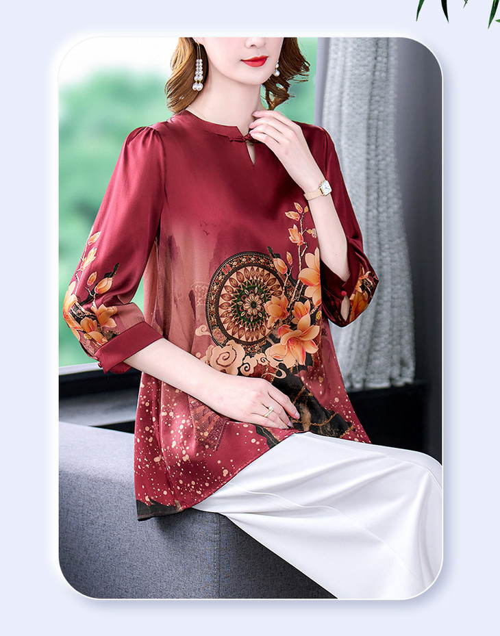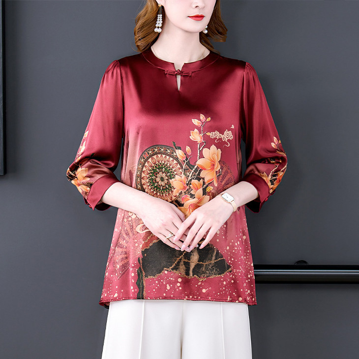 【AHM】真丝上衣女2022春季新款时尚印花复古气质盘扣圆领洋气桑蚕丝衬衫
