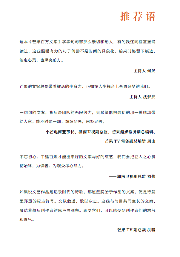 芒果百万文案 | 湖南卫视、芒果TV重磅推出首部综艺节目文案精选集。 知名主持人何炅、沈梦辰及一众湖南卫视、芒果TV制片人推荐。