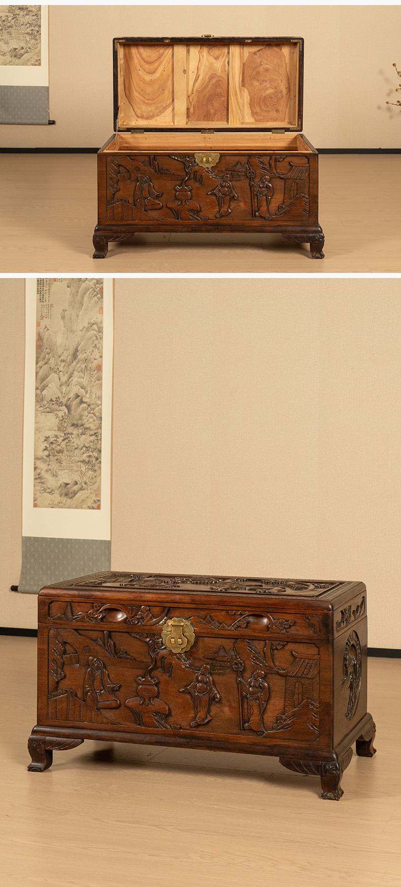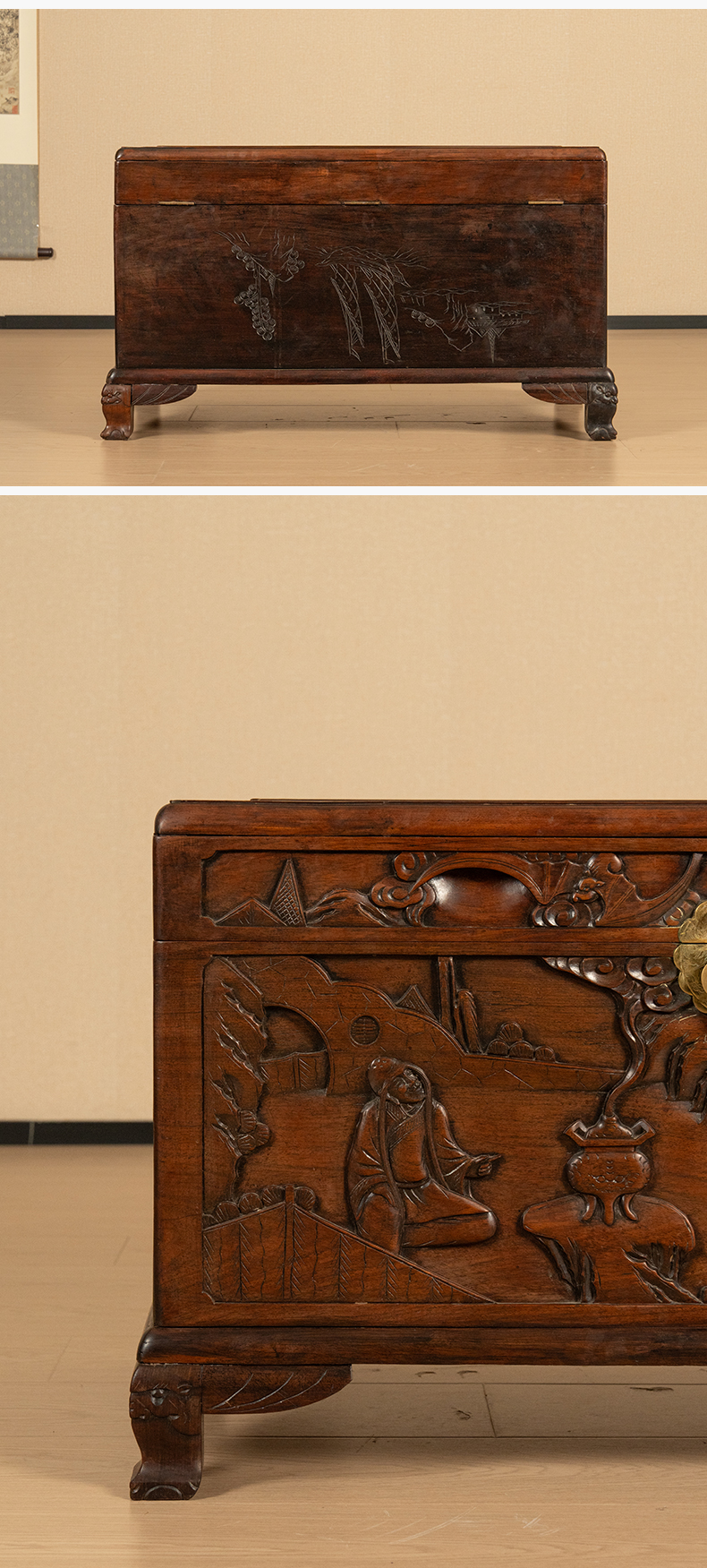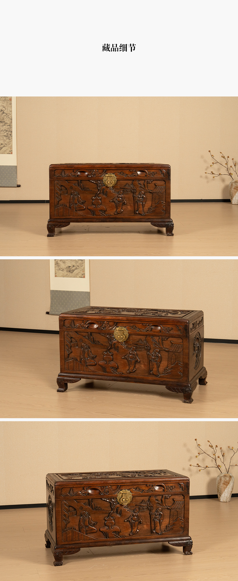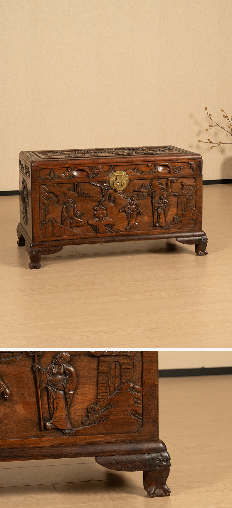 民国 红木高浮雕罗汉图宝箱