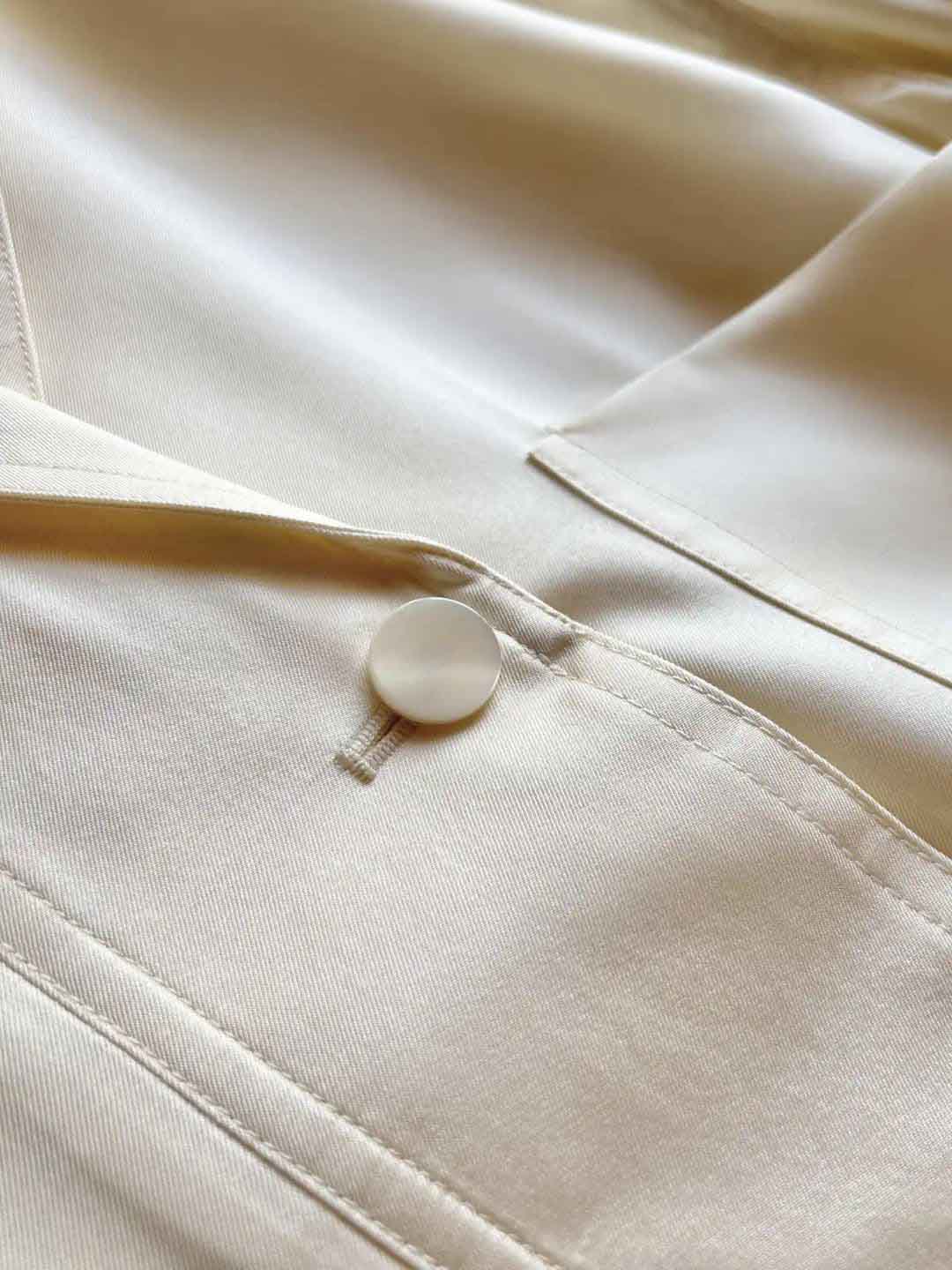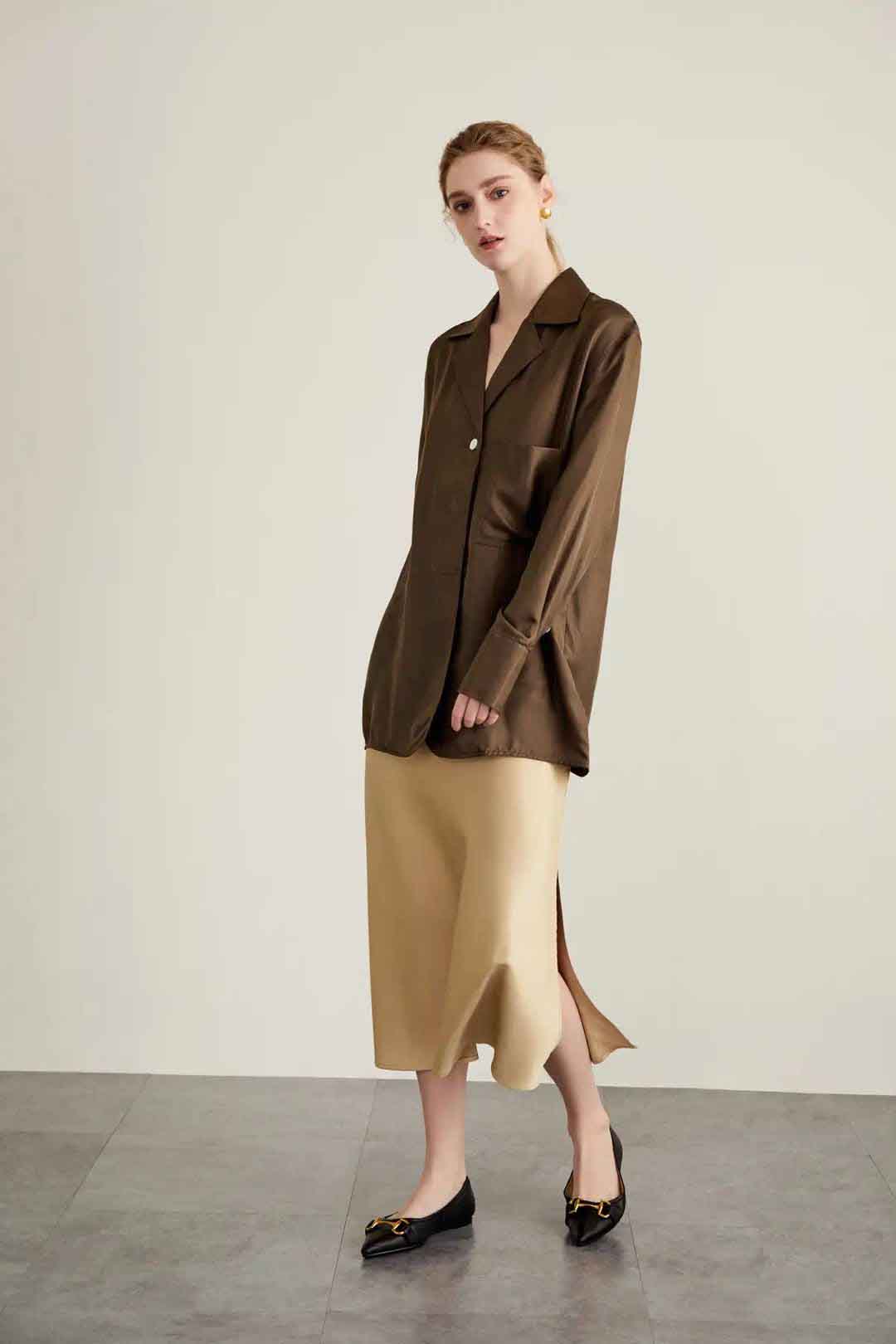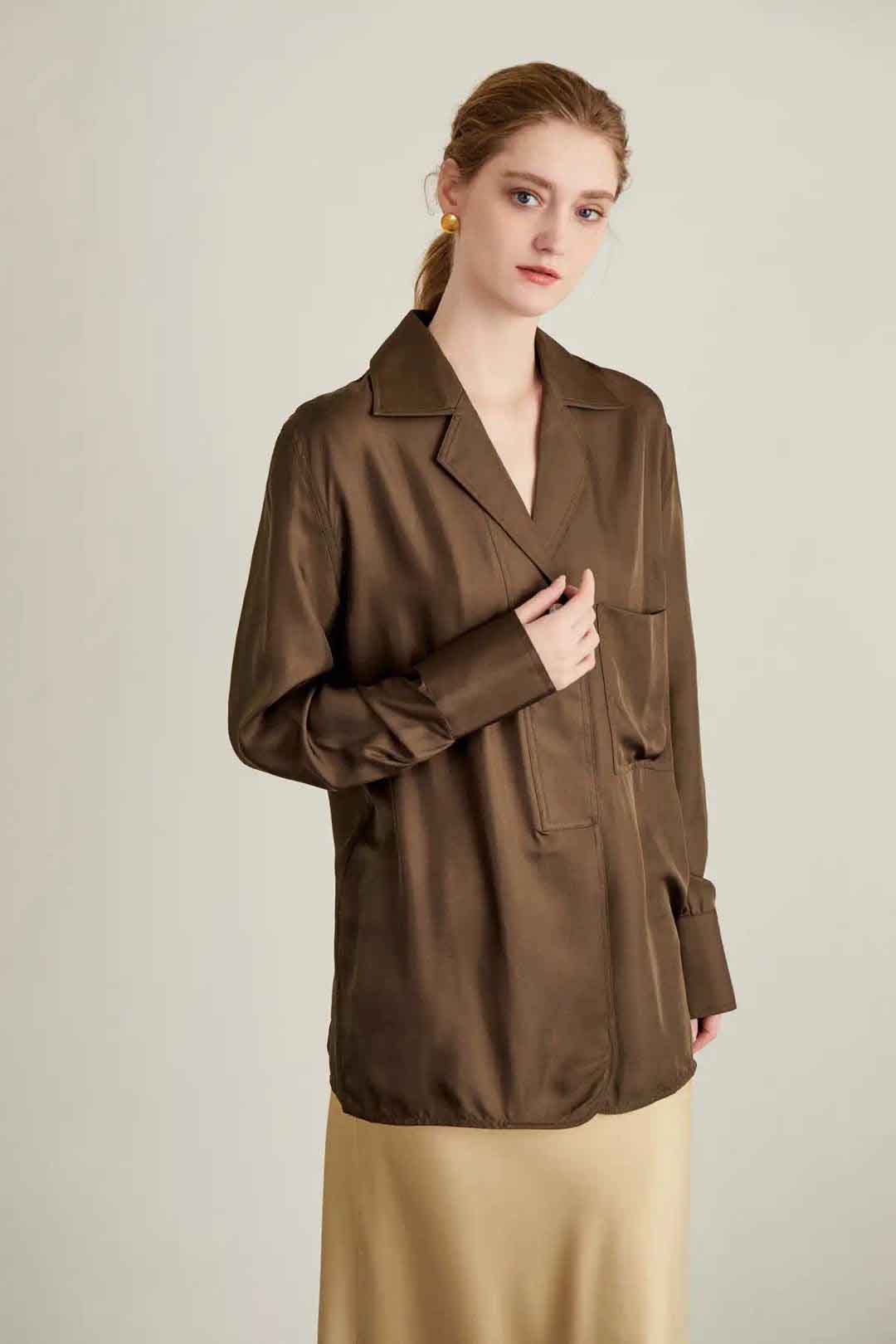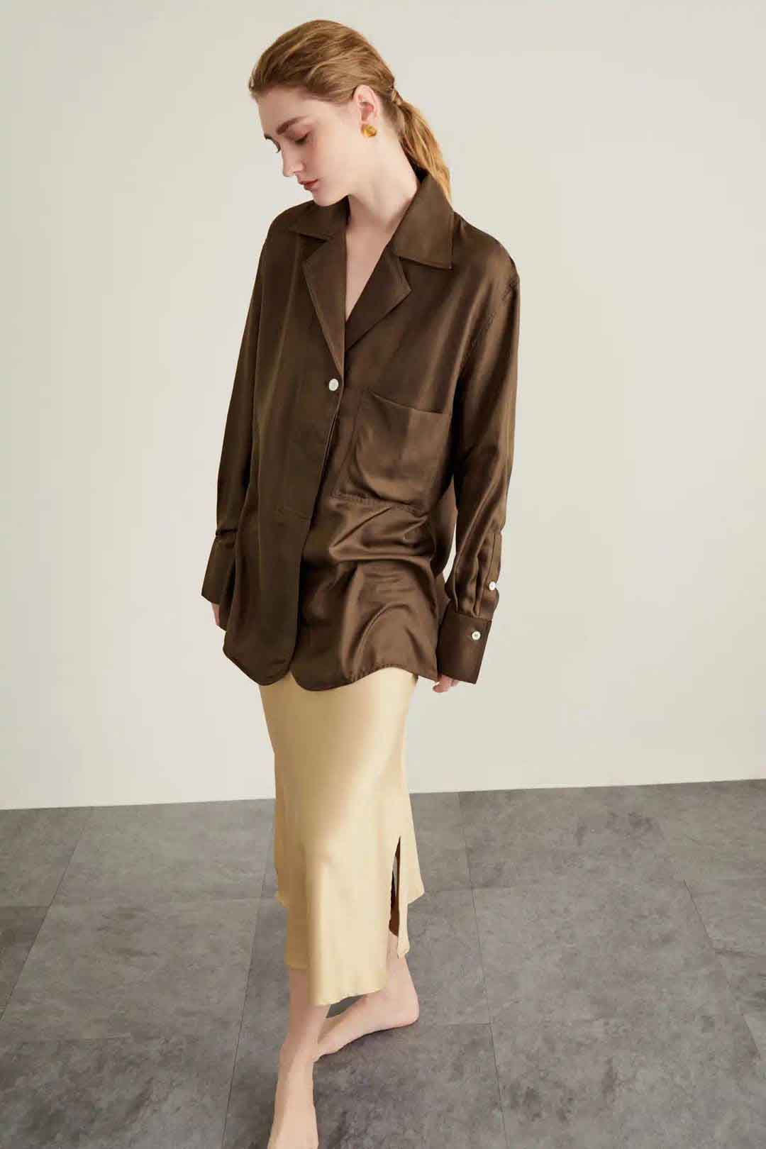 这款阔版衬衫外套的面料为100%桑蚕丝,