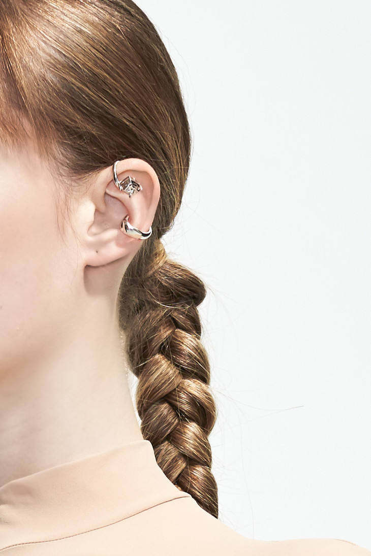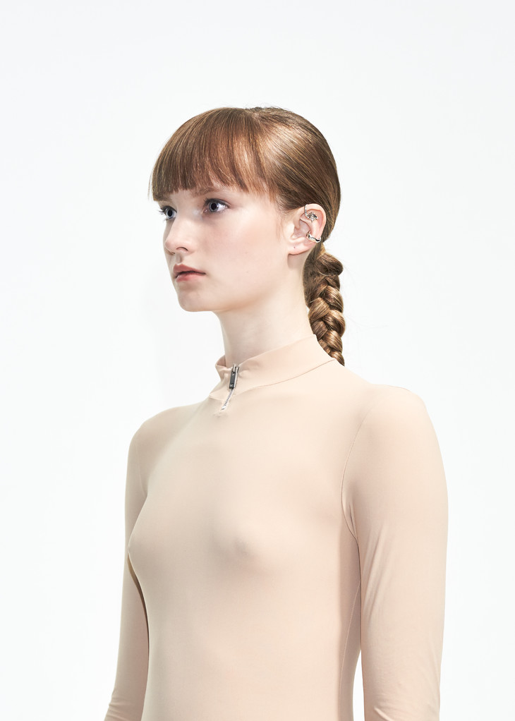 以人体耳廓线条为基础研发新式耳套款式。采用特殊工艺所形成的”呼吸纹理“模拟宝石光泽,后嵌于耳廓套侧位。产品材质:纯银