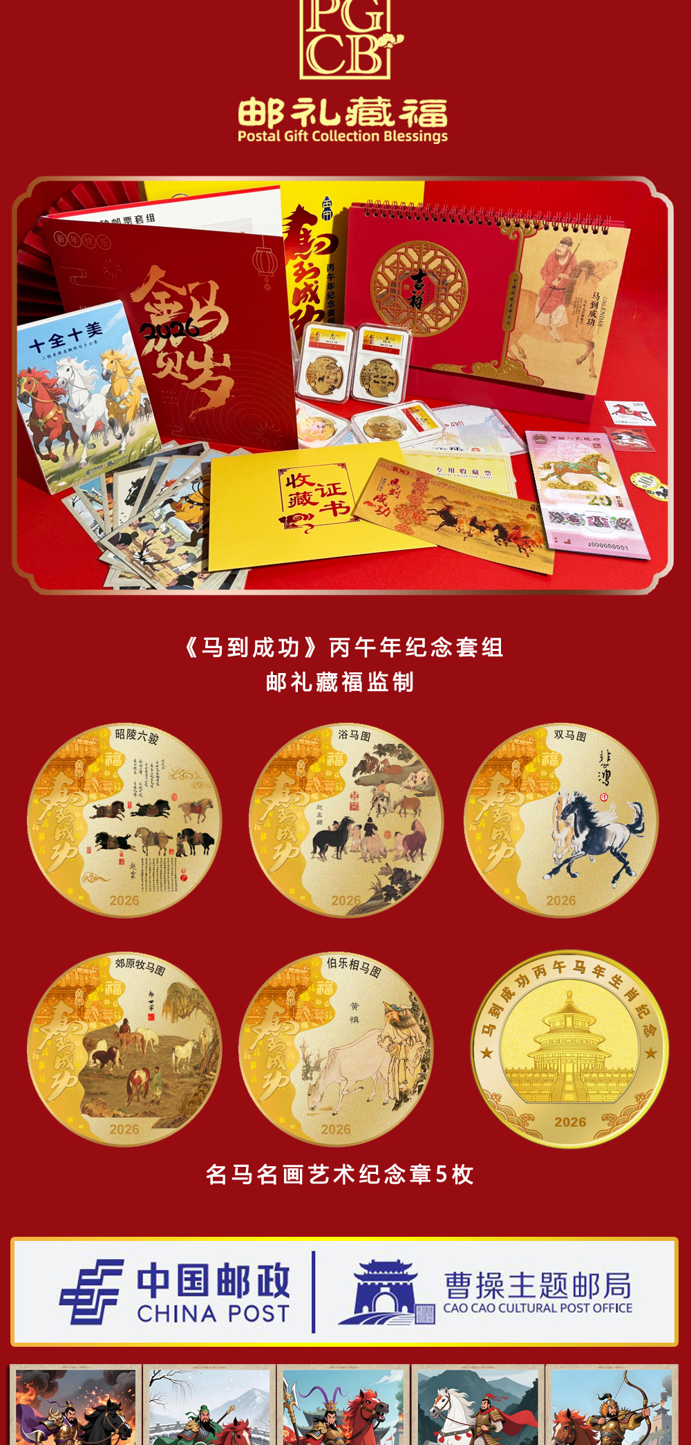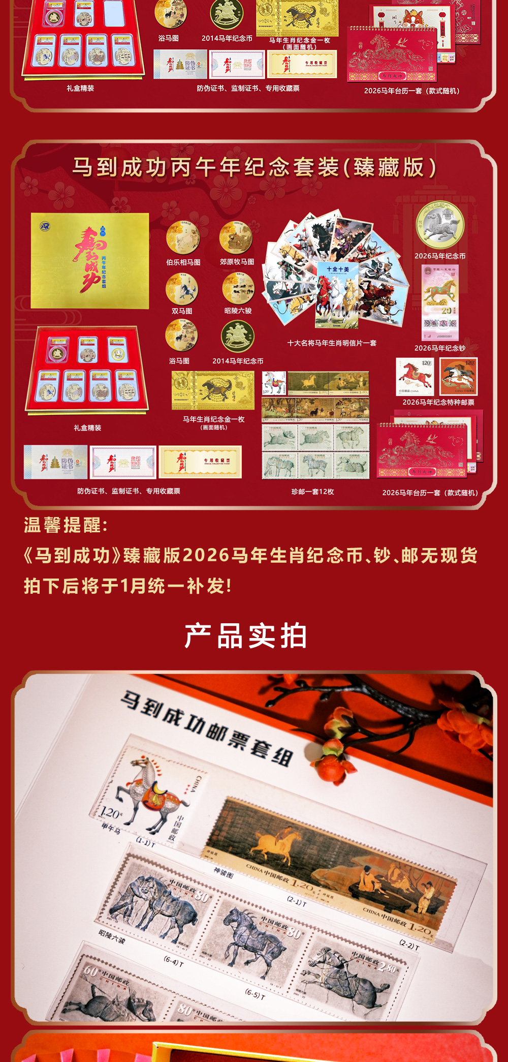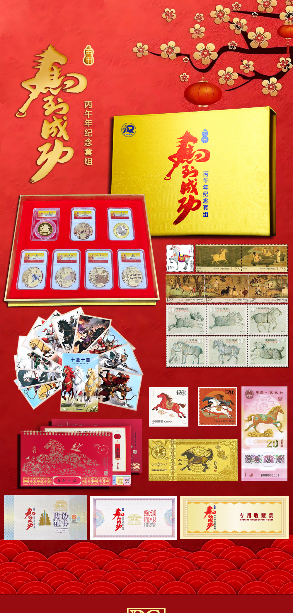 《马到成功·丙午年纪念套装》,马年生肖邮、币、钞套组来了!邮礼藏福官方监制,购买任意一款额外赠送金箔手机贴一枚,