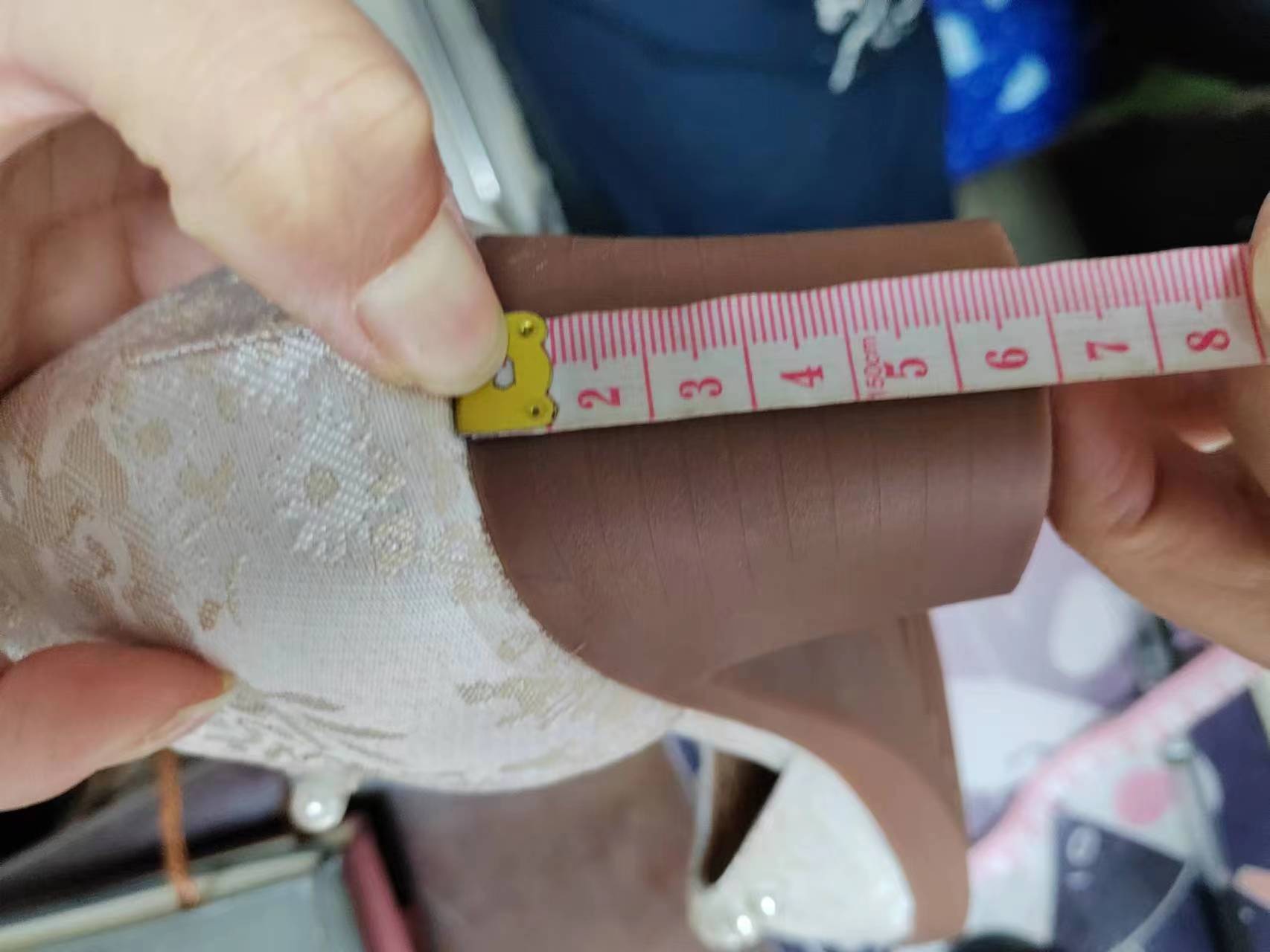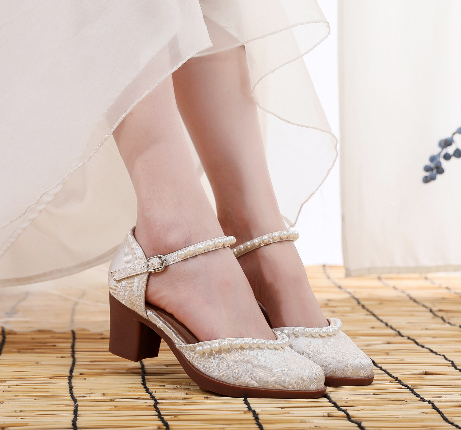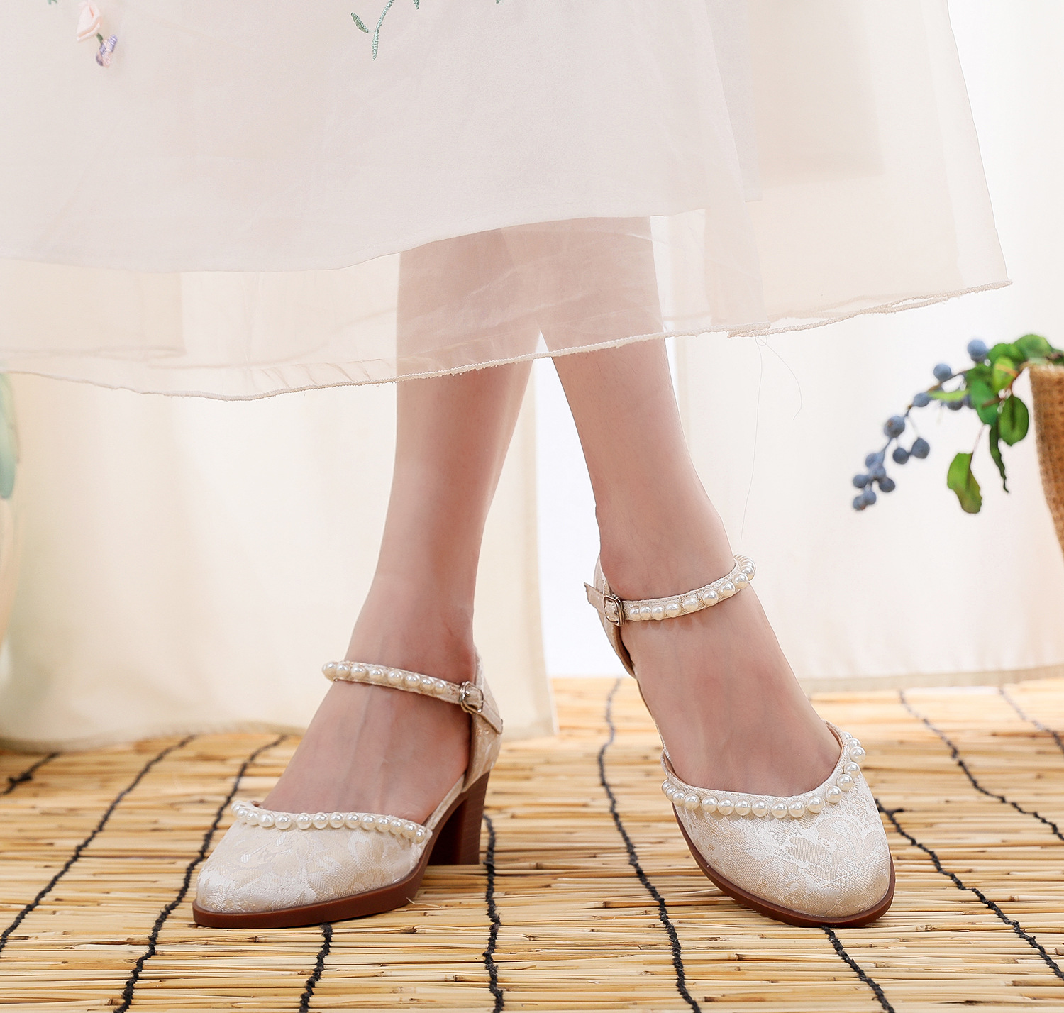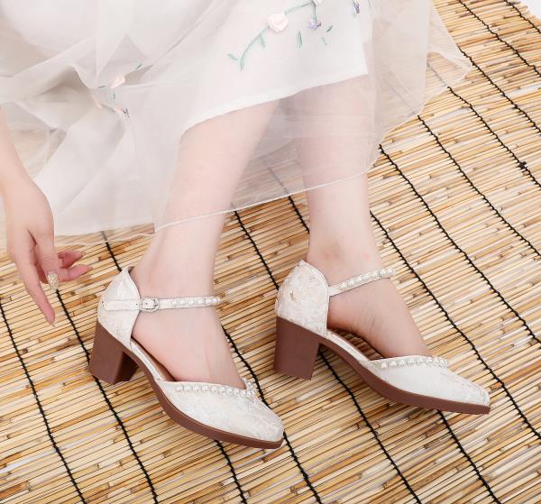 白色时尚圆头,包头钉珠粗跟鞋XQ-明珠