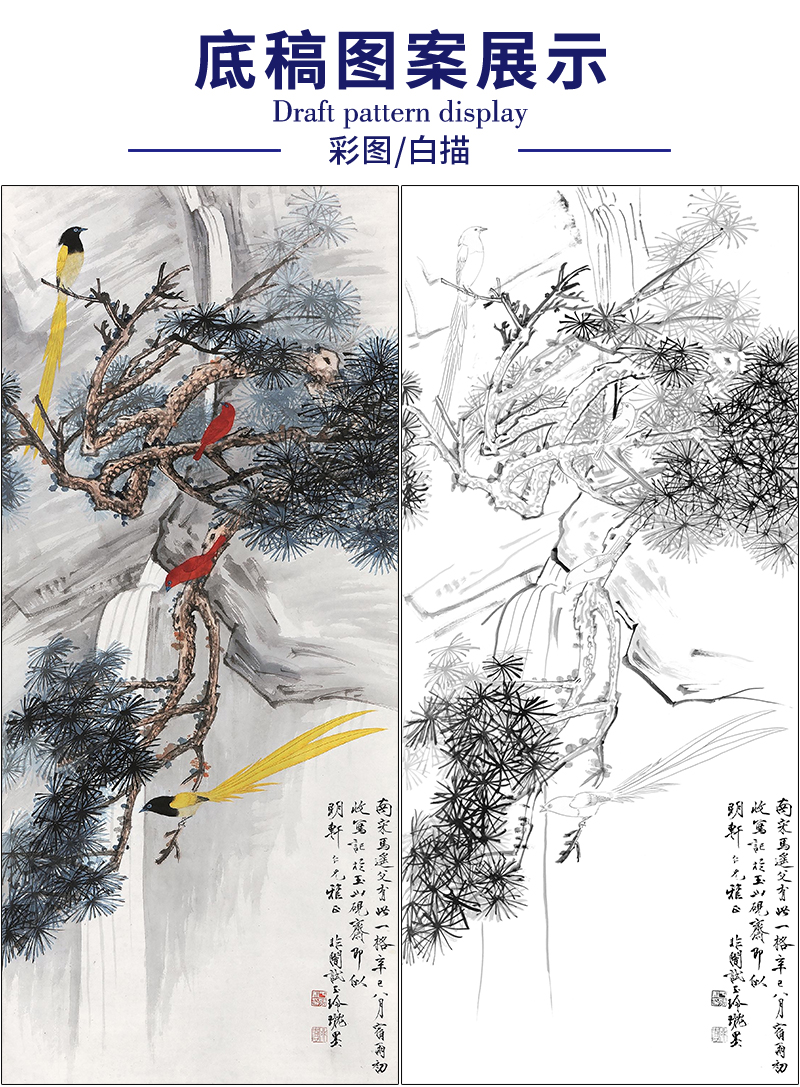 于非闇花鸟工笔画白描底稿《松溪双寿》临摹勾线高清打印稿HS06