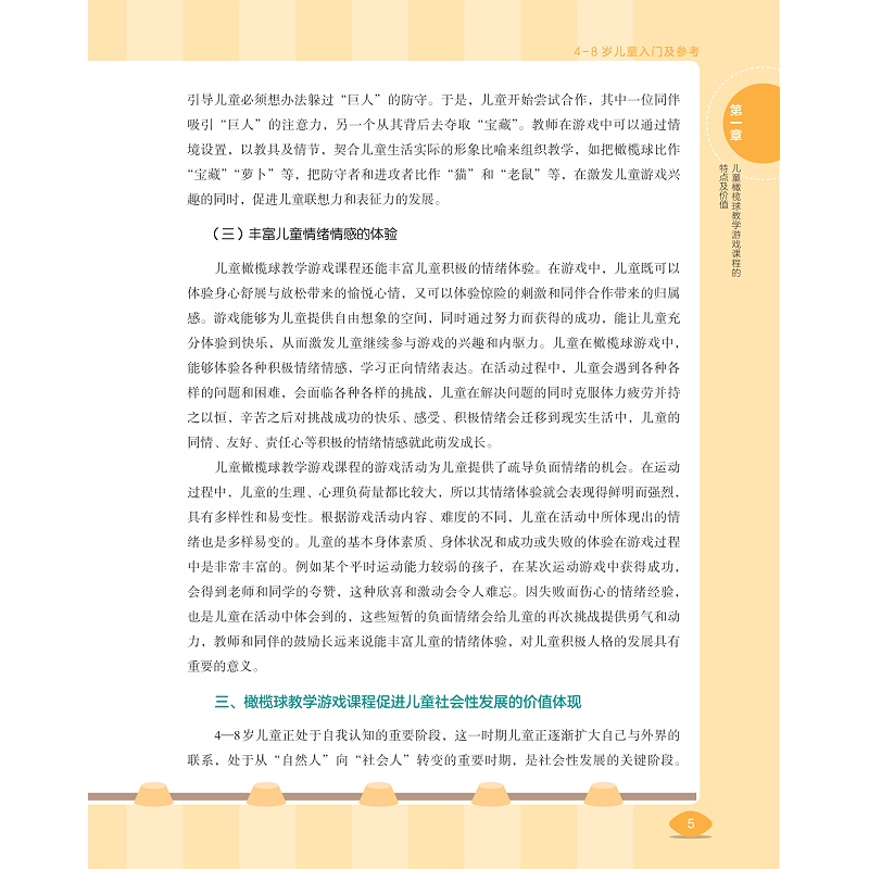 本书主要是针对英式橄榄球在4-8岁阶段的游戏化训练内容,是目前国内第一本该年龄段的本土化英式橄榄球运动相关教材。本书通过运动示范图例生动明确地讲解了英式橄榄球游戏的场景;通过游戏内容分类和进阶性的描述,更有利于教师对不同学习程度的儿童开展针对性教学;通过前置的课程理论部分和教学实践课程的案例分享,帮助教师获得一线教学所需的实操性内容,更快的帮助其成长,从而帮助儿童从英式橄榄球运动项目中获益。运动示范图例专业生动、游戏化设置场景有趣好玩、内容设置实操性强。