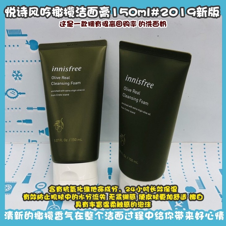 悦诗风吟橄榄洁面膏150ml#2019新版👍这是一款拥有很高回购率🔥的洗面奶,含有抗氧化维他命成分,24小时长效保湿💦,有效防止肌肤中的水分流失,无紧绷感,使皮肤更加舒适、嫩白✨!具有丰富温柔触感的泡沫☁,能够清洁化妆残留和毛孔污渍,使皮肤清洁无负担✅。草本精华使皮肤更加明亮富有光彩,清新的橄榄香气在整个洁面过程中给你带来好心情😊~