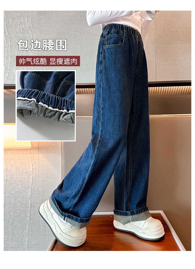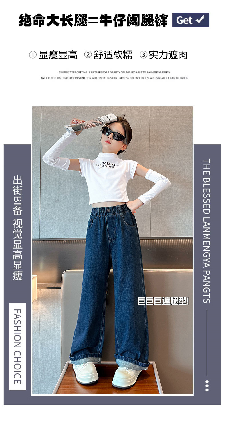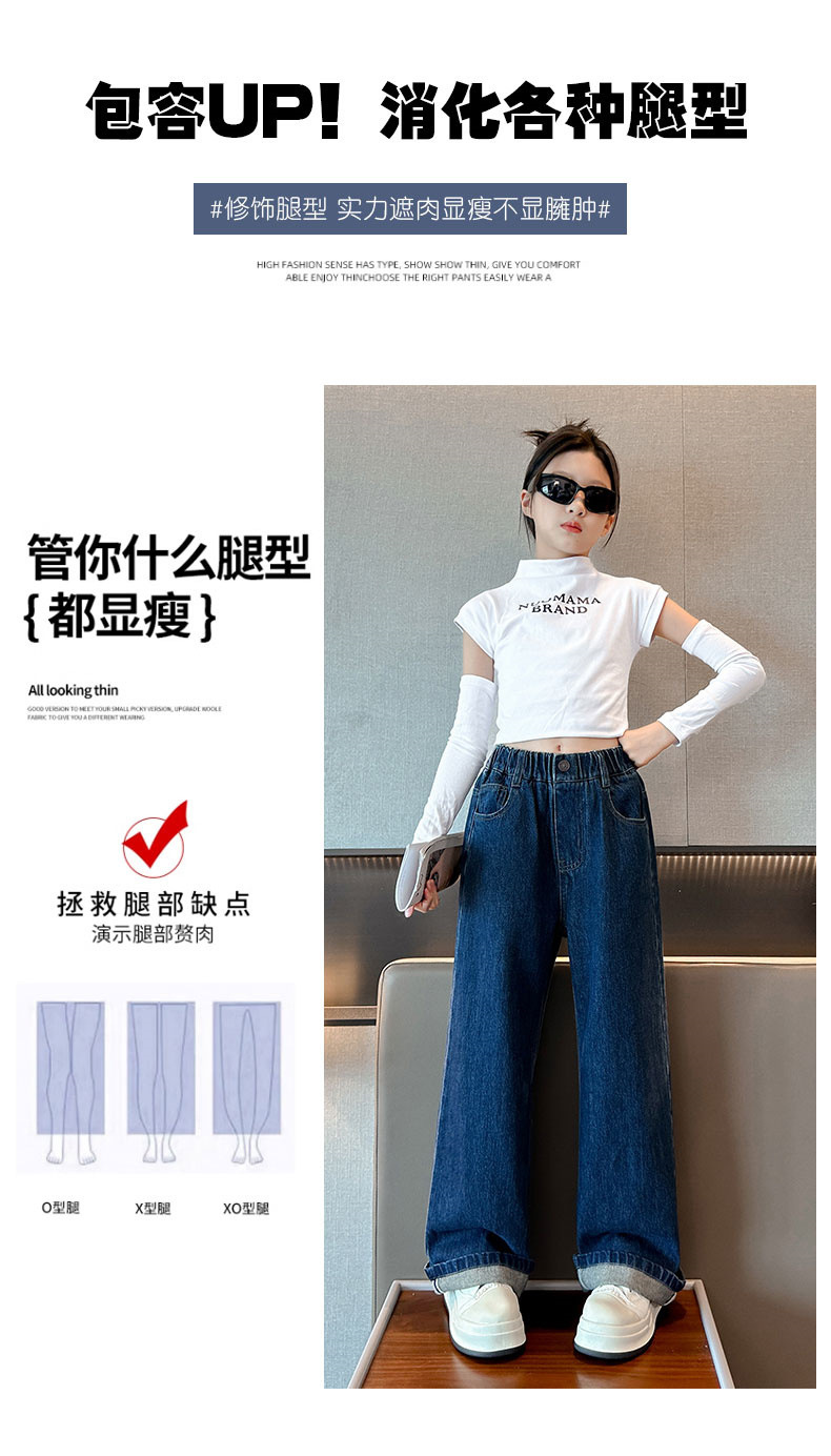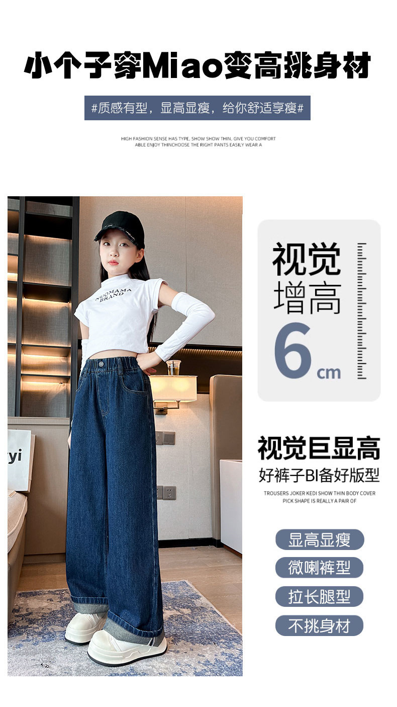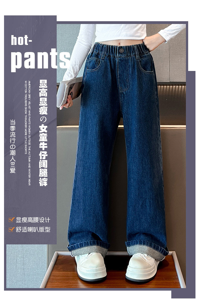【显瘦高腰设计,舒适喇叭版型】女童裤子春秋新款 儿童深蓝牛仔裤 初秋长裤 女孩大童秋季阔腿裤-QQ