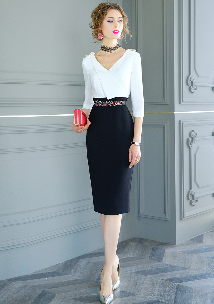 FMY-F20CL29830新款气质V领修身拼接中长款连衣裙
