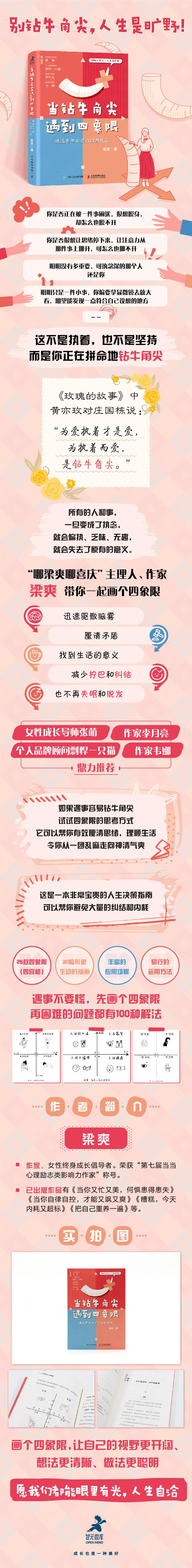 1.“哪梁爽哪喜庆”主理人梁爽力作。你有没有发现,你不开心的七成原因都是“钻牛角尖”?它让你在反复纠结和拧巴中脱发和失眠…… 四象限是钻进牛角尖后的逃生工具,它可以帮助你完成自我定位、角色推演、动态评估,让你的视野更开阔、想法更清晰、做法更聪明。它兼顾了全面和重点,可以具体问题具体分析,可以把解决问题的步骤具象化,还可以用来做读书笔记、规划日程、做对选择,给自己提供情绪价值。 2. 女性成长导师张萌、个人品牌顾问剽悍一只猫、作家李月亮、作家韦娜 鼎力推荐 这是一本非常宝贵的人生决策指南,可以帮你避免大量的纠结和内耗。这本书的含金量非常高。 3. 别钻牛角尖,人生是旷野。本书详解了25款四象限或四宫格,配有30幅生动形象的漫画,帮你驱散脑雾,厘清矛盾,理顺生活。 本书通过真实生动的案例,介绍了在不同生活情境、不同困难下应用四象限工具厘清思路和解决问题,并提升生活质量的方法。书中还配有可爱应景的插图,让你的阅读更有趣。 4.人民日报倡导的生活理念:遇事不钻牛角尖,人也舒坦,心也舒坦。 有没有某些时刻,你发现自己在被一件事困扰,很想脱身,却怎么也脱不开;很想让思绪停下来,让注意力从那件事上挪开,可怎么也放不下。明明没有多重要,明明结局已成定局,可执念深的那个人还是你;明明只是一件小事,偏要拿显微镜去放大看,期望发现的真相能符合自己的设想,可越是较劲,结局越是相反…… 不要再钻牛角尖啦!翻开本书,利用四象限(四宫格)工具,让自己从精神内耗的陷阱中走出来吧。 5. 条条大路通罗马,门推不开就选择拉开。遇事不要慌,先画个四象限,再困难的问题都有100种解法。 将你最在意的两个因素,或是最矛盾的两个指标,锁定横轴、纵轴,让两个维度进行两两交叉重叠的结合,碰撞出四朵火花。先精细分类,抓住主要矛盾,解决主要问题;再四思而行,精准施策,拥有面对繁杂事情的判断标尺,将有限资源投入最需改善的环节。