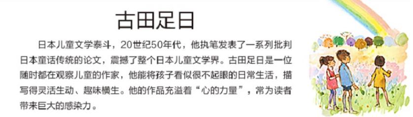 古田足日,一九二七年出生于日本爱媛县,早稻田大学俄文系中途退学,是日本当今家喻户晓的作家与评论家。上个世纪五十年代,他执笔发表了一系列批判日本童话传统的论文,震撼了整个日本儿童文学界。他除了着有《现代儿童文学论》《现代日本儿童文学的视点》等理论著作之外,还写过《一年级大个子二年级小个子》《鼹鼠原野的伙伴们》《壁橱里的冒险》《代做功课股份有限公司》等儿童文学作品,一九九三年出版了《古田足日儿童书全集》十三卷。