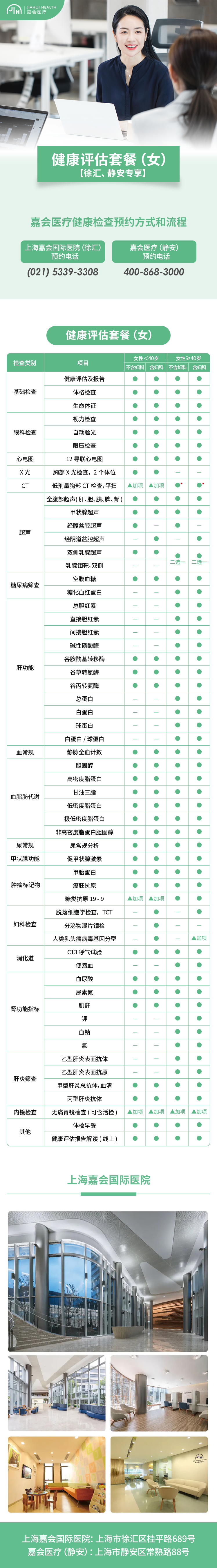 * 由于嘉会医疗嘉静诊所(静安) 暂无CT设备,≥40岁套餐中的胸部CT项目,可至上海嘉会国际医(徐汇)进行检查。