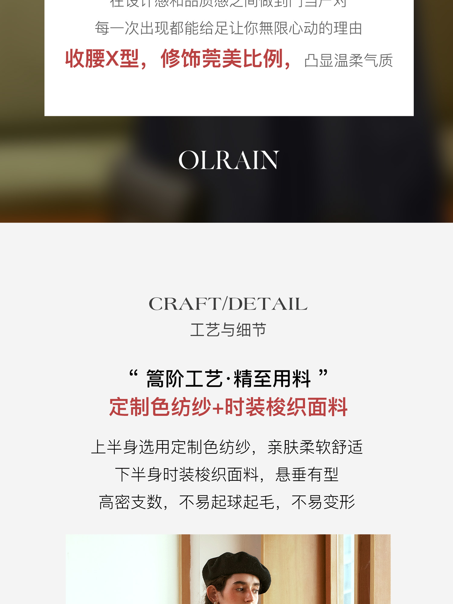 - “精致”是欧芮儿olrain品牌文化的核心,欧芮儿认为,精致的女人,不但要外在动人,更要内在迷人,内外兼修,有魅力、有气质、有内涵,自信而不自傲,优雅而不矫揉,自有万种风情而不轻浮,更不故作矜持。