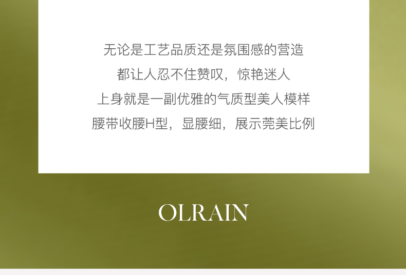 - “精致”是欧芮儿olrain品牌文化的核心,欧芮儿认为,精致的女人,不但要外在动人,更要内在迷人,内外兼修,有魅力、有气质、有内涵,自信而不自傲,优雅而不矫揉,自有万种风情而不轻浮,更不故作矜持。
