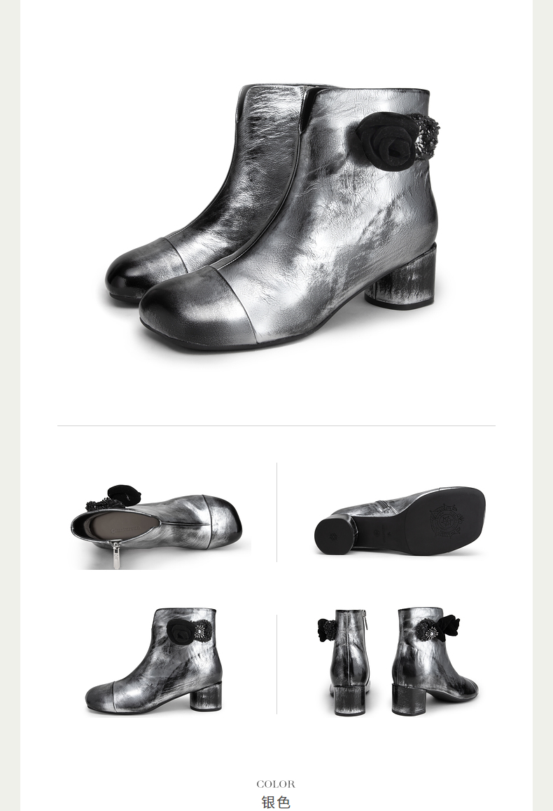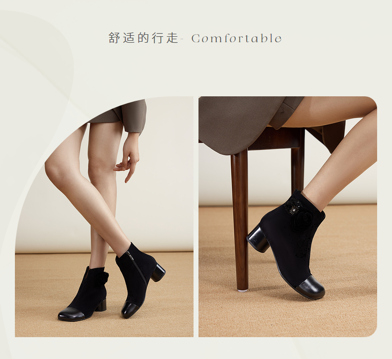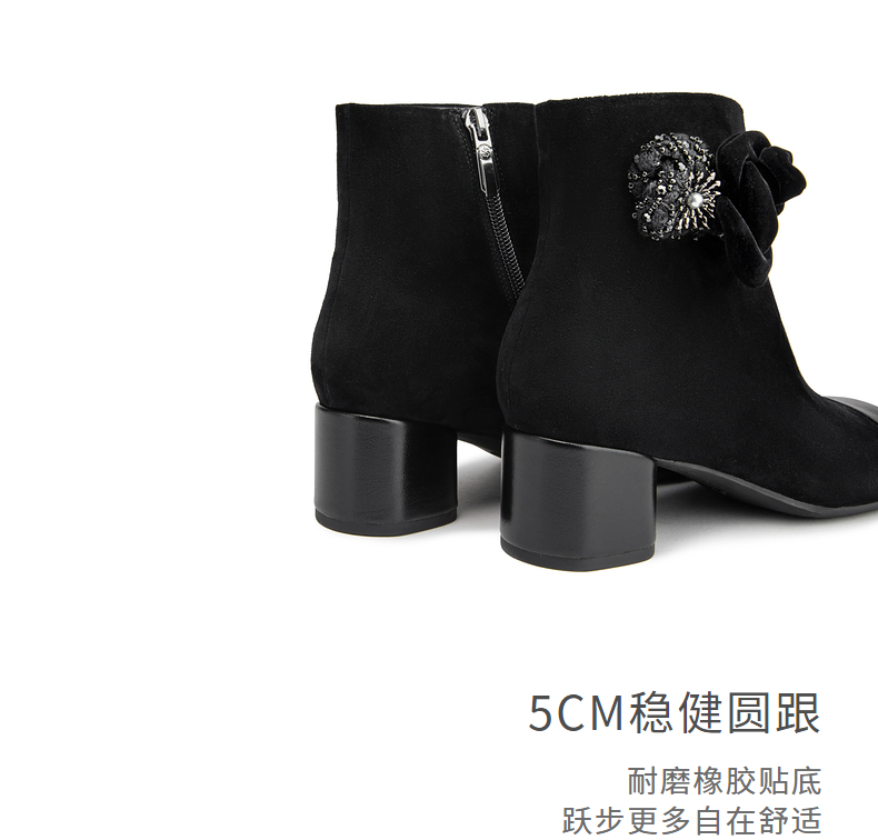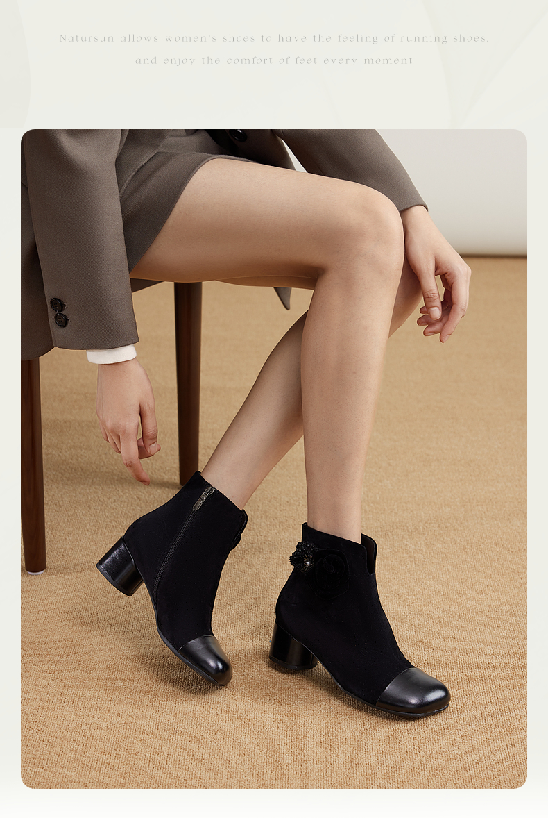 natursun方头时装靴秋冬季花朵舒适不累脚烟筒靴厚底简约短靴N24530304