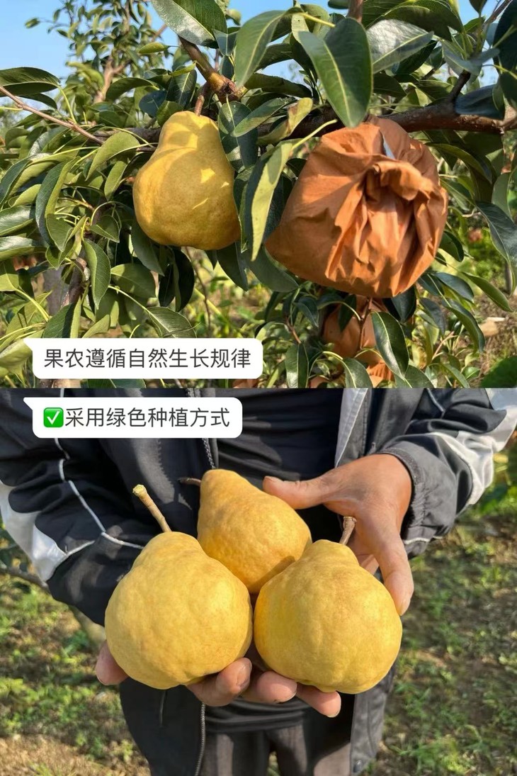 果农遵循自然生长规律,采用绿色种植方式,不催熟,没有膨大剂,没有农药,坚持原生态种植,到挂果期,每一颗果子都会采用套袋的保护方式既能保证丑梨的原汁原味,又能使丑梨积累更多的糖分,口感更细腻。