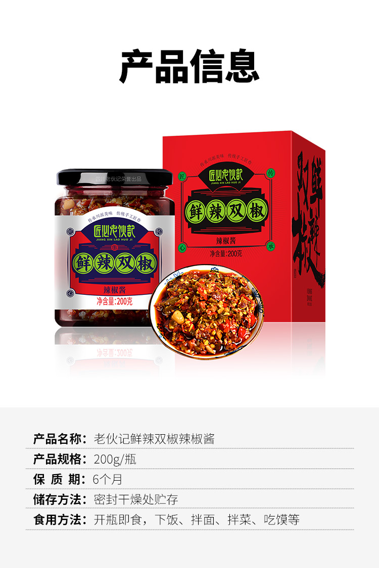 【鲜辣双椒酱200g瓶装】老伙记川派辣椒酱 即食下饭拌面拌饭辣椒酱 四川特色调味酱 爽辣可口 传统手工匠作 无化学添加 多种新鲜辣椒 口感超好