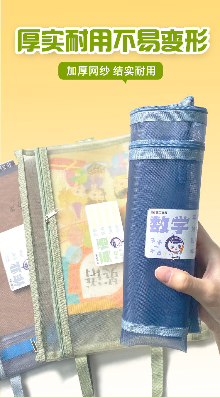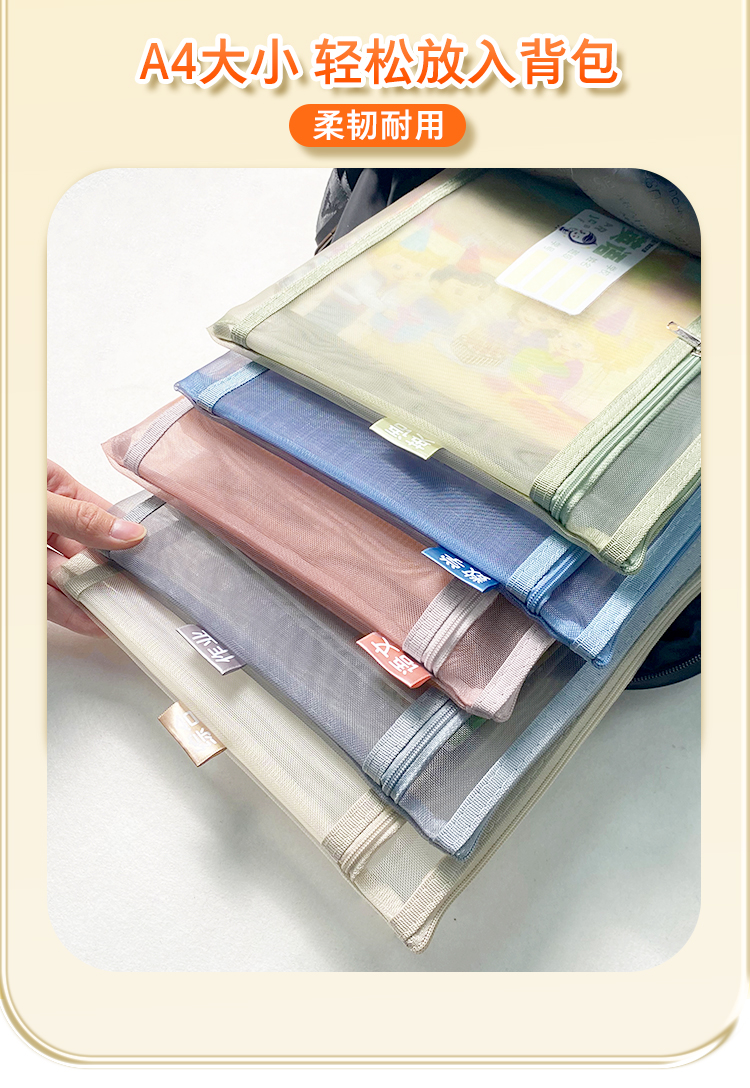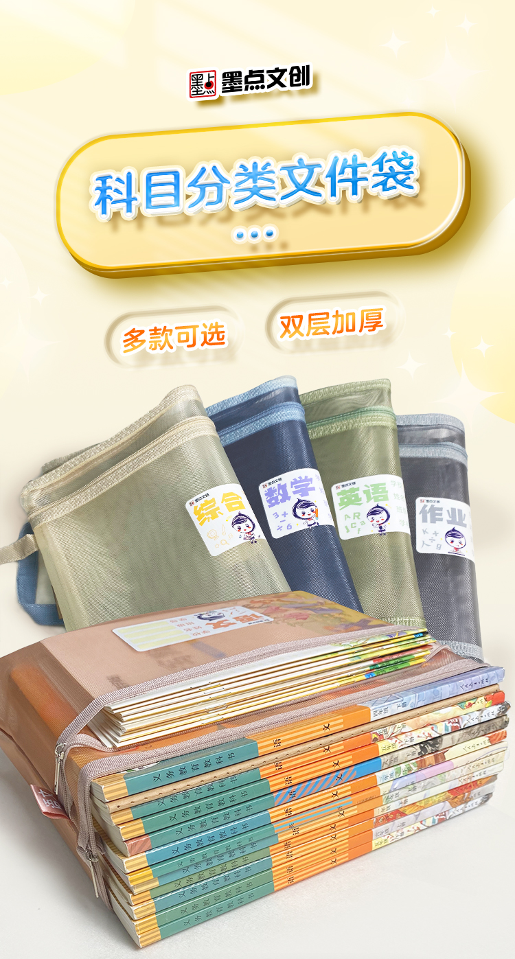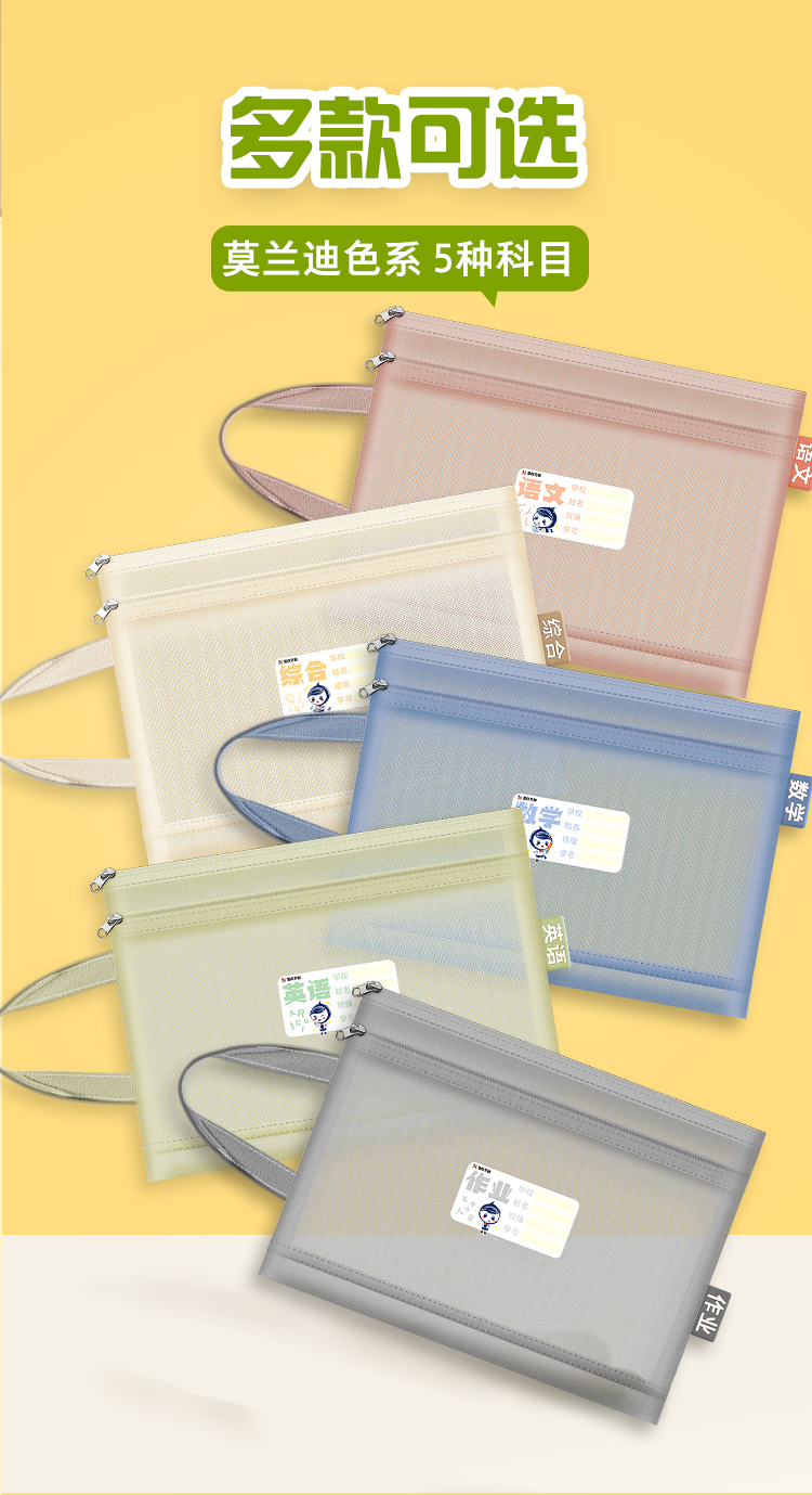 墨点 科目分类袋 小学生双层加厚大容量学科手提式拉链款A4透明网纱资料课本作业试卷收纳袋