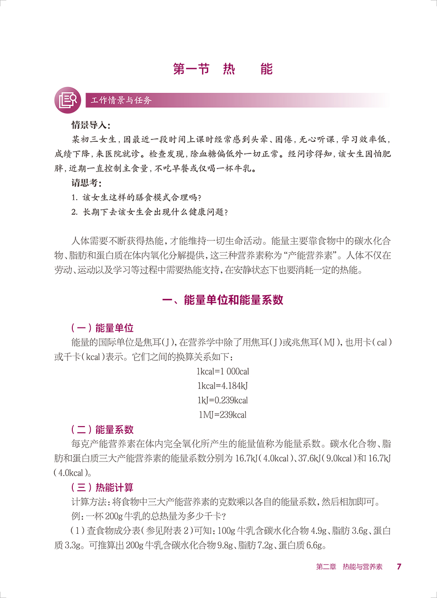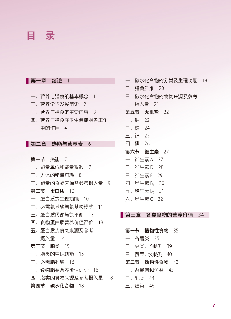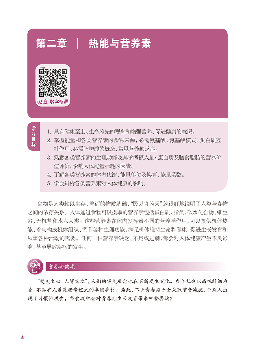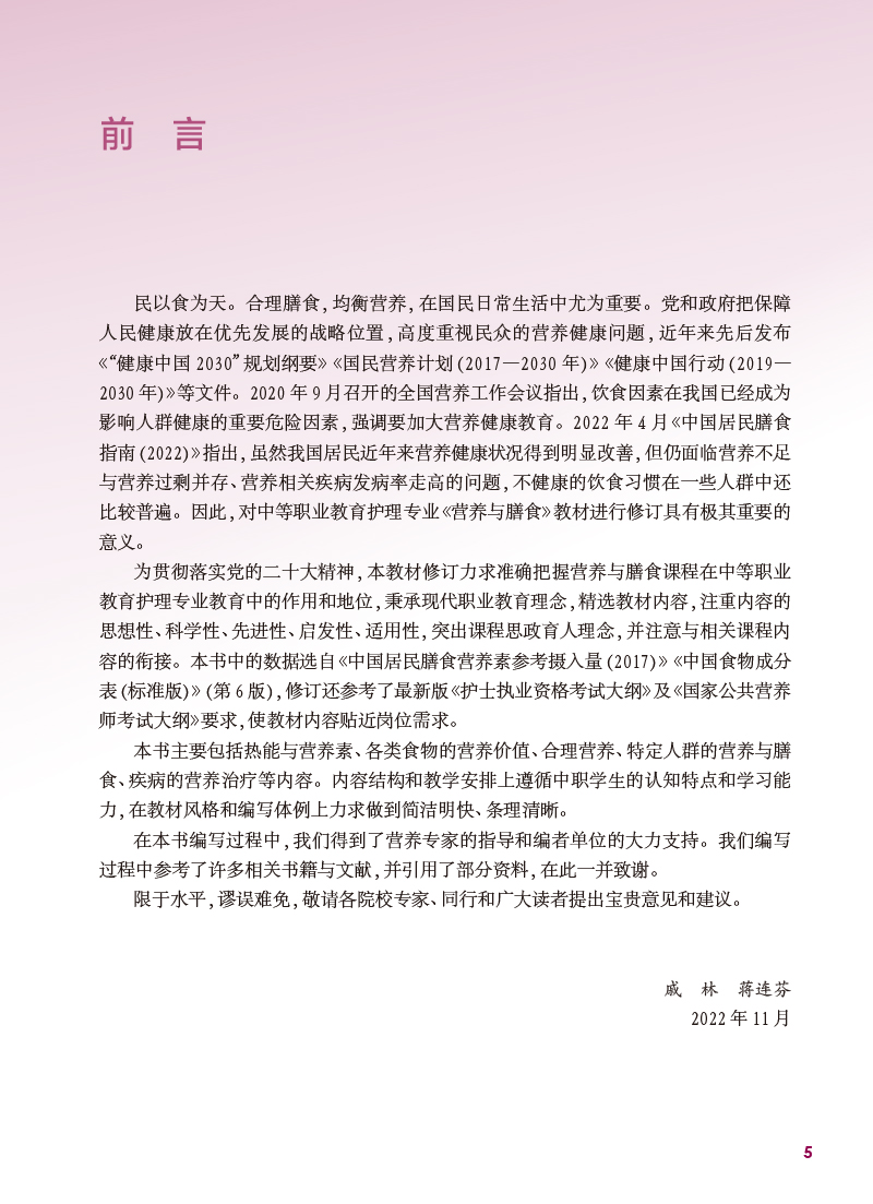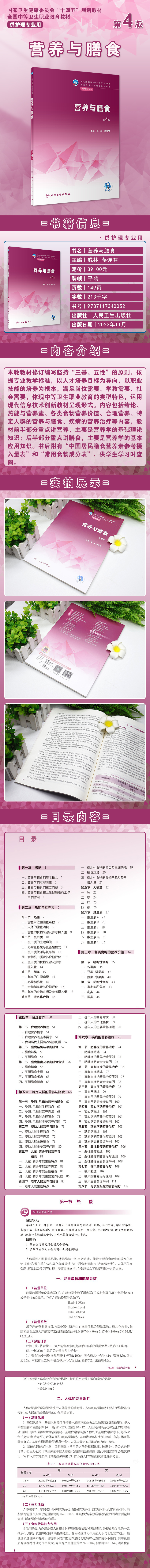 本轮教材修订编写坚持“三基、五性”的原则,依据专业教学标准,以人才培养目标为导向,以职业技能的培养为根本,满足岗位需要、学教需要、社会需要,体现中等卫生职业教育的类型特色,运用现代信息技术创新教材呈现形式。内容包括绪论、热能与营养素、各类食物营养价值、合理营养、特定人群的营养与膳食、疾病的营养治疗等内容,教材前半部分重点讲营养,主要是营养学的基础理论知识;后半部分重点讲膳食,主要是营养学的基本应用知识。书后附有“中国居民膳食营养素参考摄入量表”和“常用食物成分表”,供学生学习时查阅。