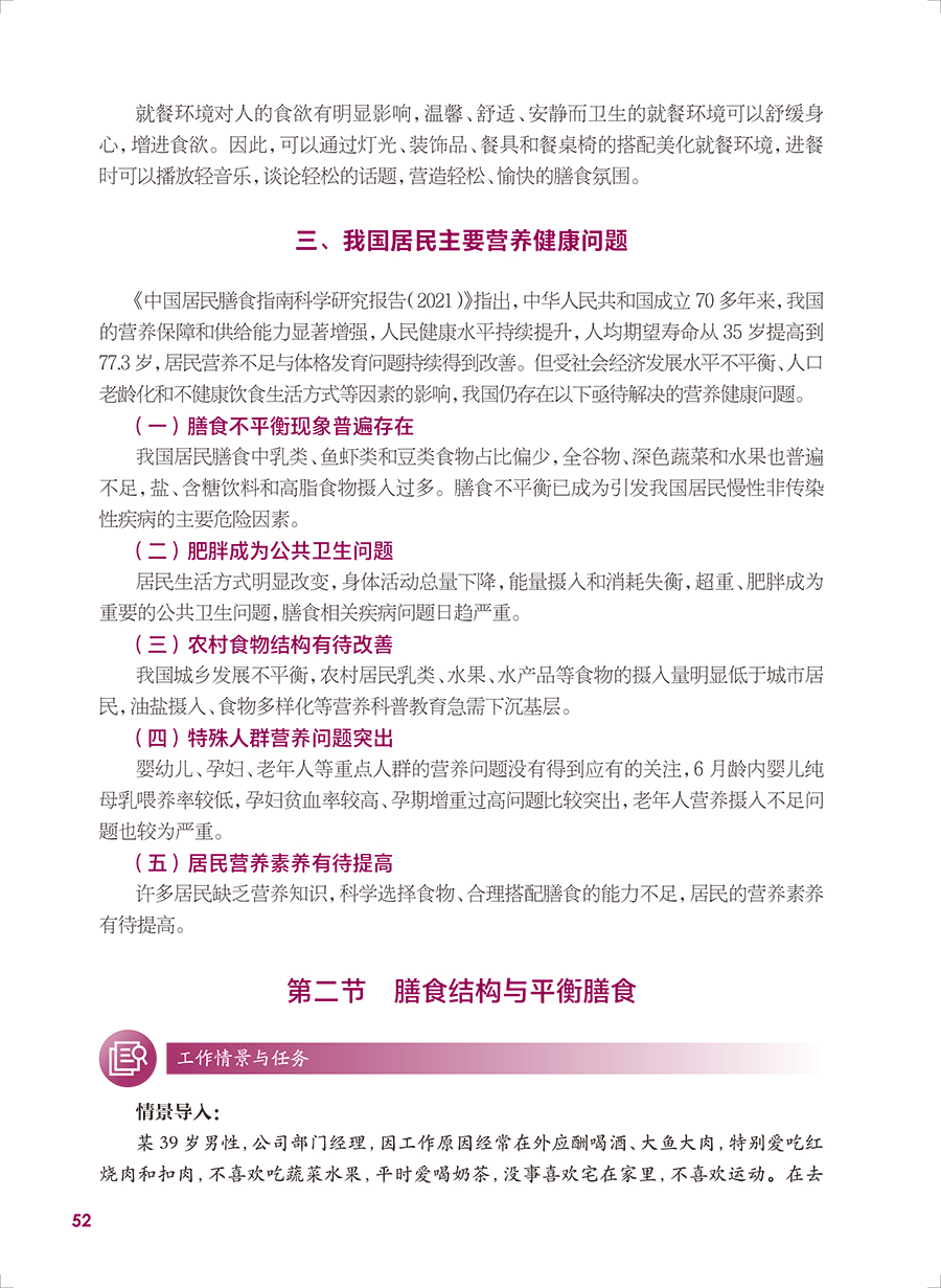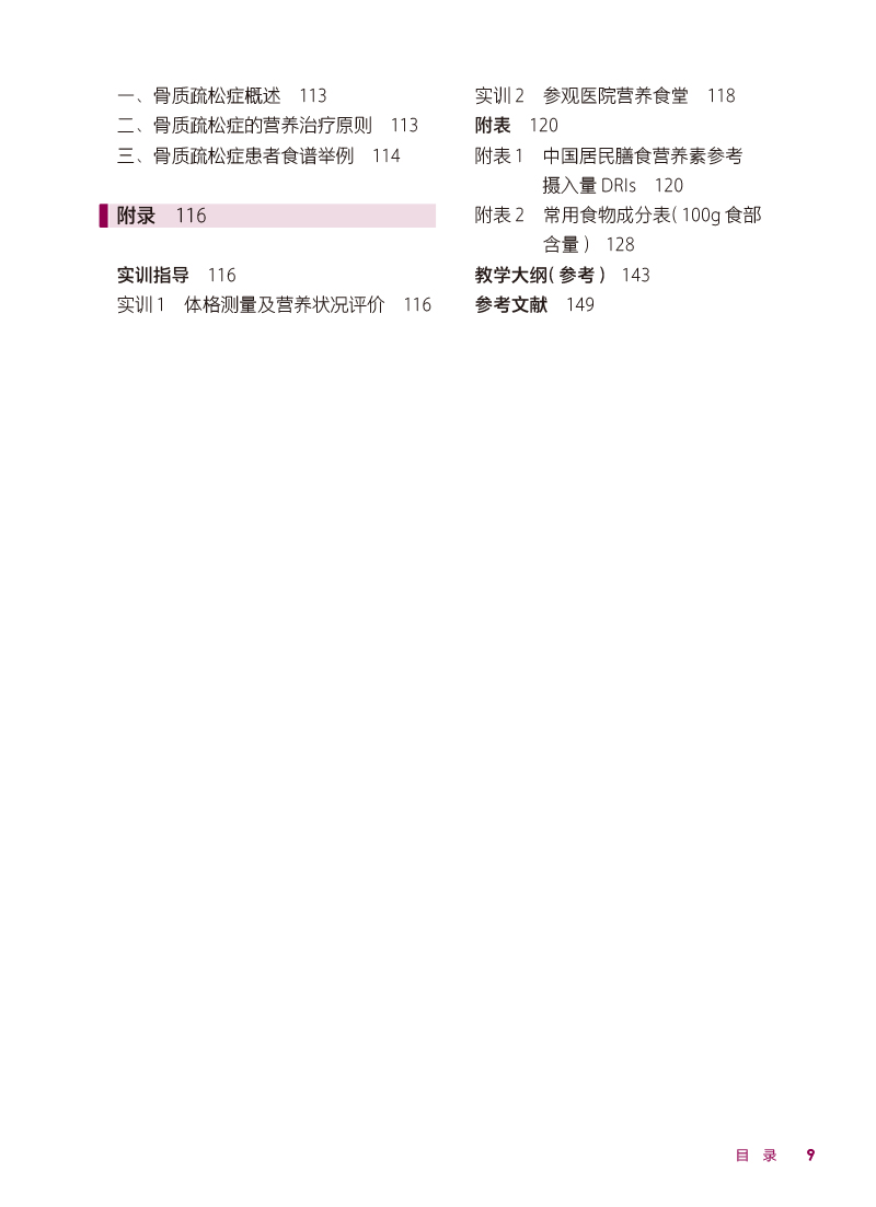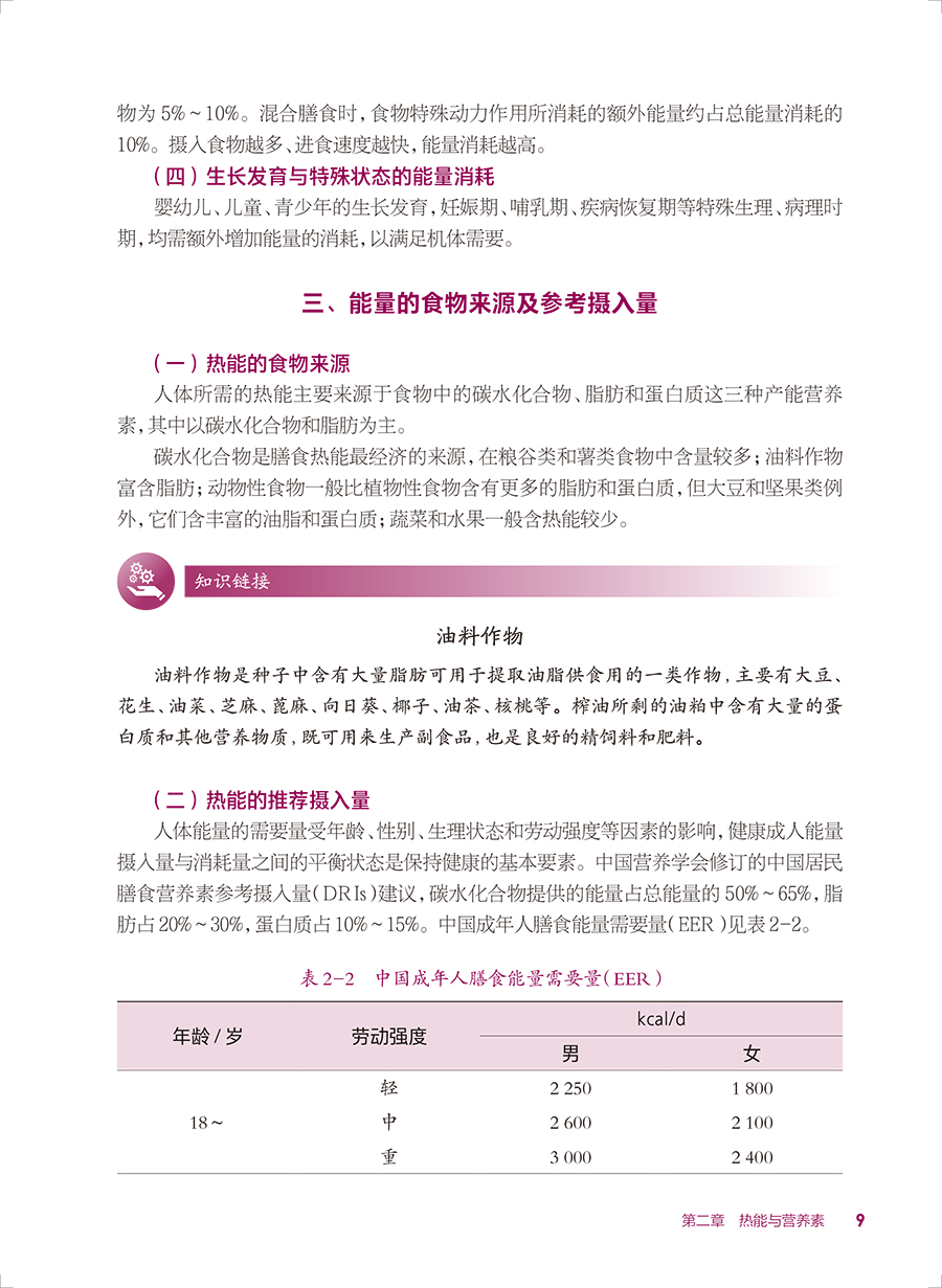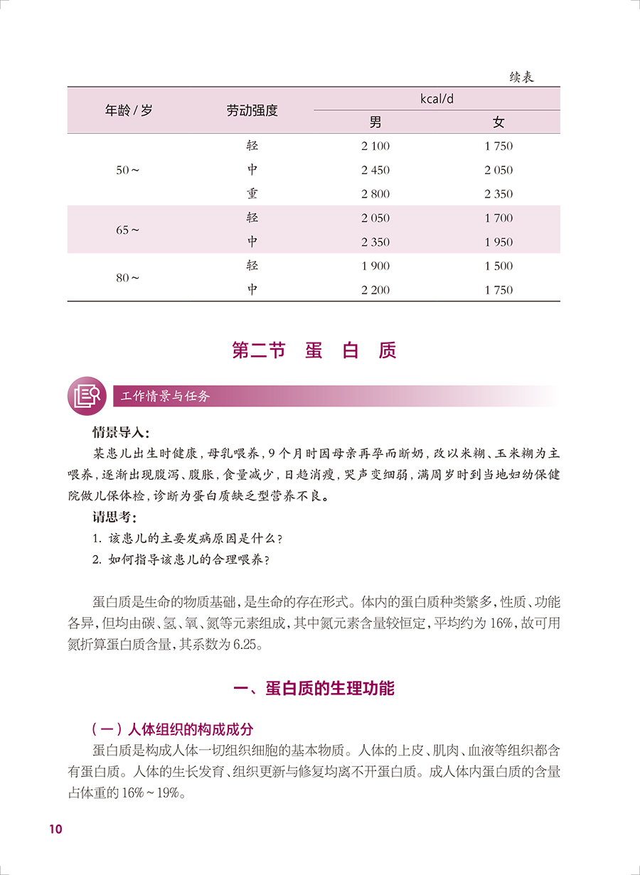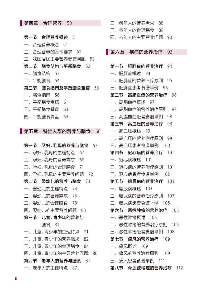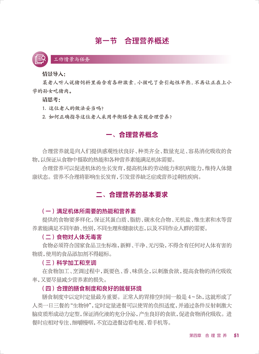 本轮教材修订编写坚持“三基、五性”的原则,依据专业教学标准,以人才培养目标为导向,以职业技能的培养为根本,满足岗位需要、学教需要、社会需要,体现中等卫生职业教育的类型特色,运用现代信息技术创新教材呈现形式。内容包括绪论、热能与营养素、各类食物营养价值、合理营养、特定人群的营养与膳食、疾病的营养治疗等内容,教材前半部分重点讲营养,主要是营养学的基础理论知识;后半部分重点讲膳食,主要是营养学的基本应用知识。书后附有“中国居民膳食营养素参考摄入量表”和“常用食物成分表”,供学生学习时查阅。