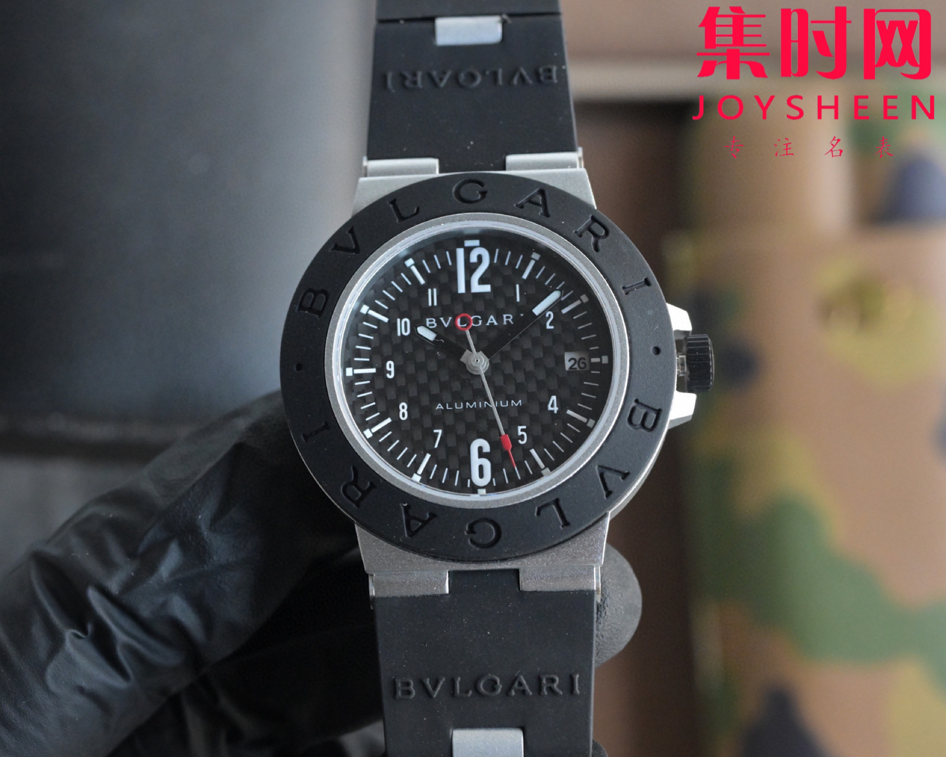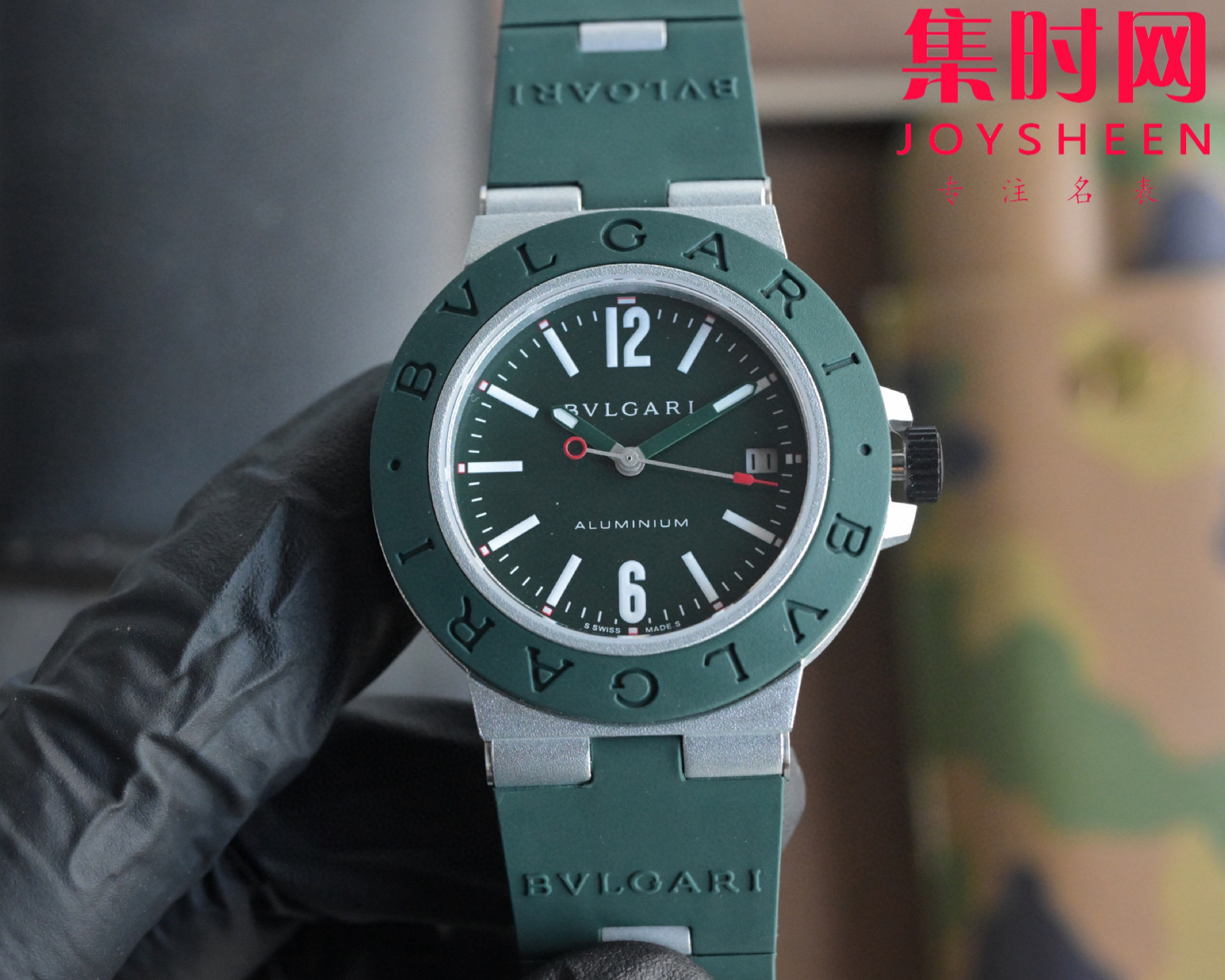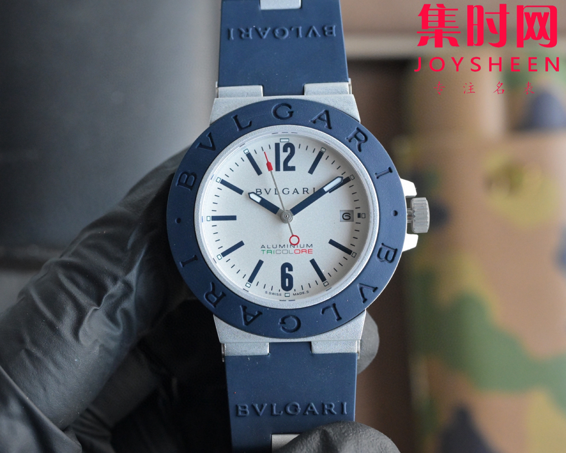 搭载定制全自动机械机芯,表帶采用麾术貼,适配日常、休闲等多元场景。表壳为哑光喷砂铝合金(轻盈耐用),表圈与表带采用FKM橡胶(抗汗耐磨),表背为DLC涂层钛金属(提升抗划性)。指针与刻度覆有Super-LumiNova夜光涂层,中央计时秒针尖端饰红色细节,4点半位置设日期视窗,藍宝石玻璃鏡片,防水100米。延续系列标志性的"BVLGARI BVLGARI"表圈设计,兼具意式优雅与运动质感,是宝格丽创新材质与经典设计结合的代表作品之一,兼具佩戴实用性与收藏辨识度。