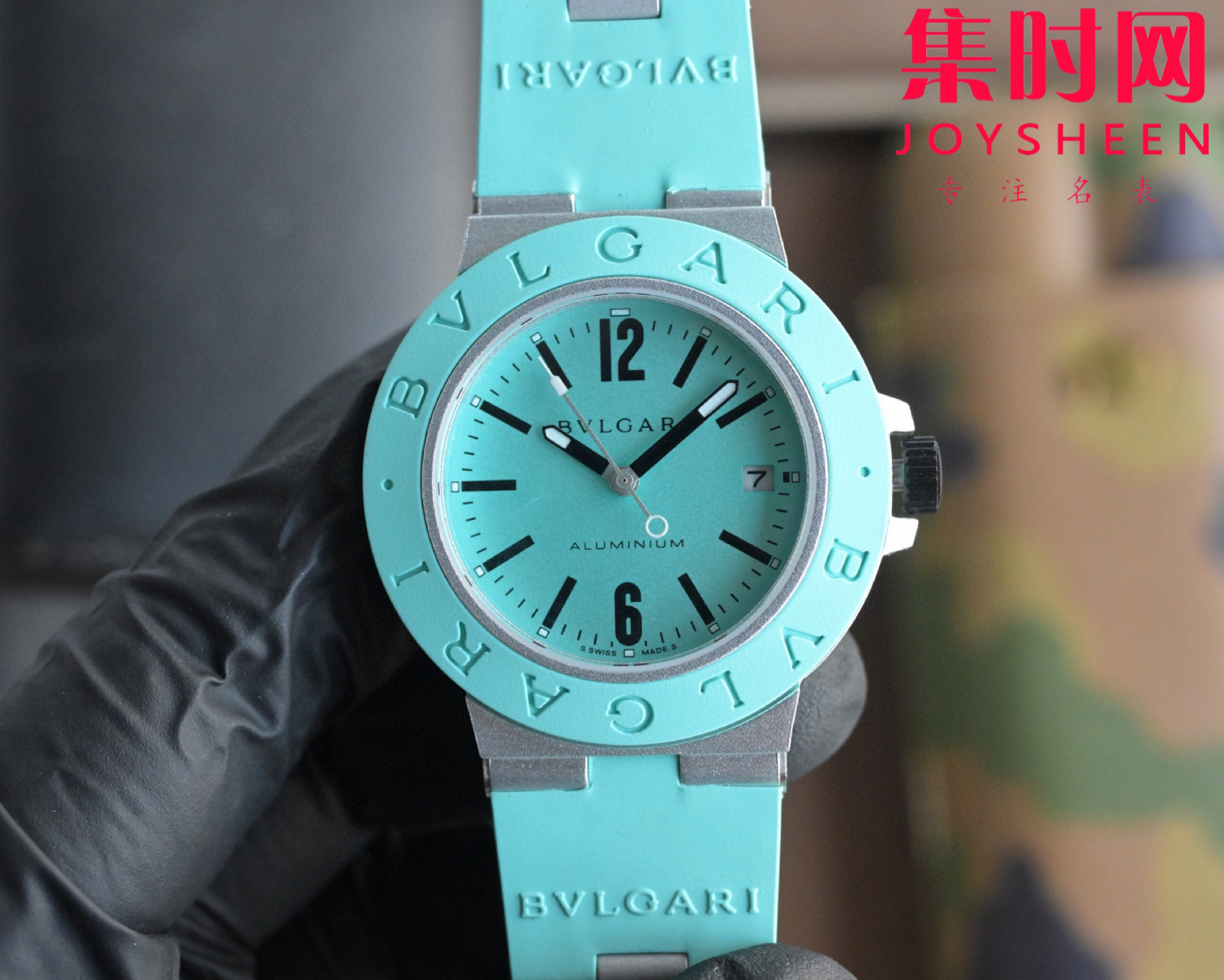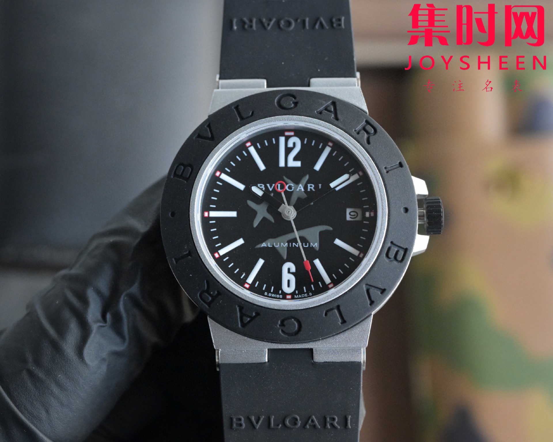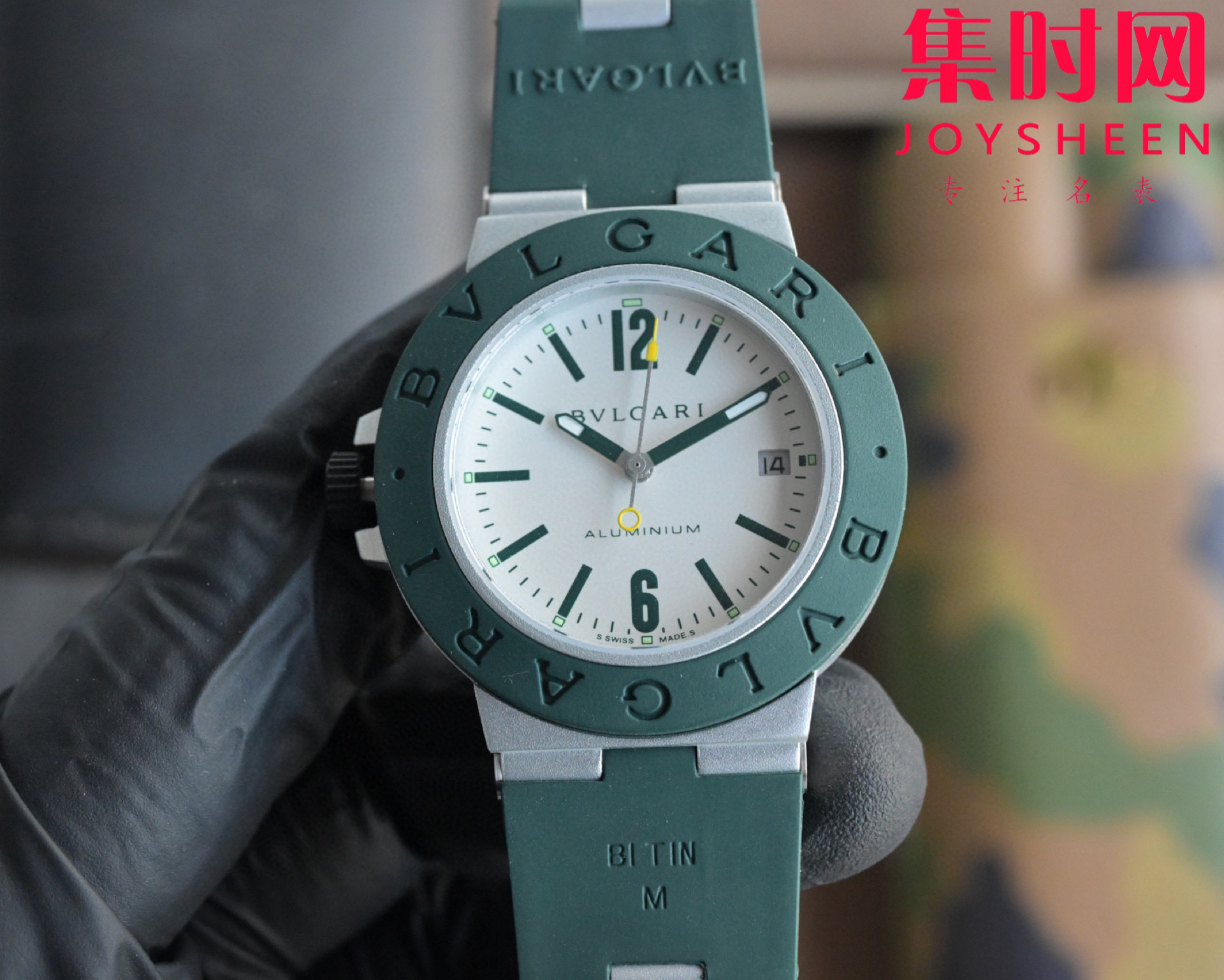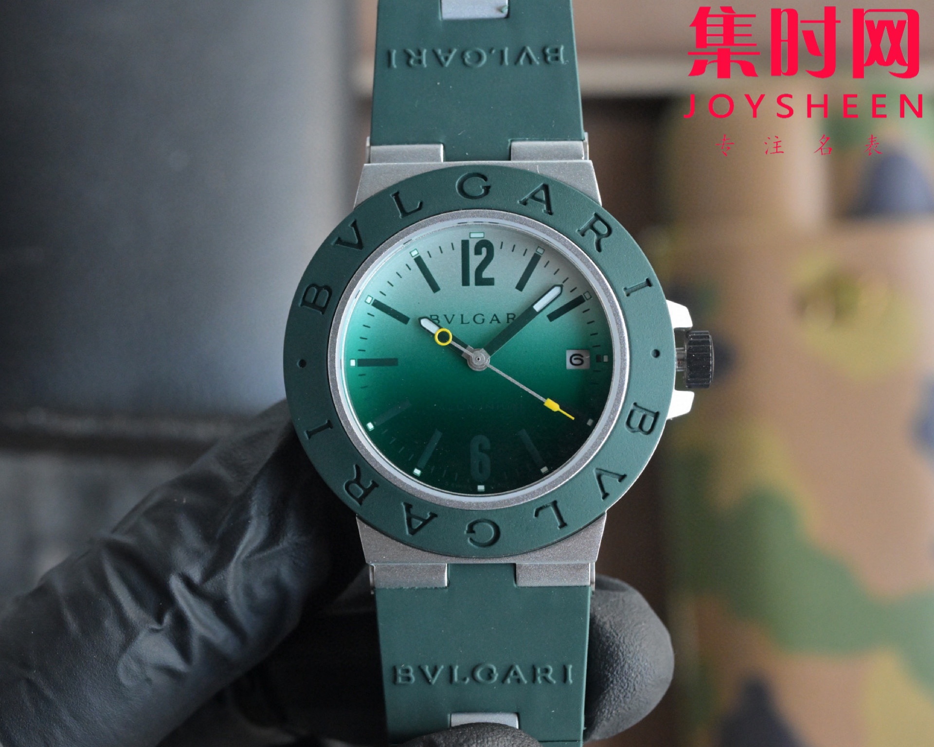 搭载定制全自动机械机芯,表帶采用麾术貼,适配日常、休闲等多元场景。表壳为哑光喷砂铝合金(轻盈耐用),表圈与表带采用FKM橡胶(抗汗耐磨),表背为DLC涂层钛金属(提升抗划性)。指针与刻度覆有Super-LumiNova夜光涂层,中央计时秒针尖端饰红色细节,4点半位置设日期视窗,藍宝石玻璃鏡片,防水100米。延续系列标志性的"BVLGARI BVLGARI"表圈设计,兼具意式优雅与运动质感,是宝格丽创新材质与经典设计结合的代表作品之一,兼具佩戴实用性与收藏辨识度。