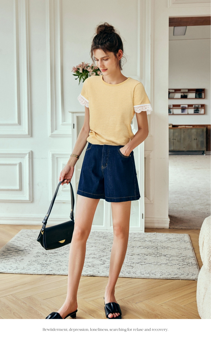 OLrain欧芮儿条纹蕾丝花边短袖T恤女夏季2025新款黄色小个子上衣