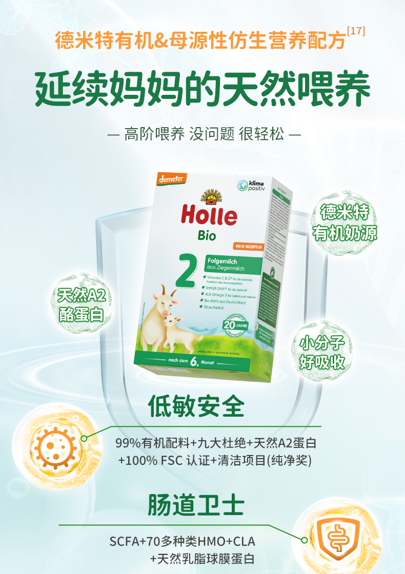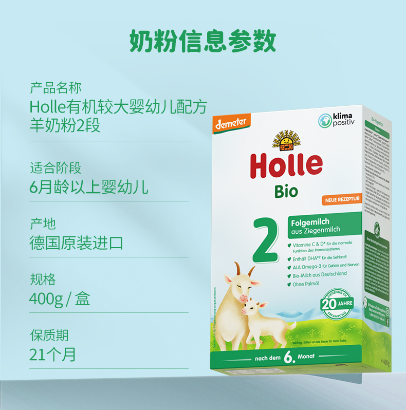 Holle(泓乐)有机婴儿配方羊奶粉2段400g/盒 添加DHA德国原装进口 好吸收 适用于6个月以上宝宝 效期到2027-2-8 含税价(未税价:228元/盒)