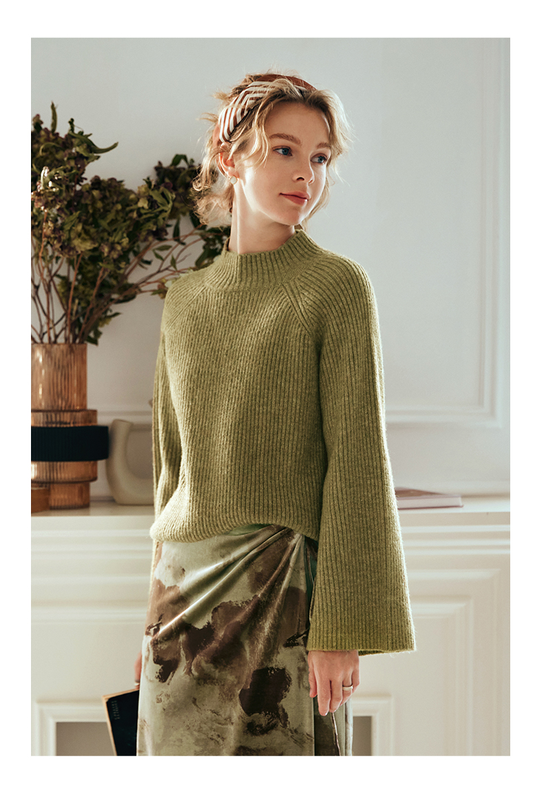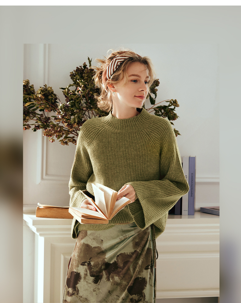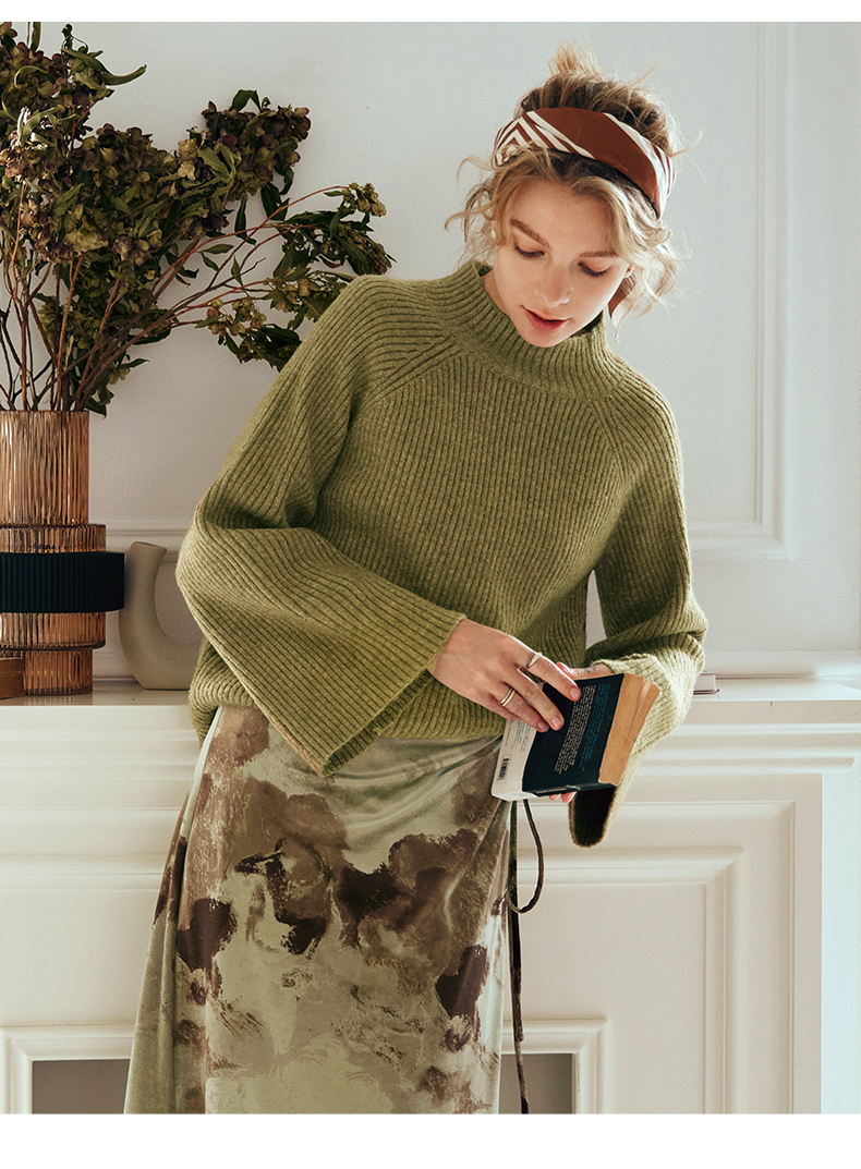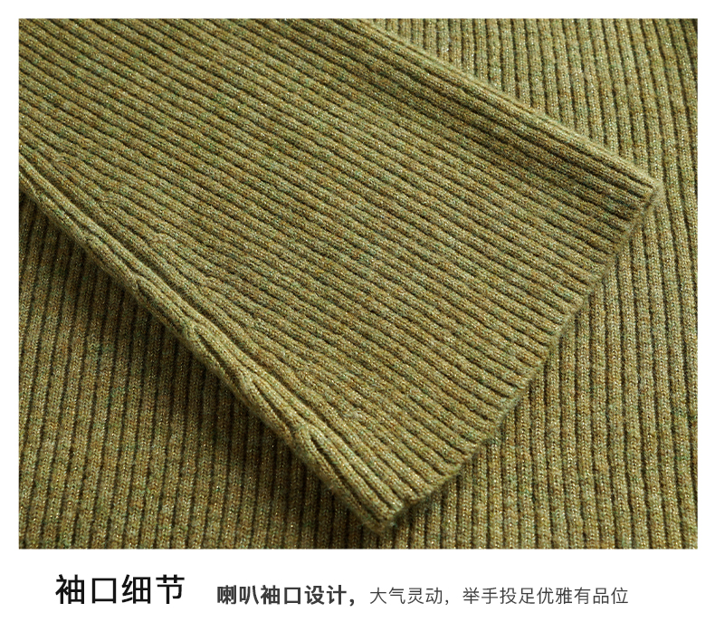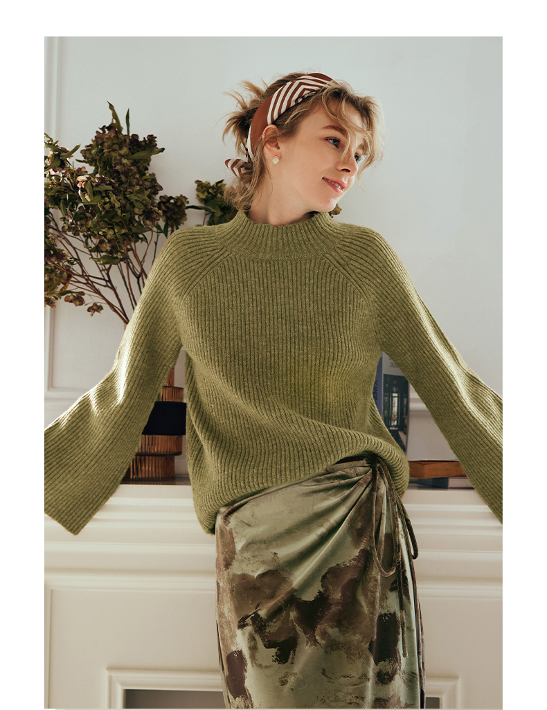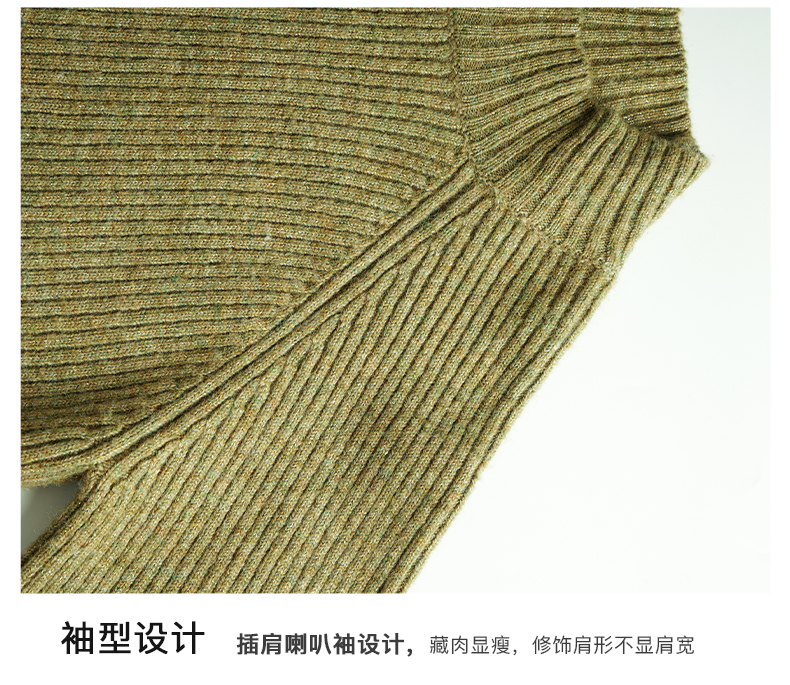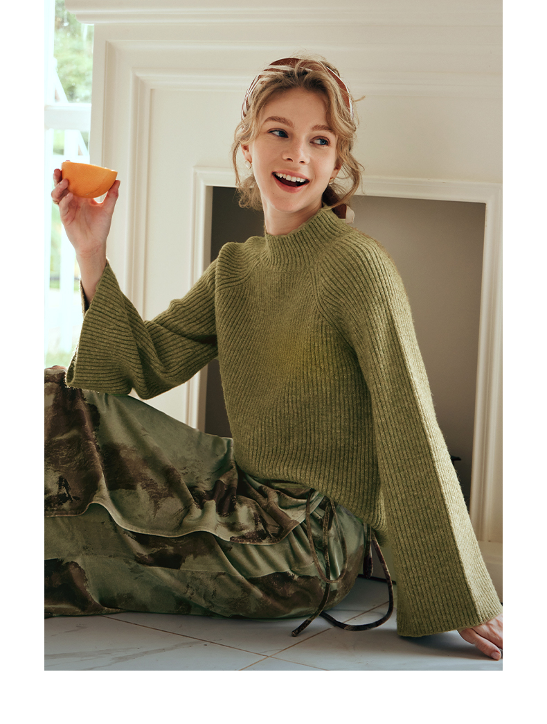 OLrain欧芮儿橄榄绿毛衣女秋冬2023年新款喇叭袖针织保暖套头衫