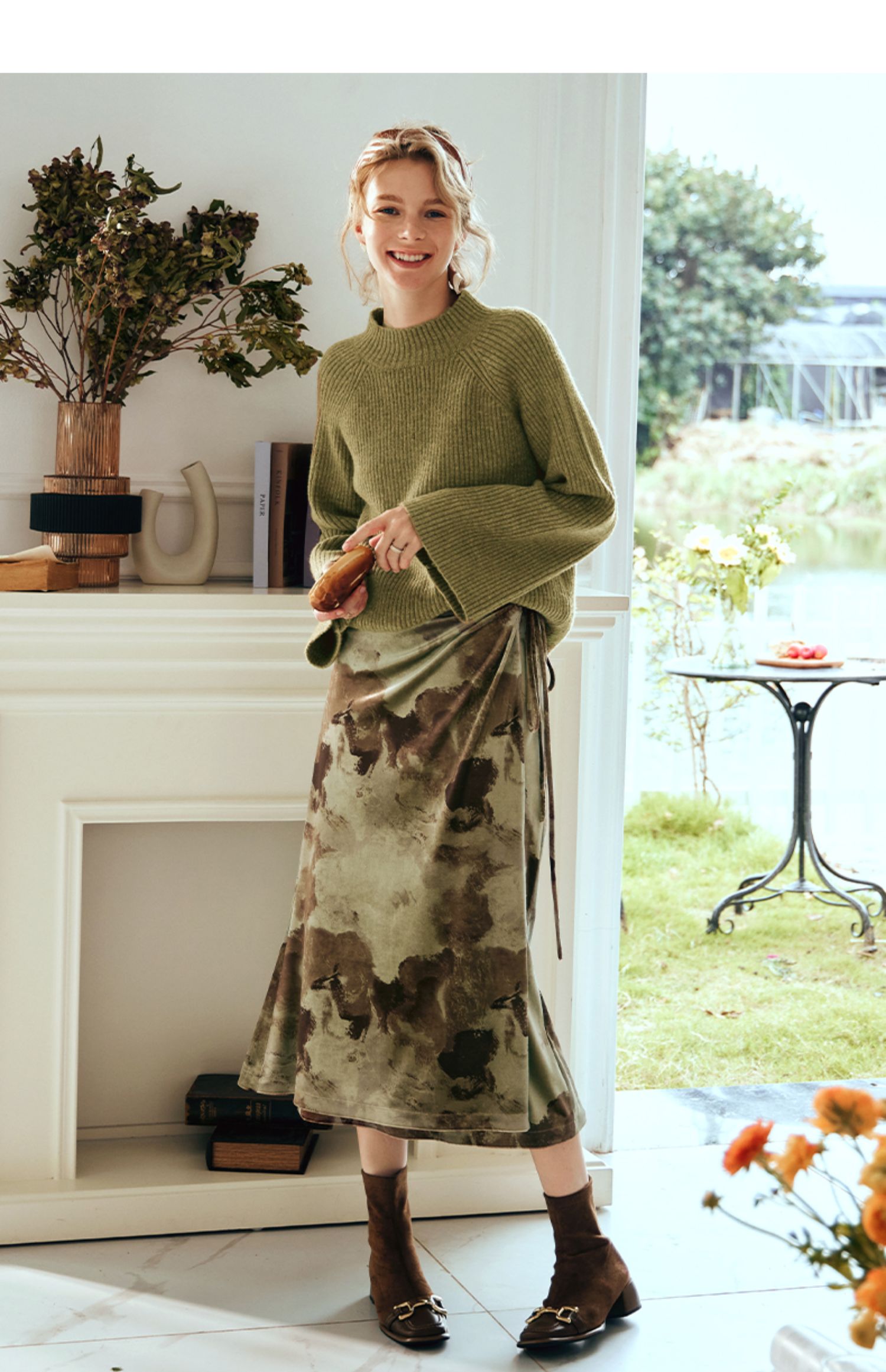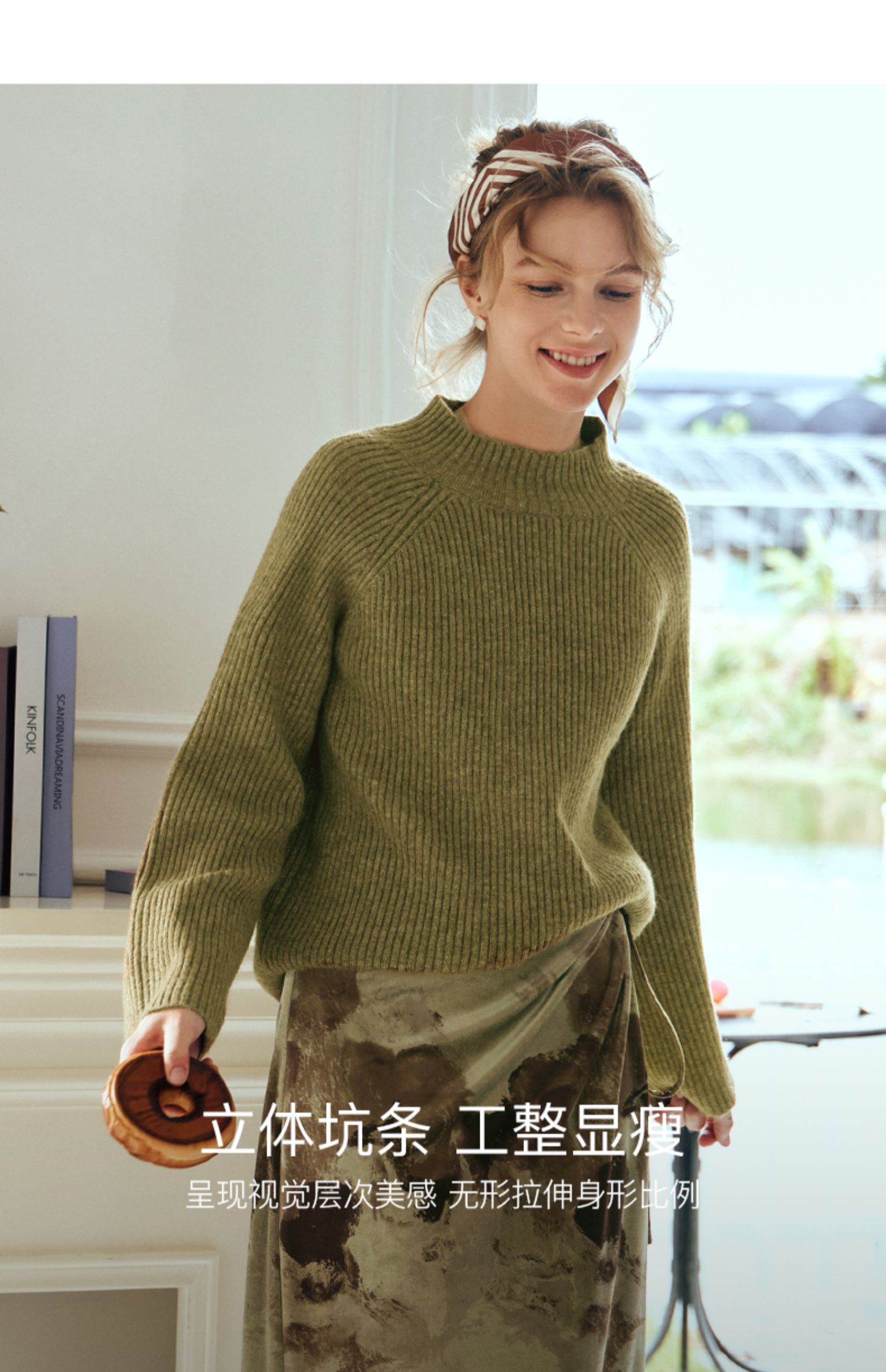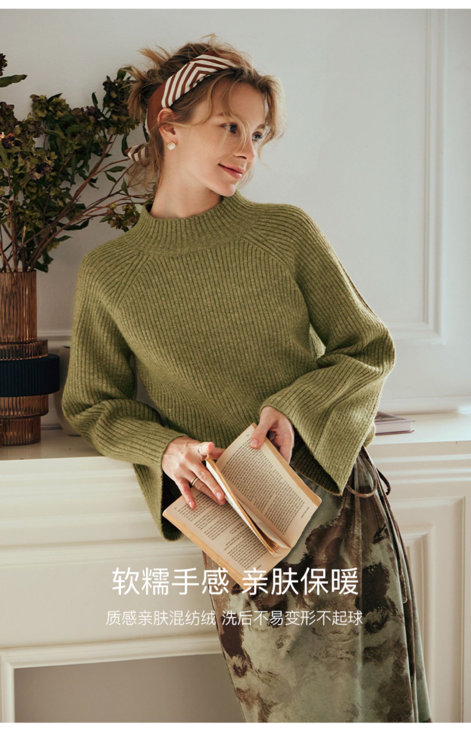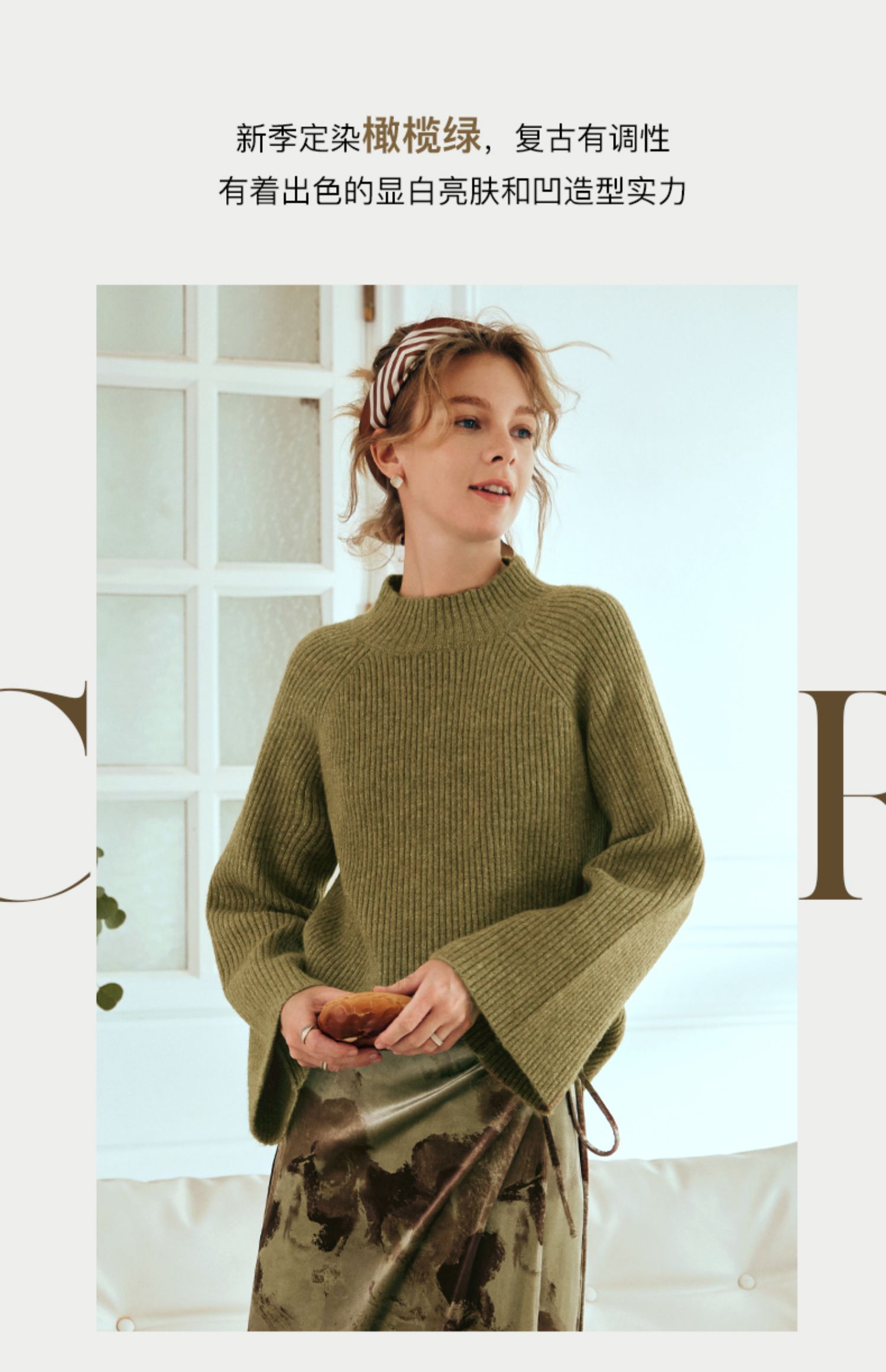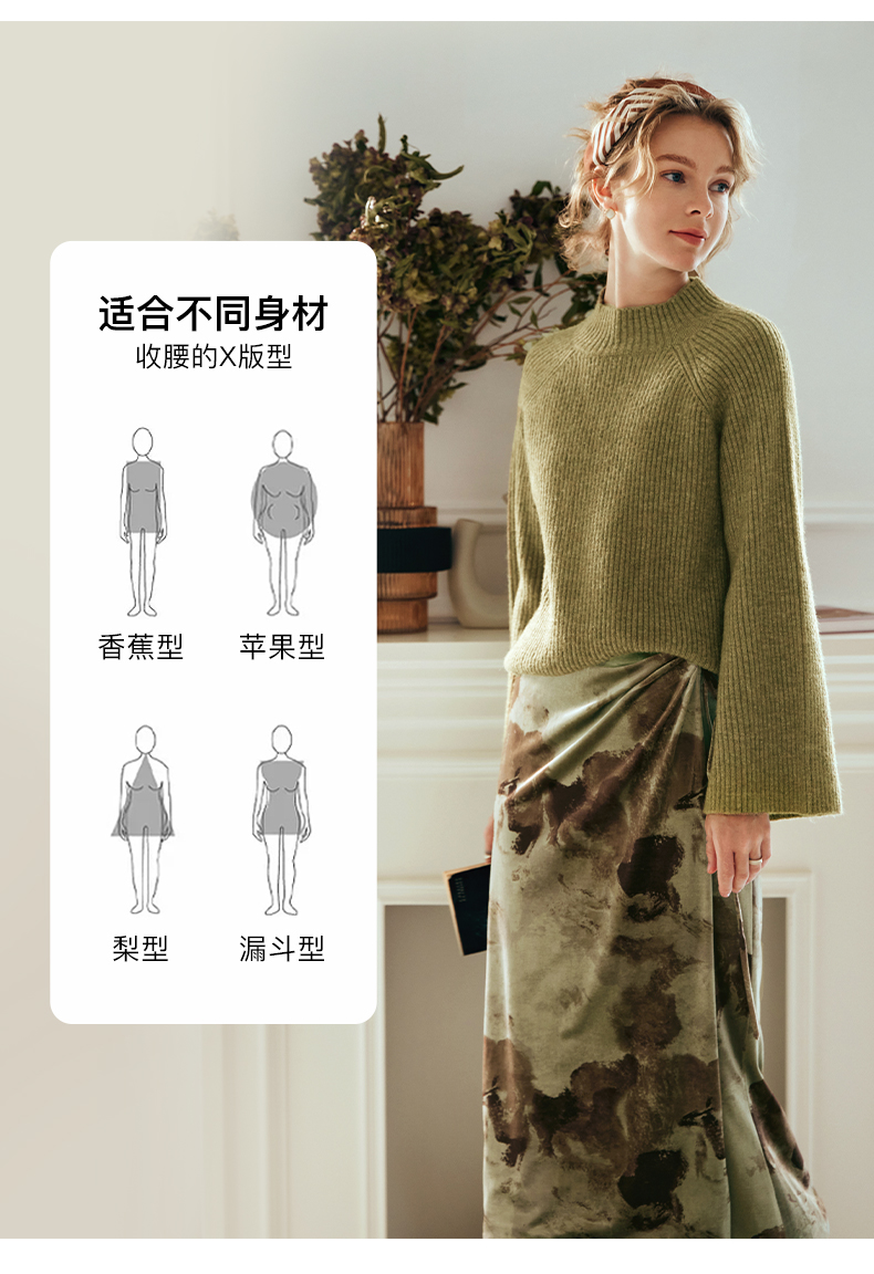 OLrain欧芮儿橄榄绿毛衣女秋冬2023年新款喇叭袖针织保暖套头衫