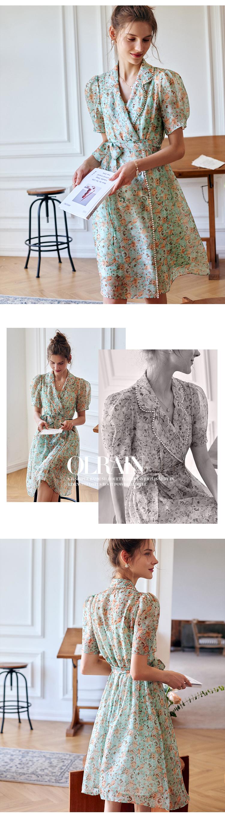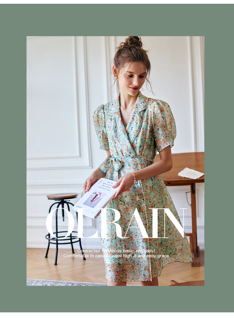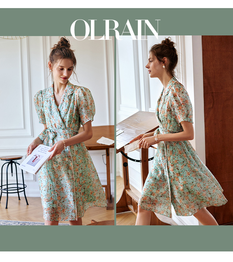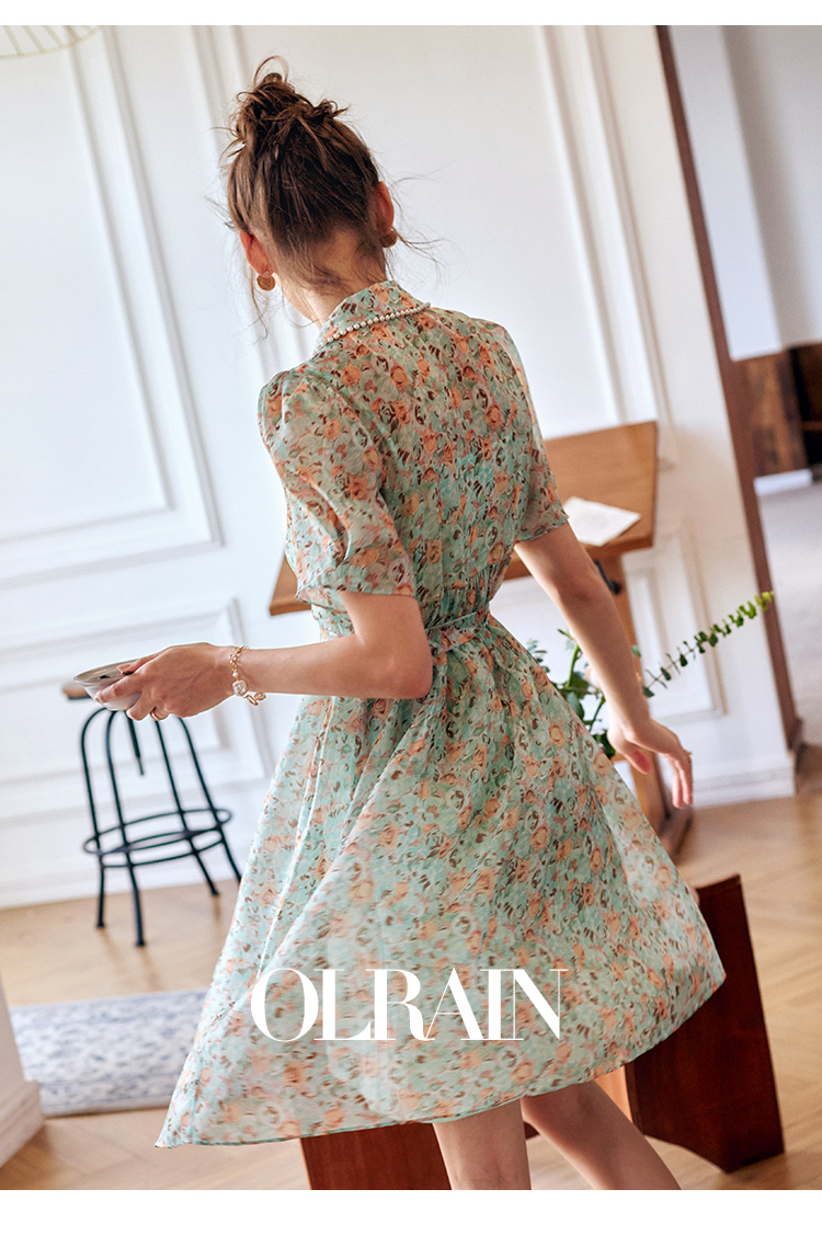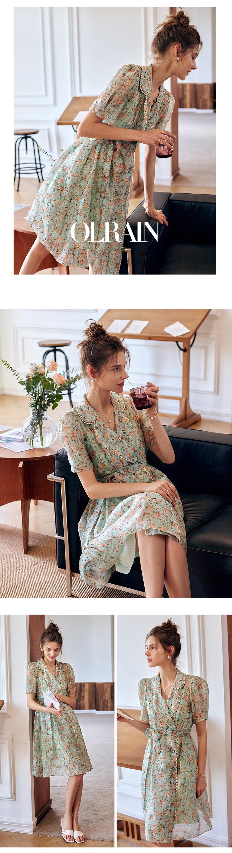 欧芮儿碎花连衣裙2021夏收腰显瘦法式复古温柔风西装领系带钉珠裙