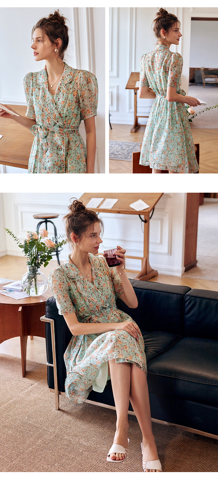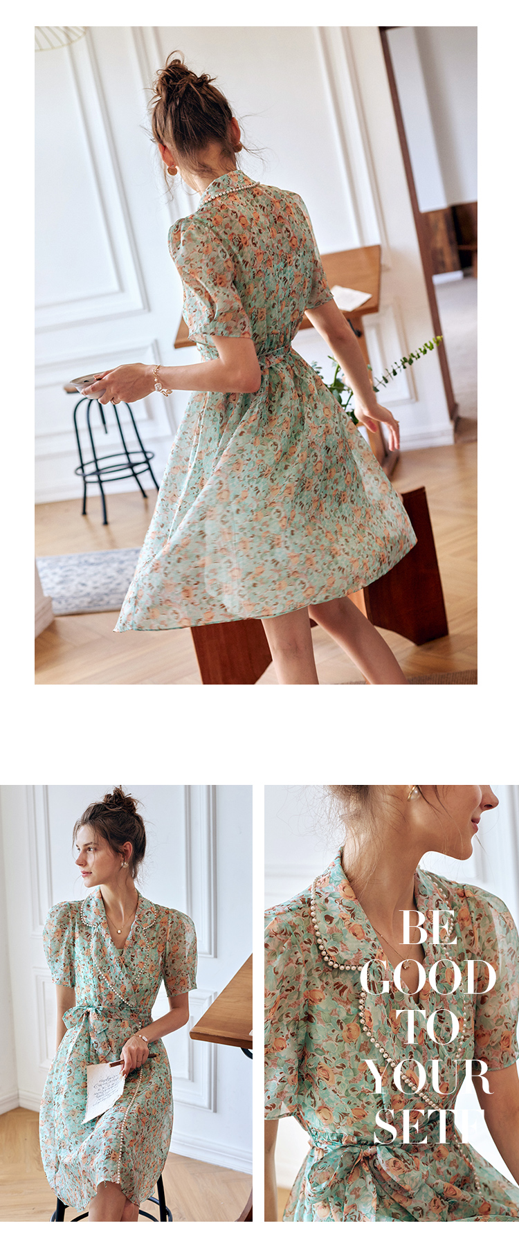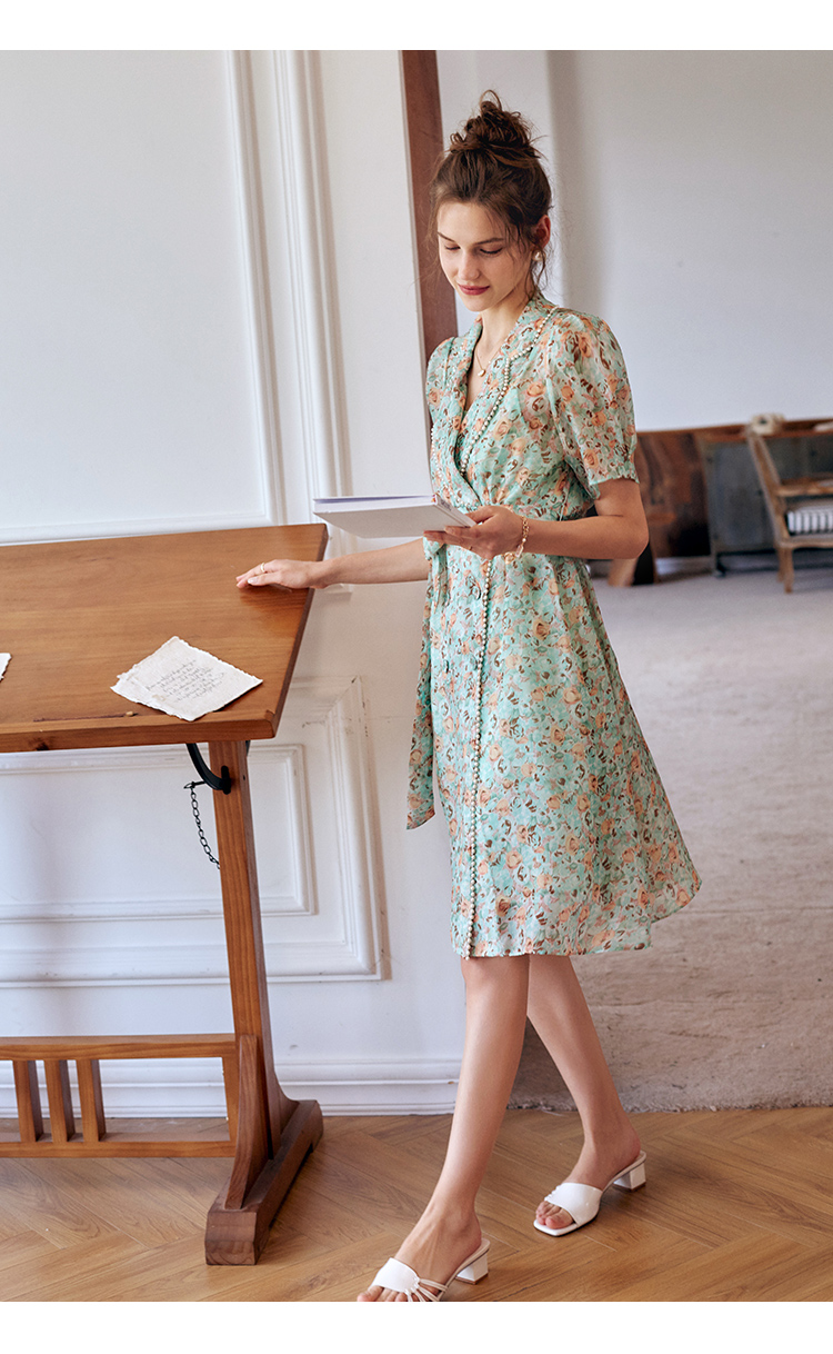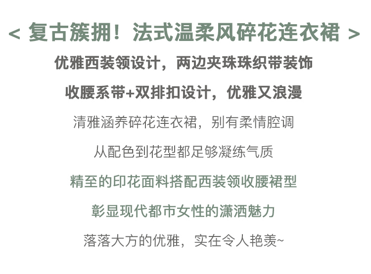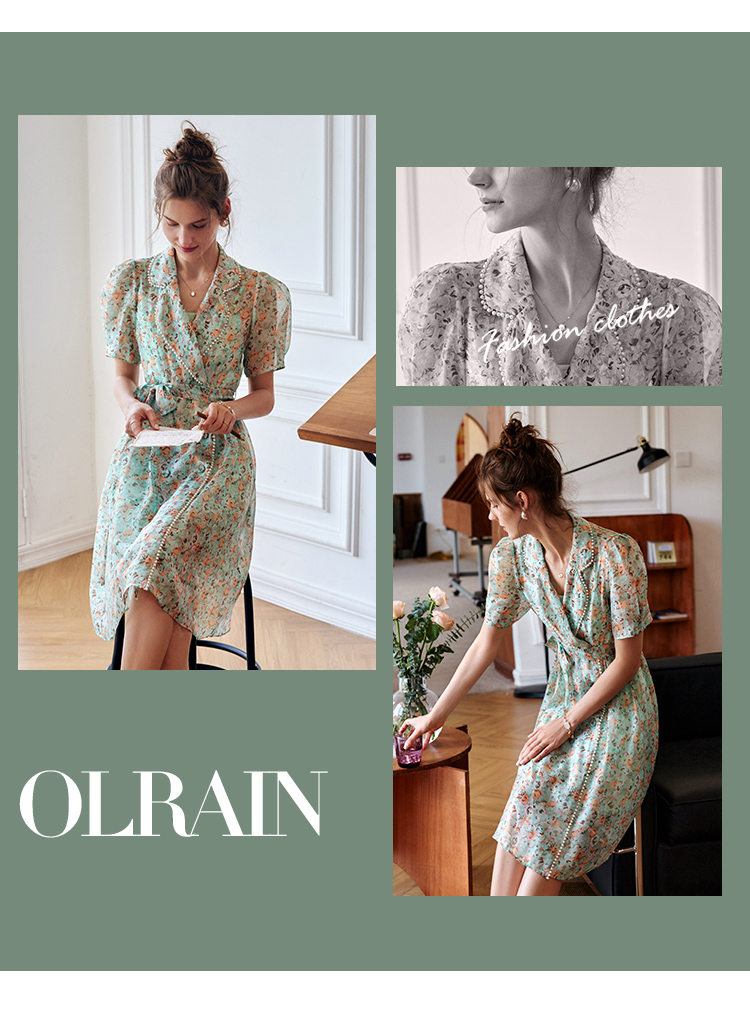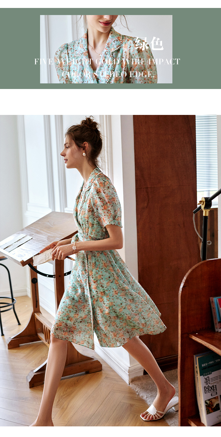 欧芮儿碎花连衣裙2021夏收腰显瘦法式复古温柔风西装领系带钉珠裙