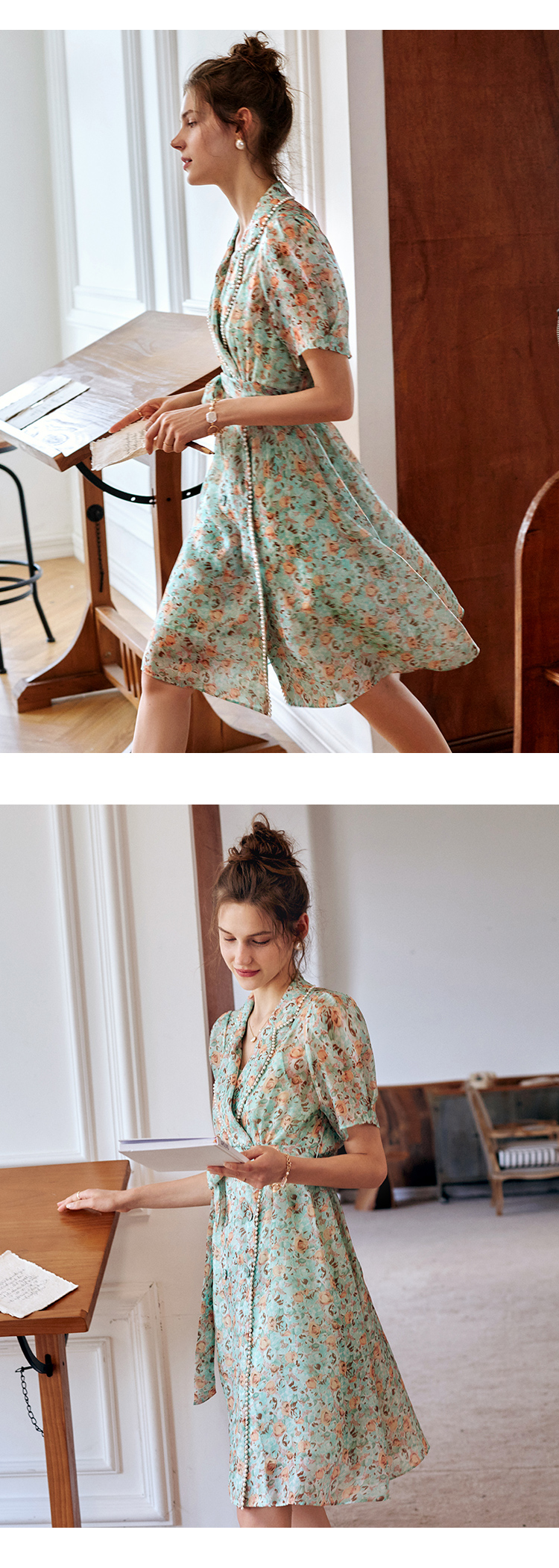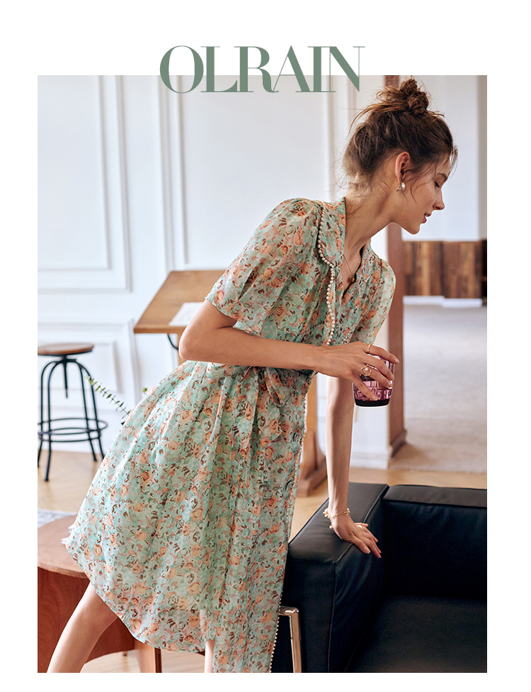 欧芮儿碎花雪纺连衣裙2021春夏新款蕾丝拼接复古提花高腰收腰裙子