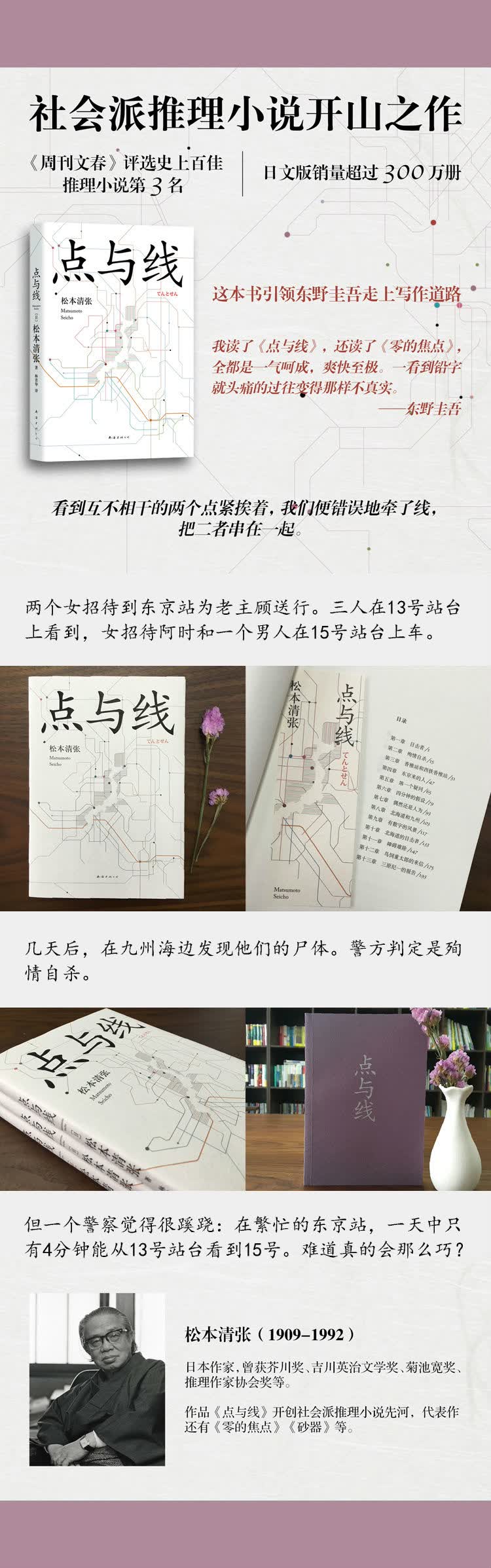 《点与线》是社会派推理小说开山之作,日本文坛巨匠松本清张的名作,被《周刊文春》评选为史上百佳推理小说第3名,日文版销量超过300万册。《点与线》及其引发的社会派风潮,构成了世界推理小说史的一个重要部分。