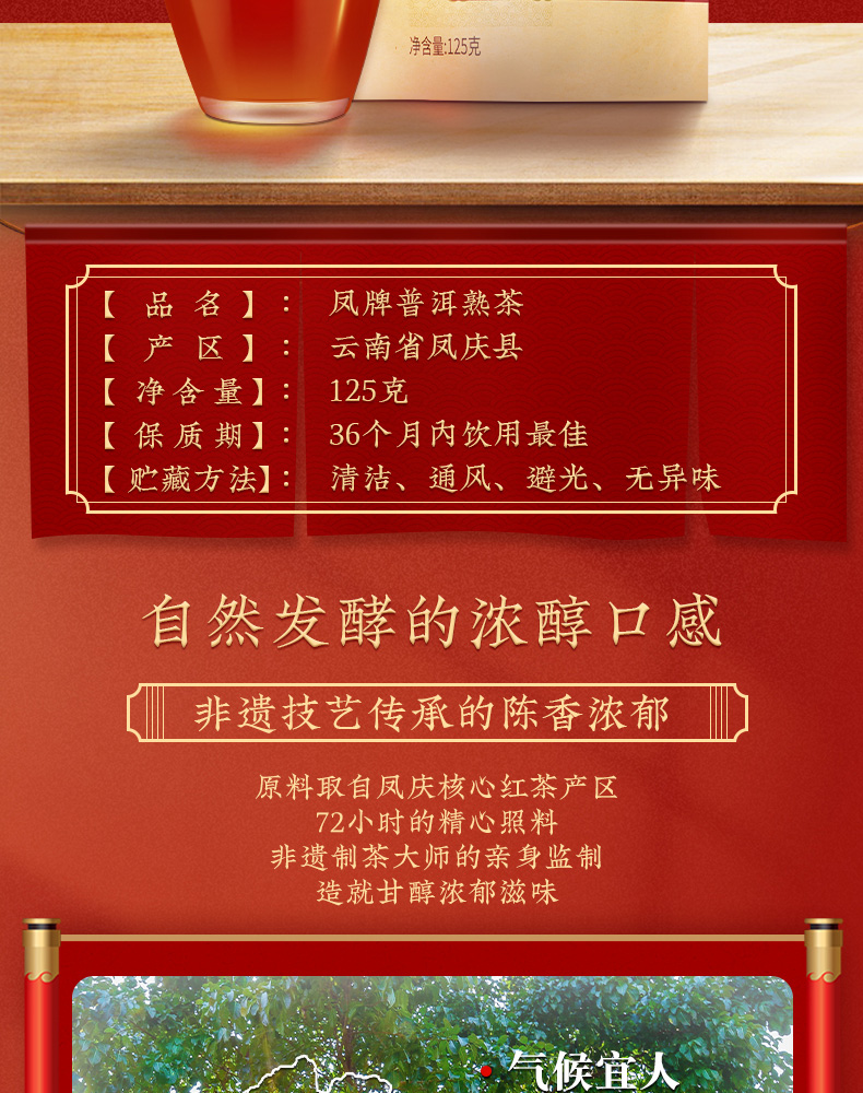 精选集团高海拔云南大叶种晒青茶为原料,应用渥堆发酵等传统普洱茶工艺精制加工而成。外形条索紧实,柔软有韧性。汤色红浓明亮,滋味醇和,香气纯正,叶底褐红欠匀。